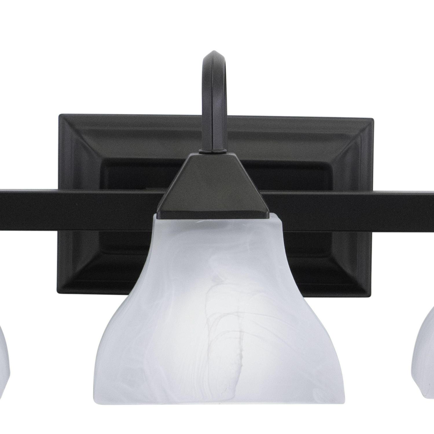 The Cardiff vanity collection features an oil burnished bronze finish with square white alabaster glass shades. The linear details, square shades, and simple form are reminiscent of an updated Mission style.
