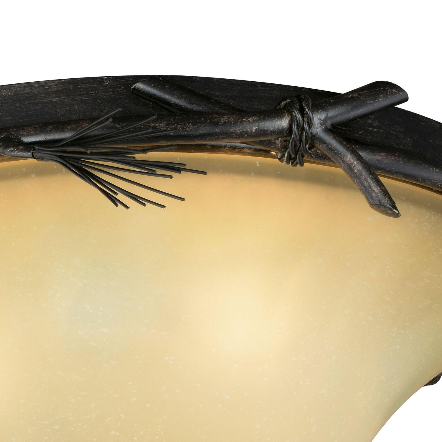 The Sierra collection combines rustic and classic styling that brings nature indoors. This fixture features black walnut finish and frosted scavo glass, with twisted wire rope and pine tree elements. It is a great choice for a vacation lodge, cabin or a suburban home and it will complement a variety of home decors. This flush mount ceiling light is ideal for hallways, living rooms, bedrooms, entryways or utility rooms.