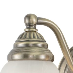 A simple yet sophisticated design is fitting in the traditionally styled Standford collection. It features an antique brass finish with white alabaster glass shades. Create a distinguished yet classic look by combining pieces from this extensive series of fixtures. Versatile reversible mounting option lets you install this fixture up or down. This bathroom light is perfect over small vanities or as a pair over double sinks.