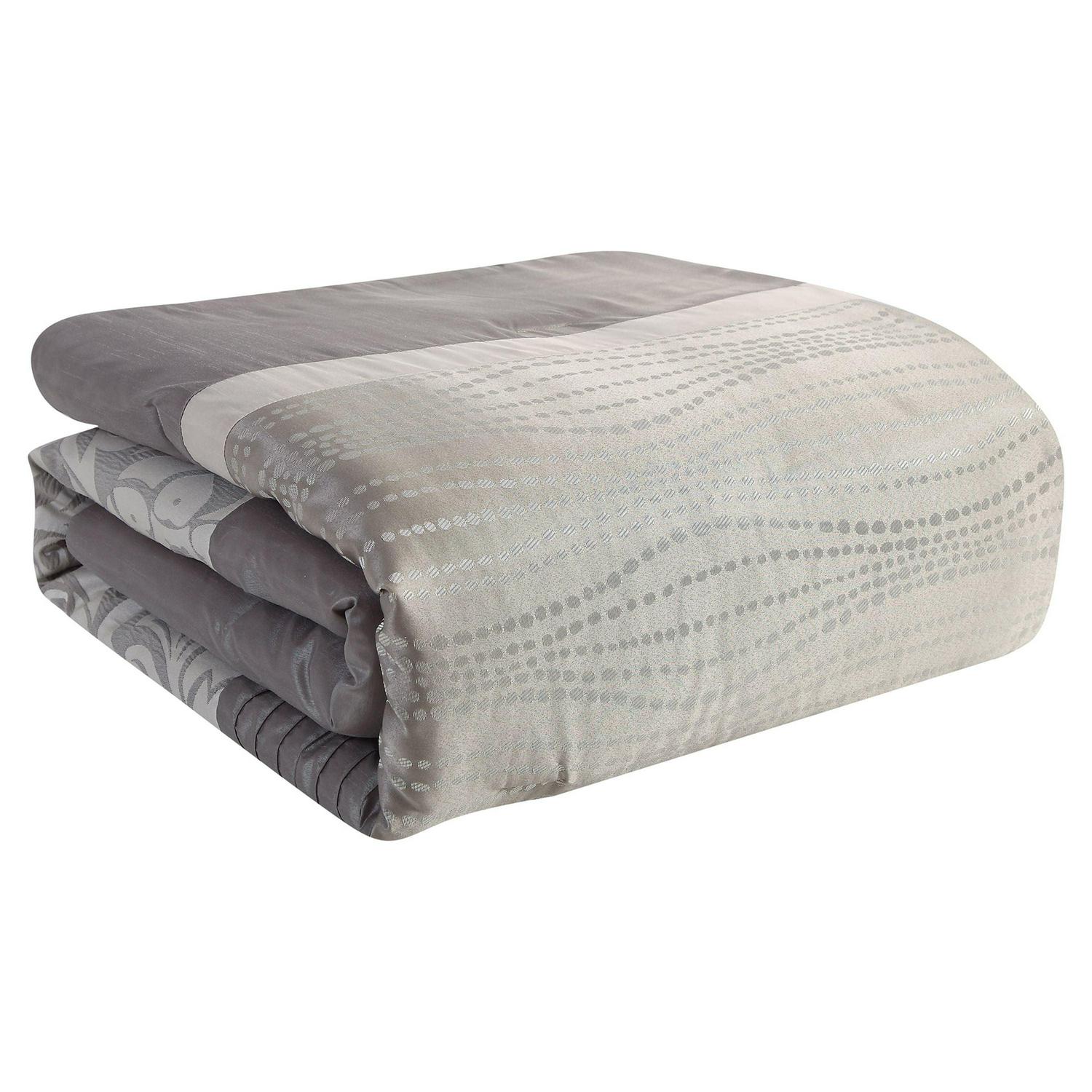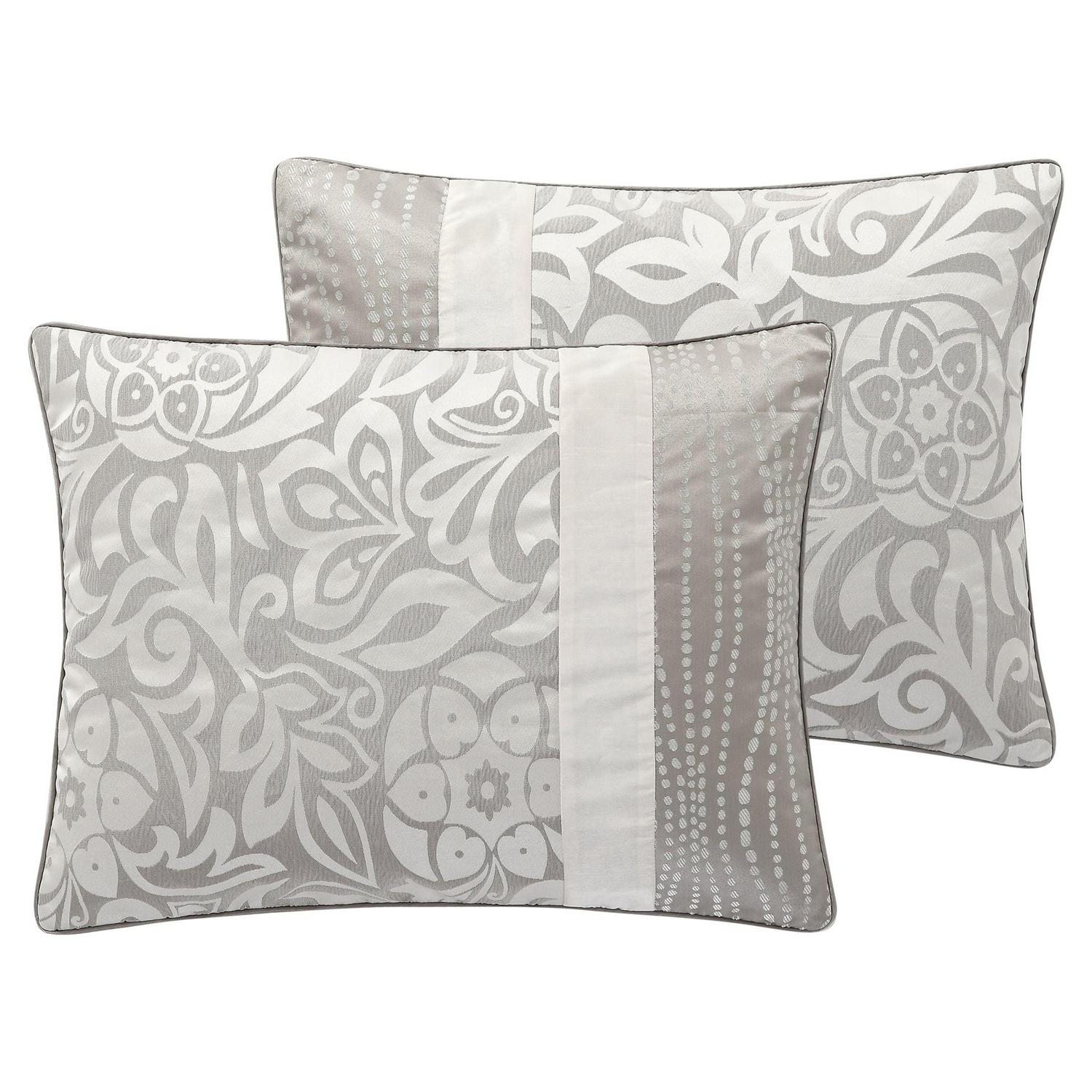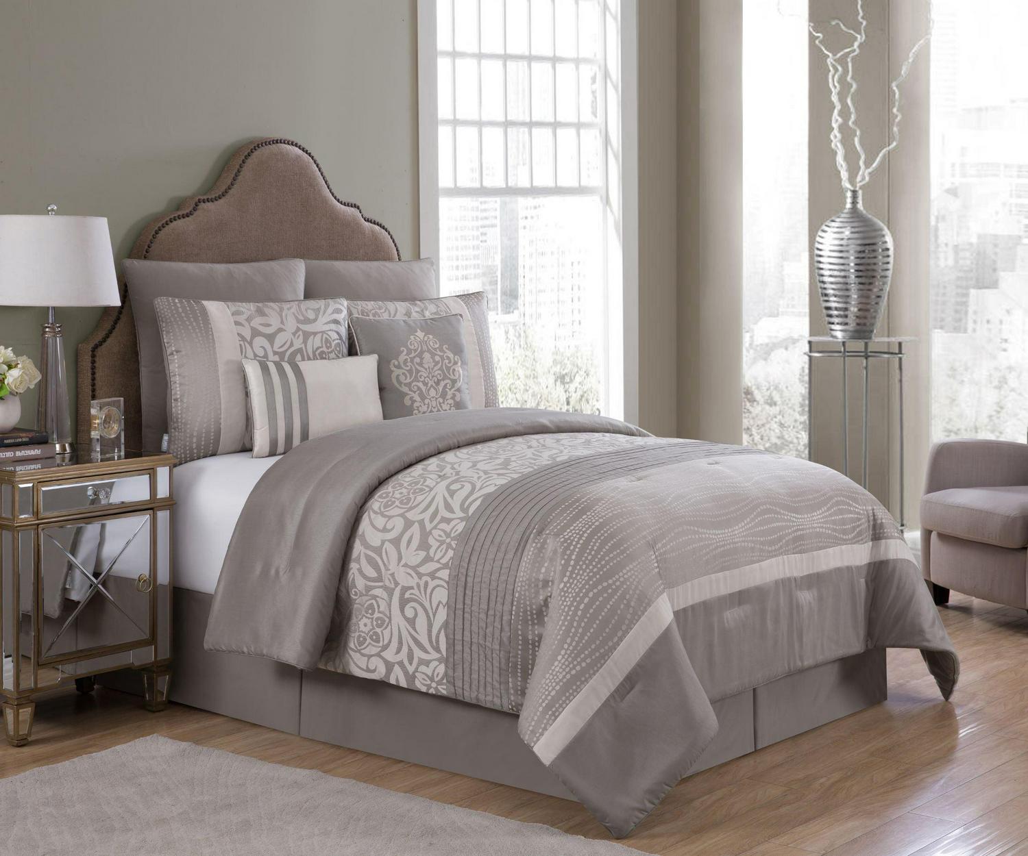 Instantly elevate your bedroom décor with the VCNY Home Arcadia 8-Piece Floral Embroidered Rushed Bedding Comforter Set. A stunning addition to your master bedroom or guest bedroom, this sophisticated taupe bed set combines floral designs, abstract patterns, and pleated and embroidered accents on soft fabric with a lustrous sheen. This 8-piece bed set includes a comforter, shams, Euro shams, two decorative pillows, and a coordinating bed skirt to complete the look. This soft polyester comforter set is machine washable. You can keep the set looking and feeling fresh by machine washing in cold water and drying on low setting. Decorative pillows are spot clean only.