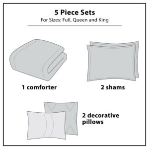 – King set includes: 1 comforter (104 inches x 90 inches), 2 shams (20 inches x 36 inches), 2 decorative pillows (18 inches x 18 inches, 12 inches x 18 inches)