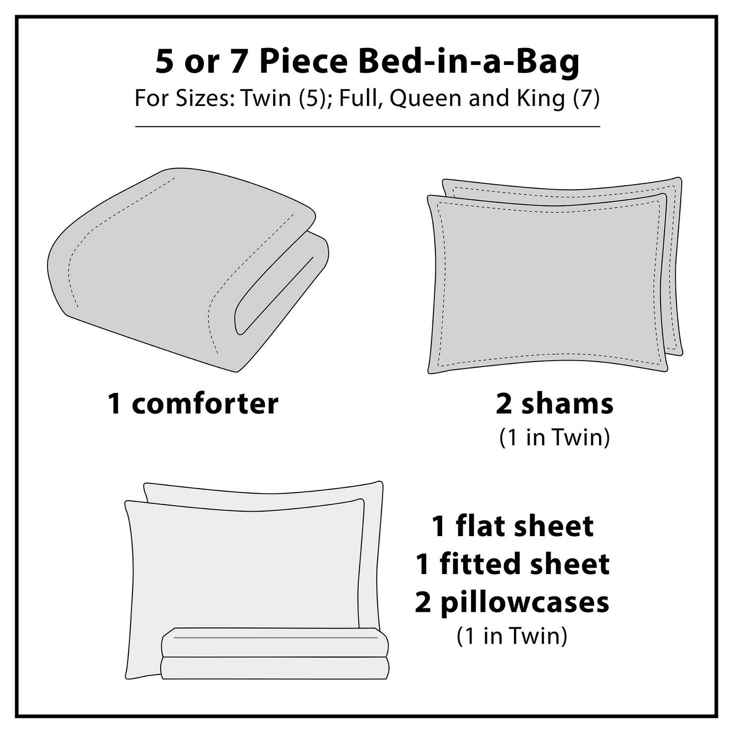 - Items Included: Comforter, Shams, Pillowcases, Fitted Sheet, Flat Sheet