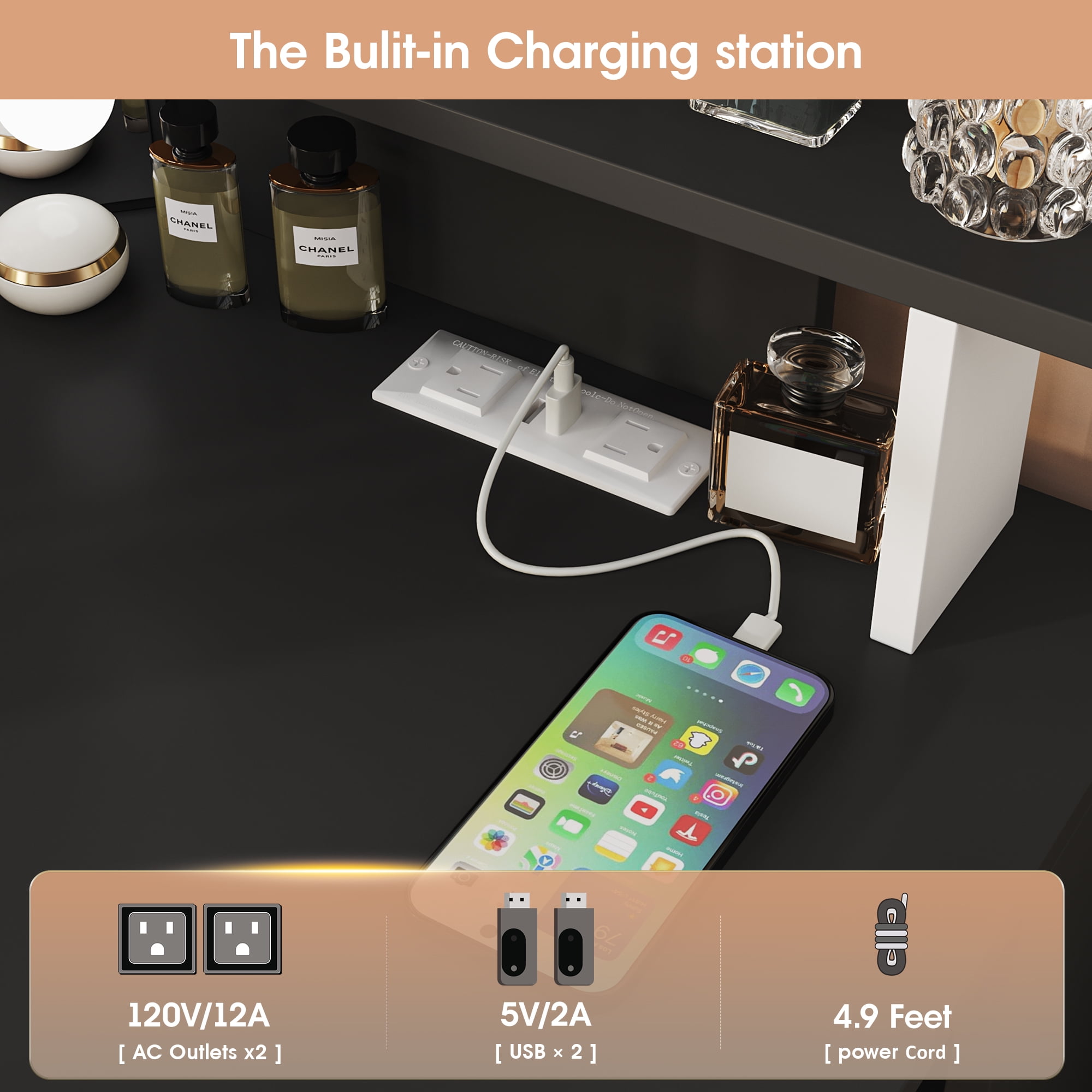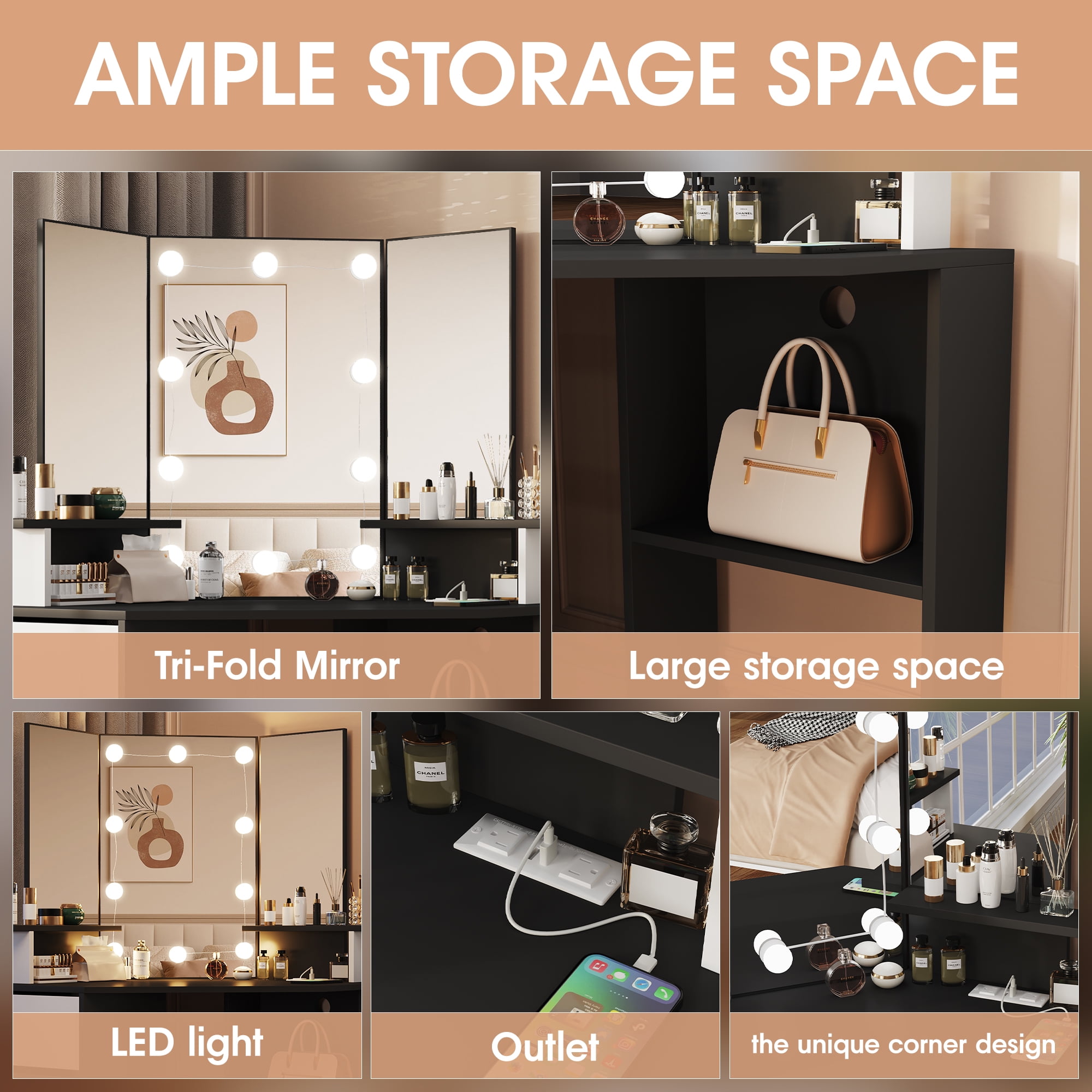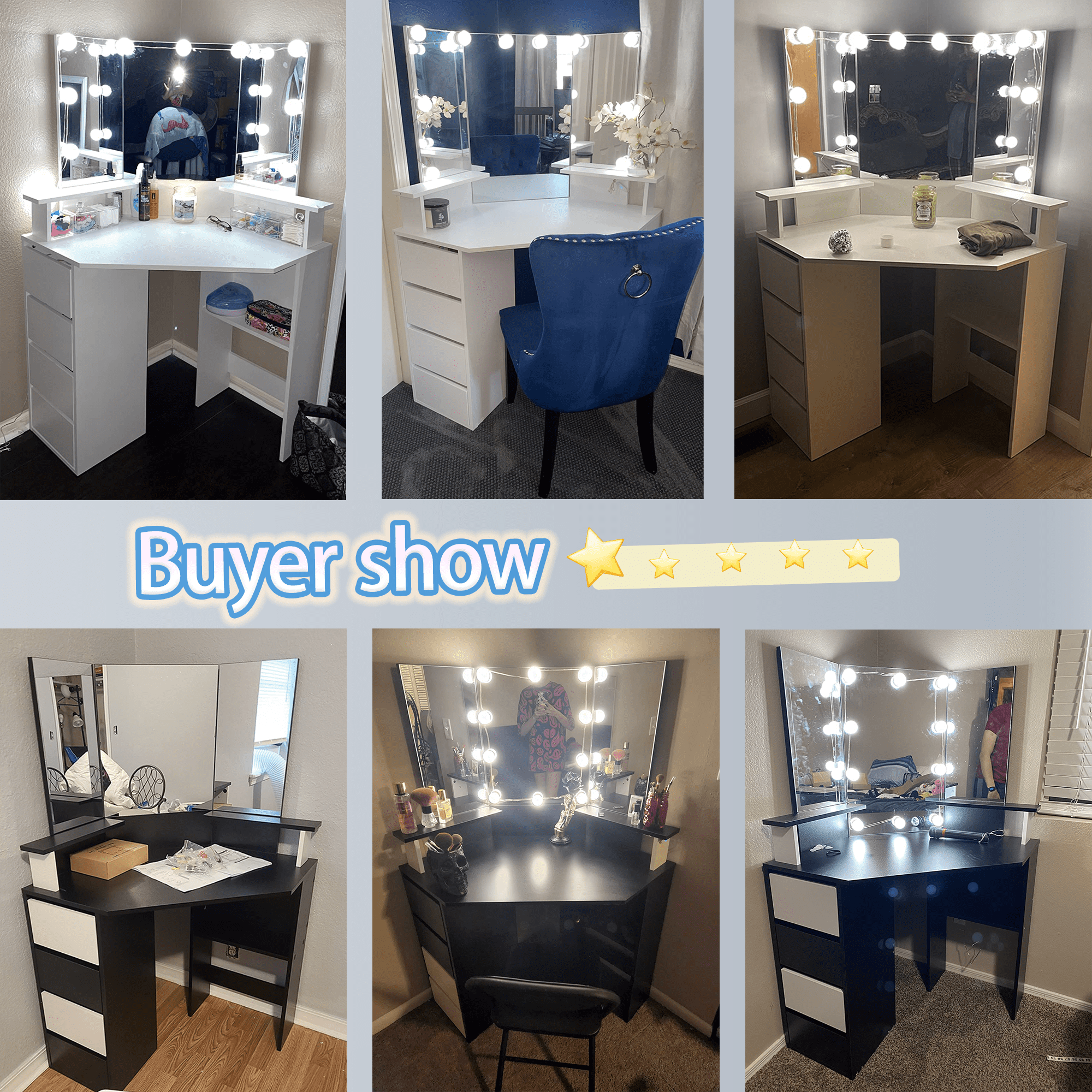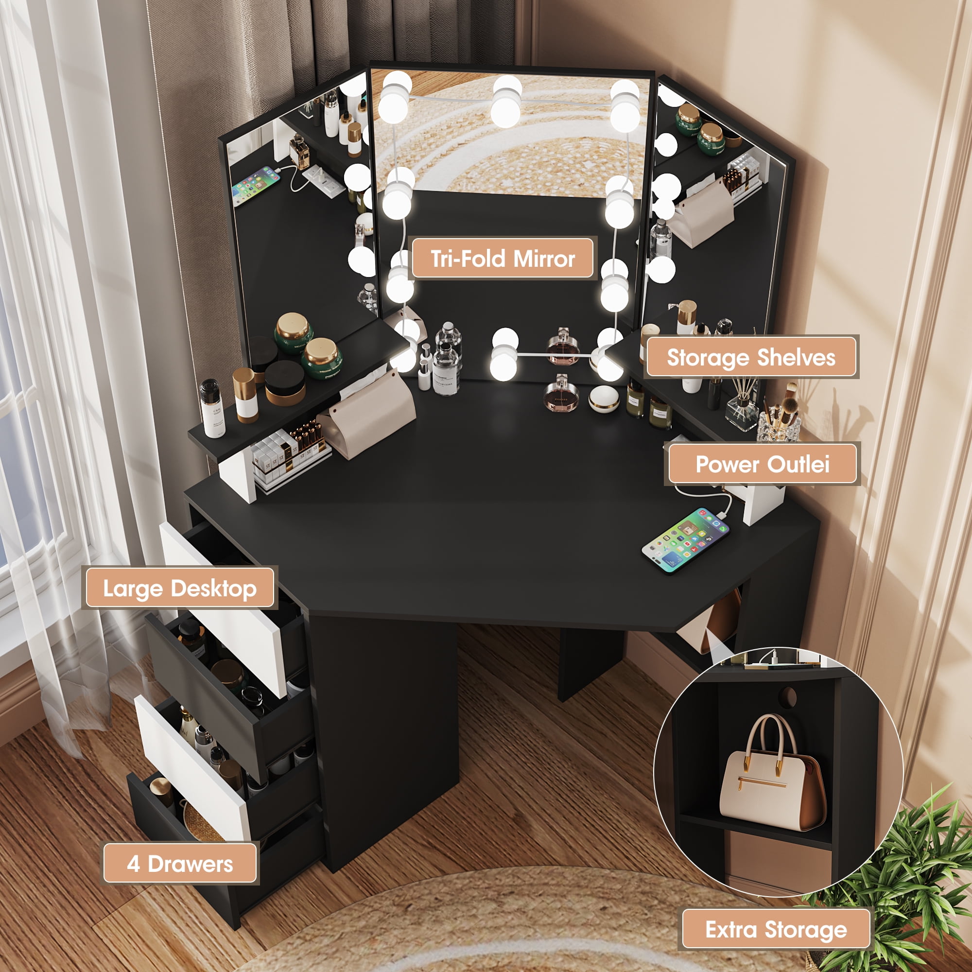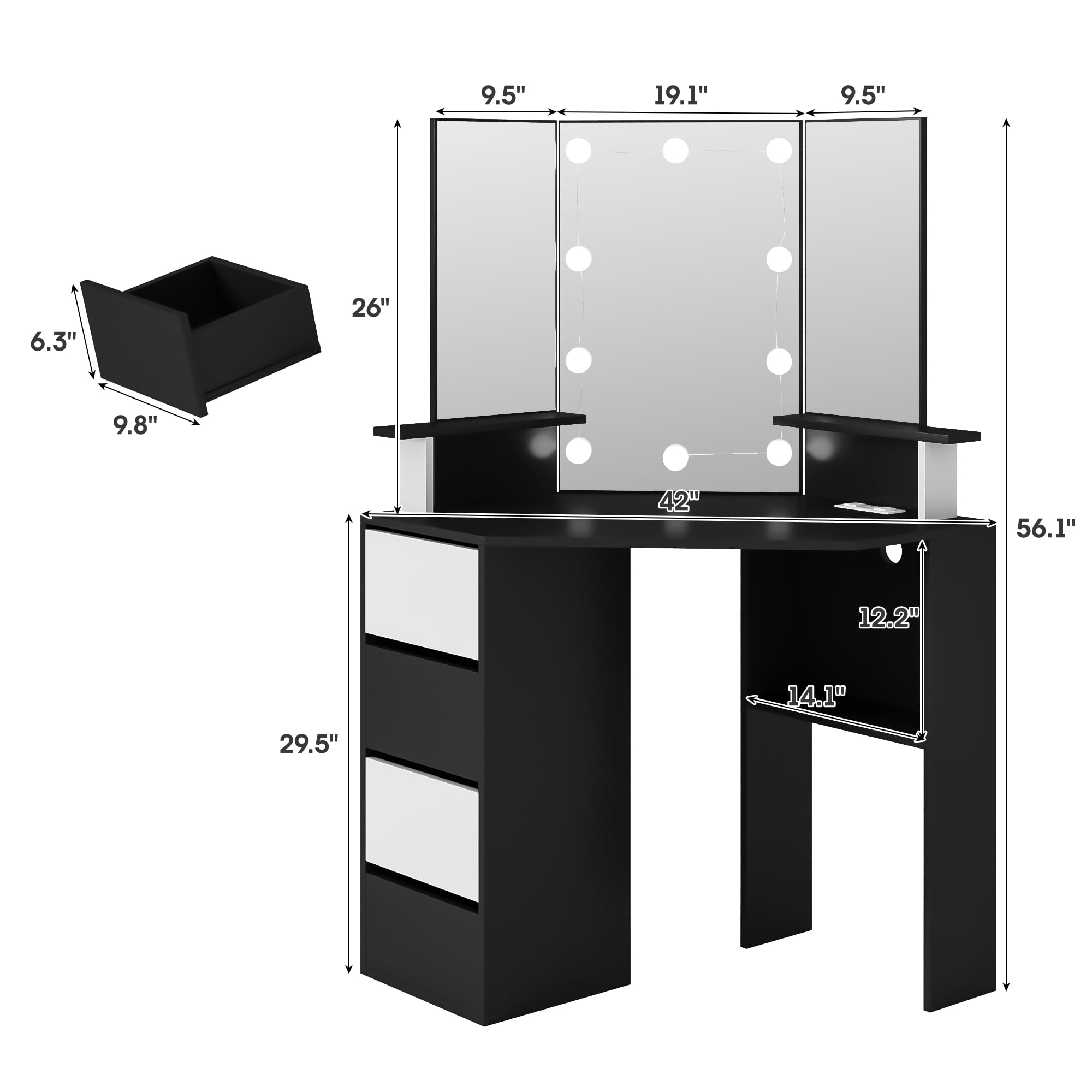 Features: Upgrade design with buit-in power strip Corner makeup table fit snugly in the corner of the bedroom or bathroom, saving space and creating a corner 3-panel mirrors allow you to observe yourself from multiple angles when making up 10 LED light bulbs with adjustable brightness 3 color lighting modes to choose from: Cold White, Warm White, Warm Yellow. 4 larger drawers Perfect for your bedroom Color: White/Black Material: High quality Particleboard Vanity Table Size: 42× 19 × 56 inch Large Mirror Size: 19.1× 26.0 inch Side Mirror Size: 9.5 × 20.3 inch Package Includes: 1 x Vanity Table 10 × LED Bulbs 1 x Power Strip 1 x Accessories 1 x Instruction Upgrade design with buit-in power strip|Corner makeup table fit snugly in the corner of the bedroom or bathroom, saving space and creating a corner|3-panel mirrors allow you to observe yourself from multiple angles when making up|10 LED light bulbs with adjustable brightness|3 color lighting modes to choose from: Cold White, Warm White, Warm Yellow.|4 larger drawers 【Built-in Charge Station Upgrade design】This makeup table equipped with a power strip that has 2 standard plug sockets and 2 USB ports with a 4.9-foot power cord, convenient for the LED lights, hairdryer, curling iron, and charge your phone, tablet, or other electronics. 【3-Folding Mirror Dresser Table】Our Tri-fold mirror dresser has a unique design style. It features a three-panel mirror with LED light bulbs, which allows you to view yourself from multiple angles while putting on makeup or doing your hair, and the 10 bulbs can provide you plenty of brightness, which can meet your different makeup needs. 【3 Lighting and Adjustable Brightness】 Equipped with 10 LED bulbs with adjustable brightness in 3 colours: cool white, warm white and warm yellow. You can freely adjust the colour temperature and brightness according to the desired look for different environments. 【Large Storage Capacity】Our vanity table set will save you from mess, featuring 2 storage Shelves and 4 storage drawers, even a spacious tabletop, can hold your spray, bottles, lipstick, lotions, photos, decoration & etc, make your bedroom look very neat and elegant. 【Sturdy Practical Material】This makeup desk is made of 15mm particleboard, the table top is smooth and flat looks elegant, non-slip parts are fixed to the bottom of the legs to avoid scratching the floor. Anti-tip Device behind the vanity mirror, you can fix it on the wall for children’s safety. 【Buy with No Risk and Confidence】All pieces are labeled, detailed instructions in the package, make sure the assembly of this vanity simple! If any parts are missing or damaged, we can send them to you quickly, just feel free to contact us.