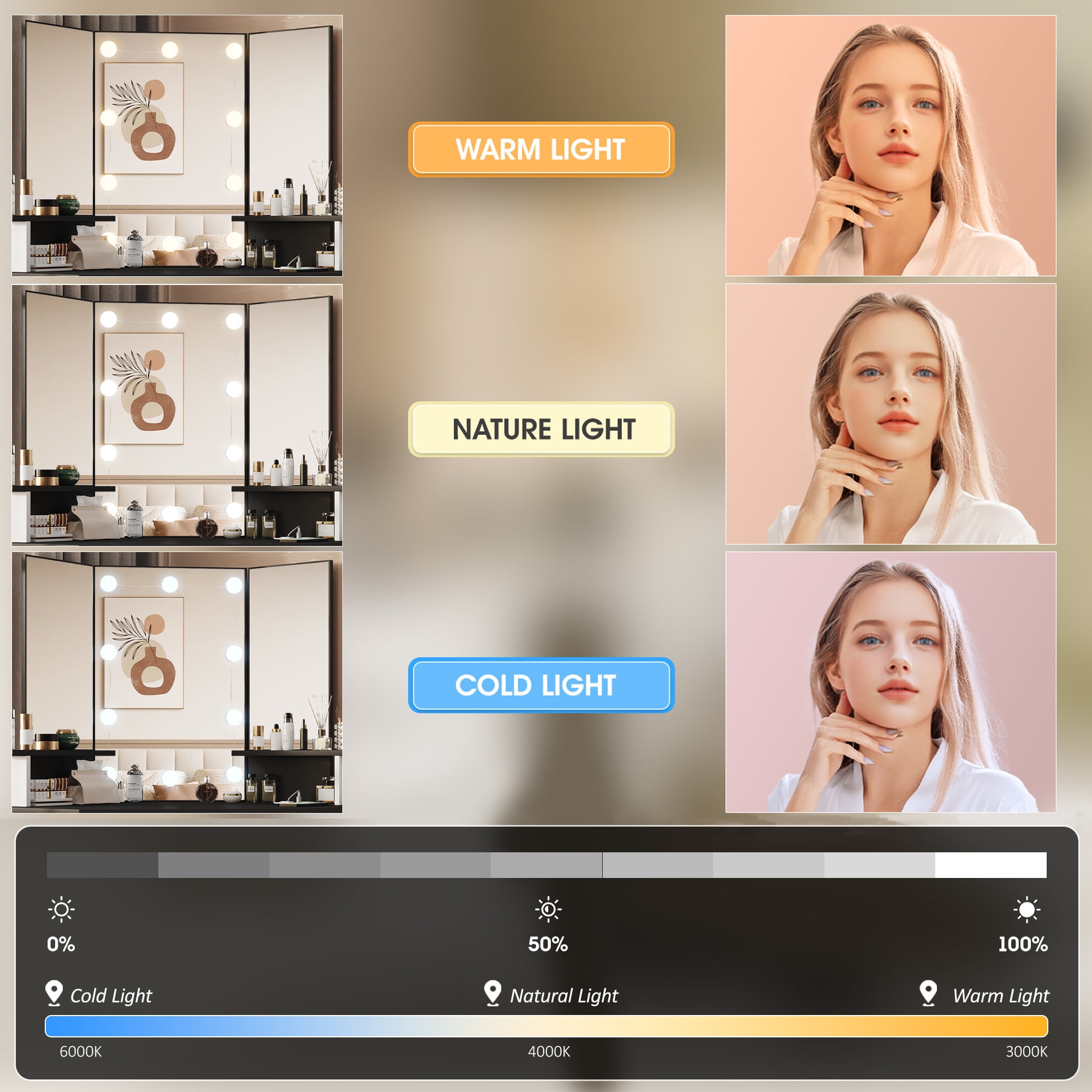 Built-in Charge Station Upgrade design! This makeup table equipped with a power strip that has 2 standard plug sockets and 2 USB ports with a 4.9-foot power cord, convenient for the LED lights, hairdryer, curling iron, and charge your phone, tablet, or other electronics. 3-Folding Mirror Dresser Table: Our Tri-fold mirror dresser has a unique design style. It features a three-panel mirror with LED light bulbs, which allows you to view yourself from multiple angles while putting on makeup or doing your hair, and the 10 bulbs can provide you plenty of brightness, which can meet your different makeup needs. 3 Lighting & Brightness Adjustable: Equipped with 10 LED bulbs that Brightness adjustable, available in 3 colors: cool white, warm white and warm yellow. You can freely adjust the color temperature and brightness level according to the makeup required by different environments. Large Storage Capacity:Our vanity table set will save you from mess, featuring 2 storage Shelves and 4 storage drawers, even a spacious tabletop, can hold your spray, bottles, lipstick, lotions, photos, decoration & etc, make your bedroom look very neat and elegant. Sturdy Practical Material: This makeup desk is made of 15mm particleboard, the table top is smooth and flat looks elegant, non-slip parts are fixed to the bottom of the legs to avoid scratching the floor. Anti-tip Device behind the vanity mirror, you can fix it on the wall for children’s safety. TIPS: Buy with No Risk and Confidence: All pieces are labeled, detailed instructions in the package, make sure the assembly of this vanity simple! If any parts are missing or damaged, we can send them to you quickly, just feel free to contact us.