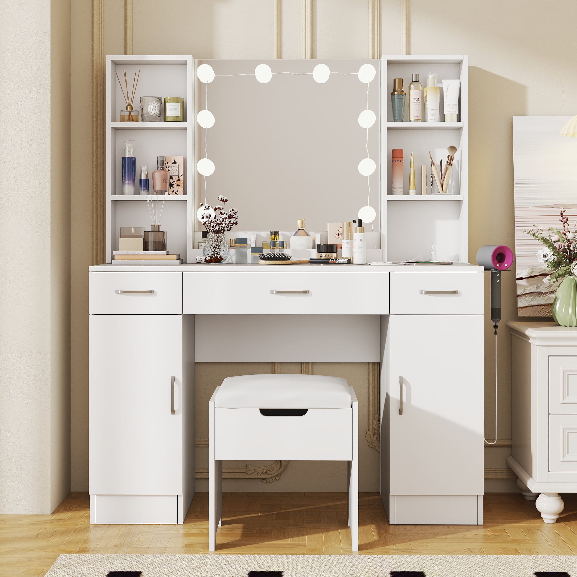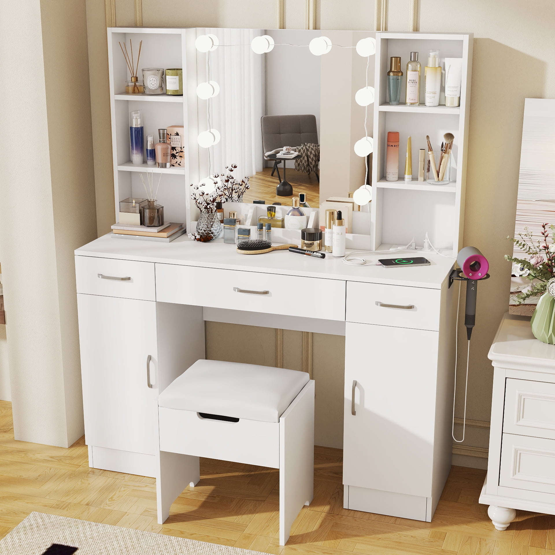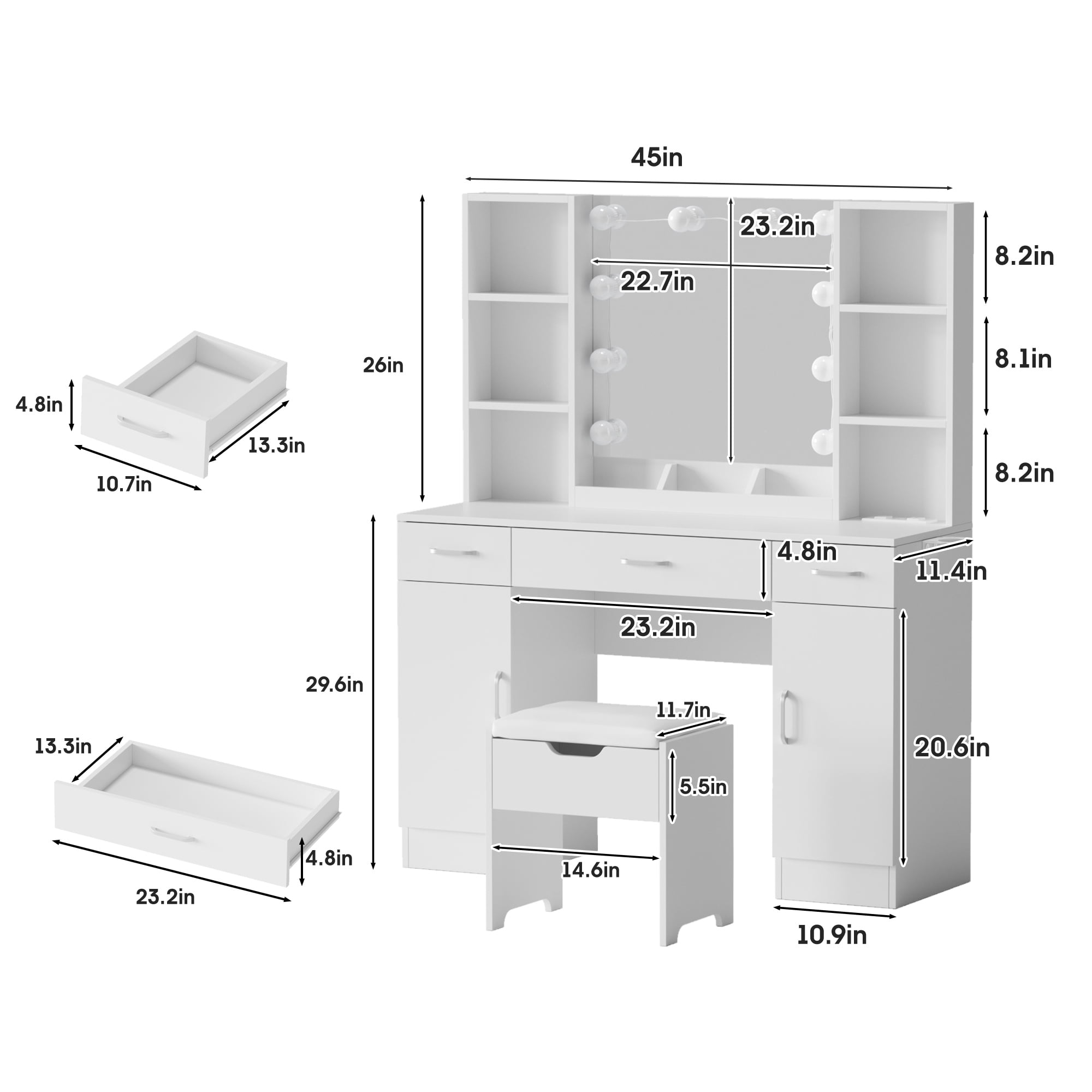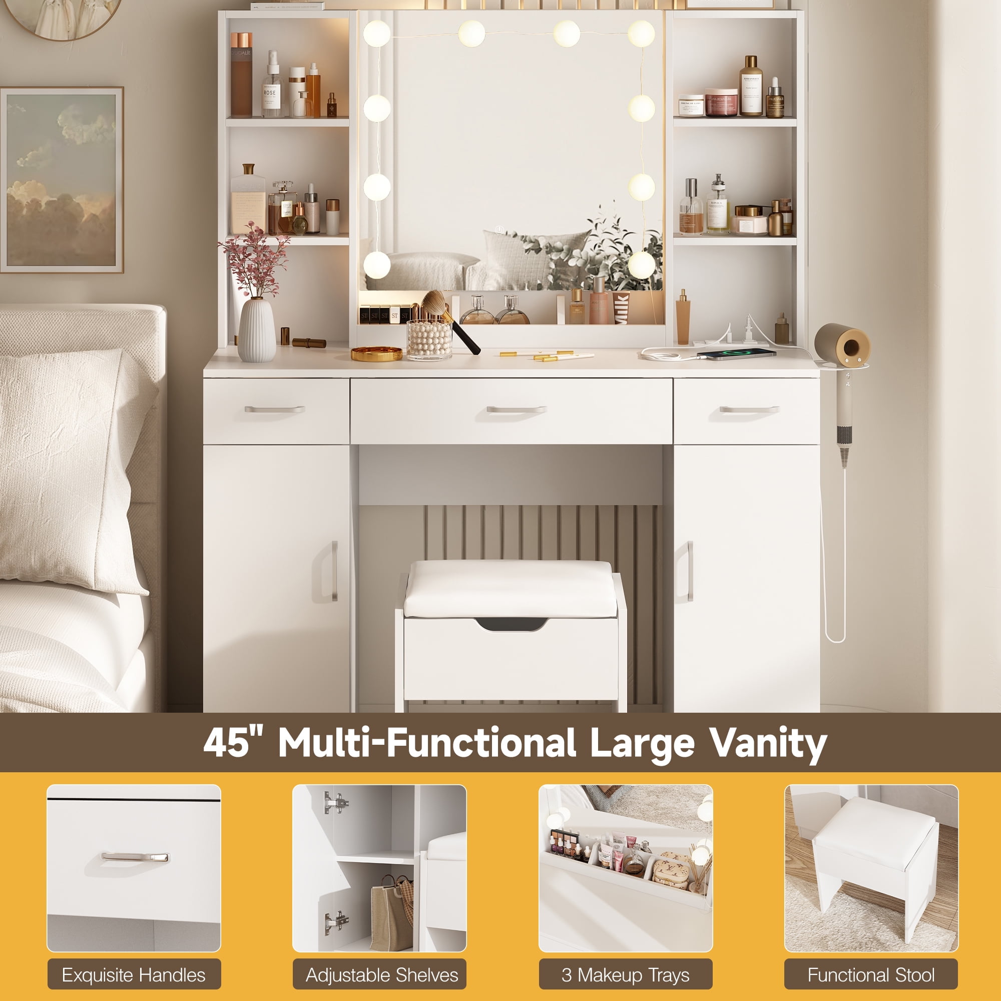 Features: 10 Hollywood light bulbs with Adjustable Brightness 3 Lighting Modes: Warm Yellow, Warm White and Cold White 2 Power Outlets(125V/12A) and 2 USB Ports(5V/2A) Built-in Hair Dryer Rack 6 Open Storage Shelves 3 Large Drawers for Storage Cushioned Stool with Storage Beautiful Modern Style Perfect for Your Bedroom, Bathroom Specifications: Color: White/Black/Brown Material: Particleboard, Metal Vanity Size: 15.4″D x 45.2″W x 55.7″H Mirror Size: 23.2″L x 22.7″H Package Includes: 1 x Vanity Table 1 x Cushioned Stool 1 x Hair Dryer Rack 10 x LED Bulbs 1 x Power Strip 1 x Accessories 1 x Instruction 10 Hollywood light bulbs with Adjustable Brightness|3 Lighting Modes: Warm Yellow, Warm White and Cold White|2 Power Outlets(125V/12A) and 2 USB Ports(5V/2A)|Built-in Hair Dryer Rack|6 Open Storage Shelves|3 Large Drawers for Storage|Cushioned Stool with Storage|Beautiful Modern Style Perfect for Your Bedroom, Bathroom