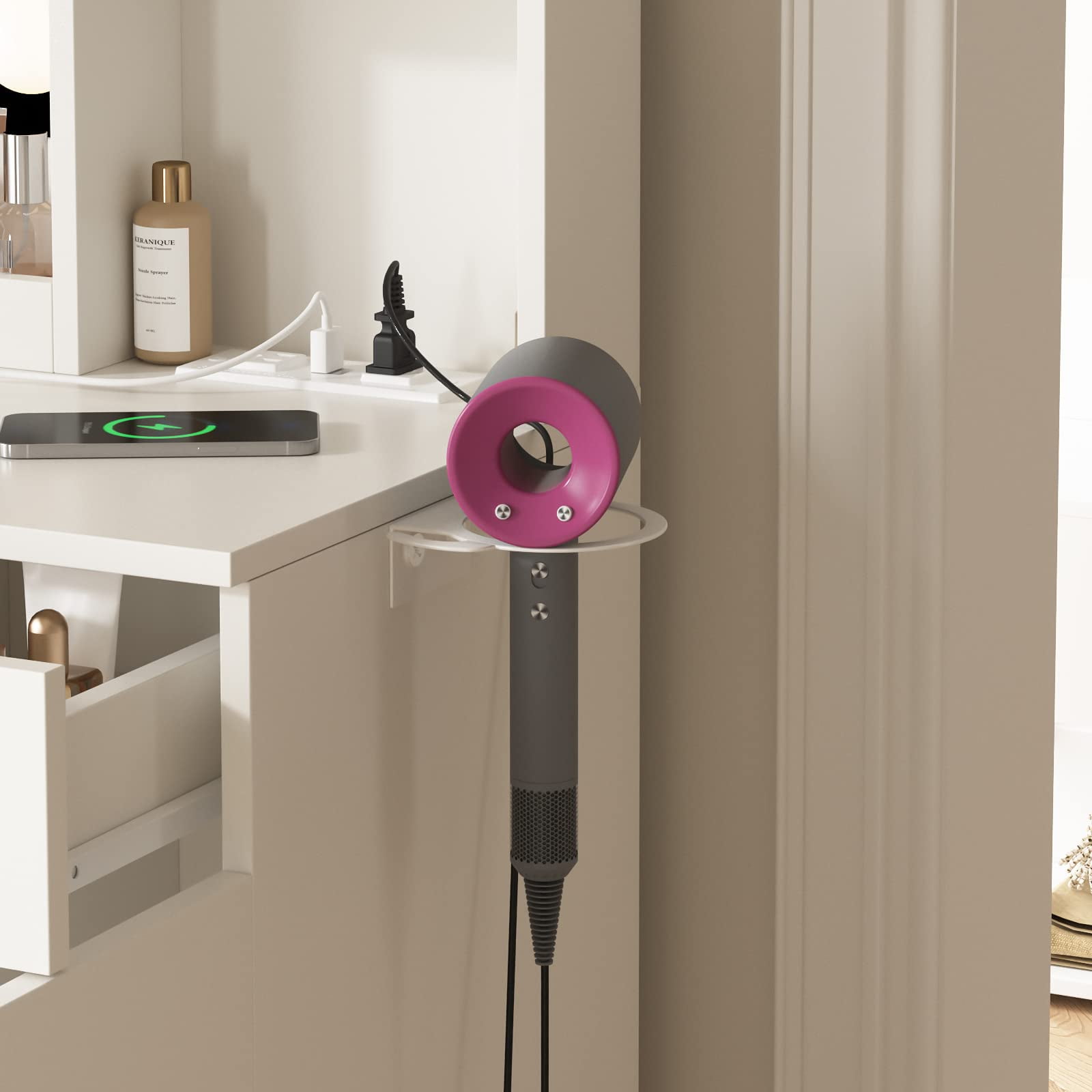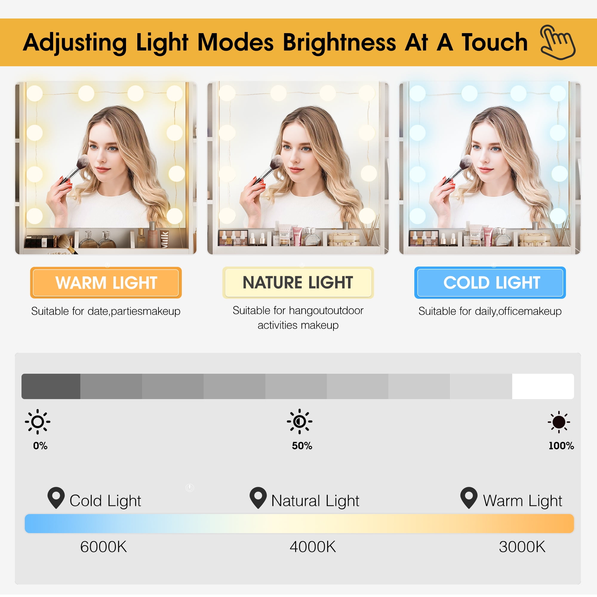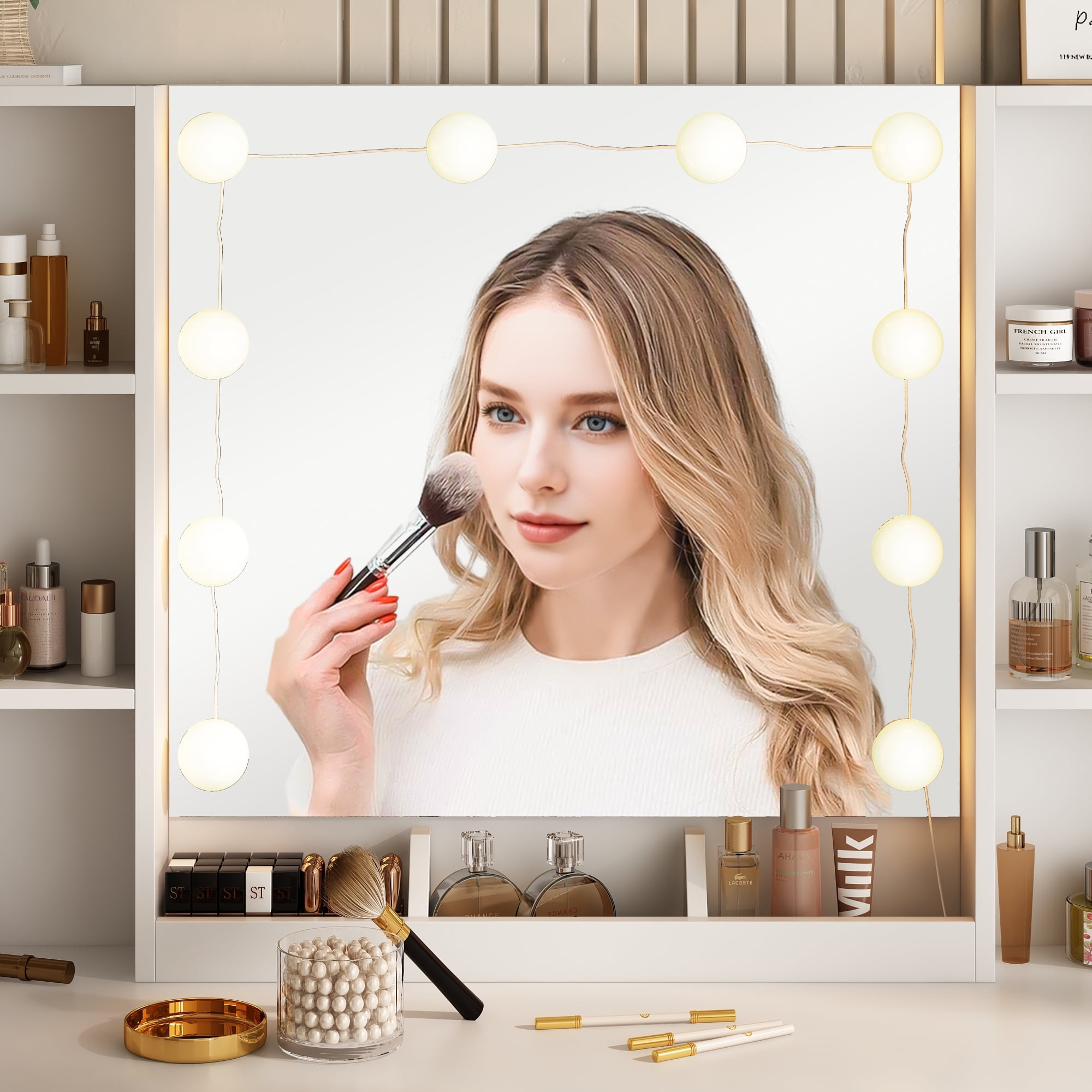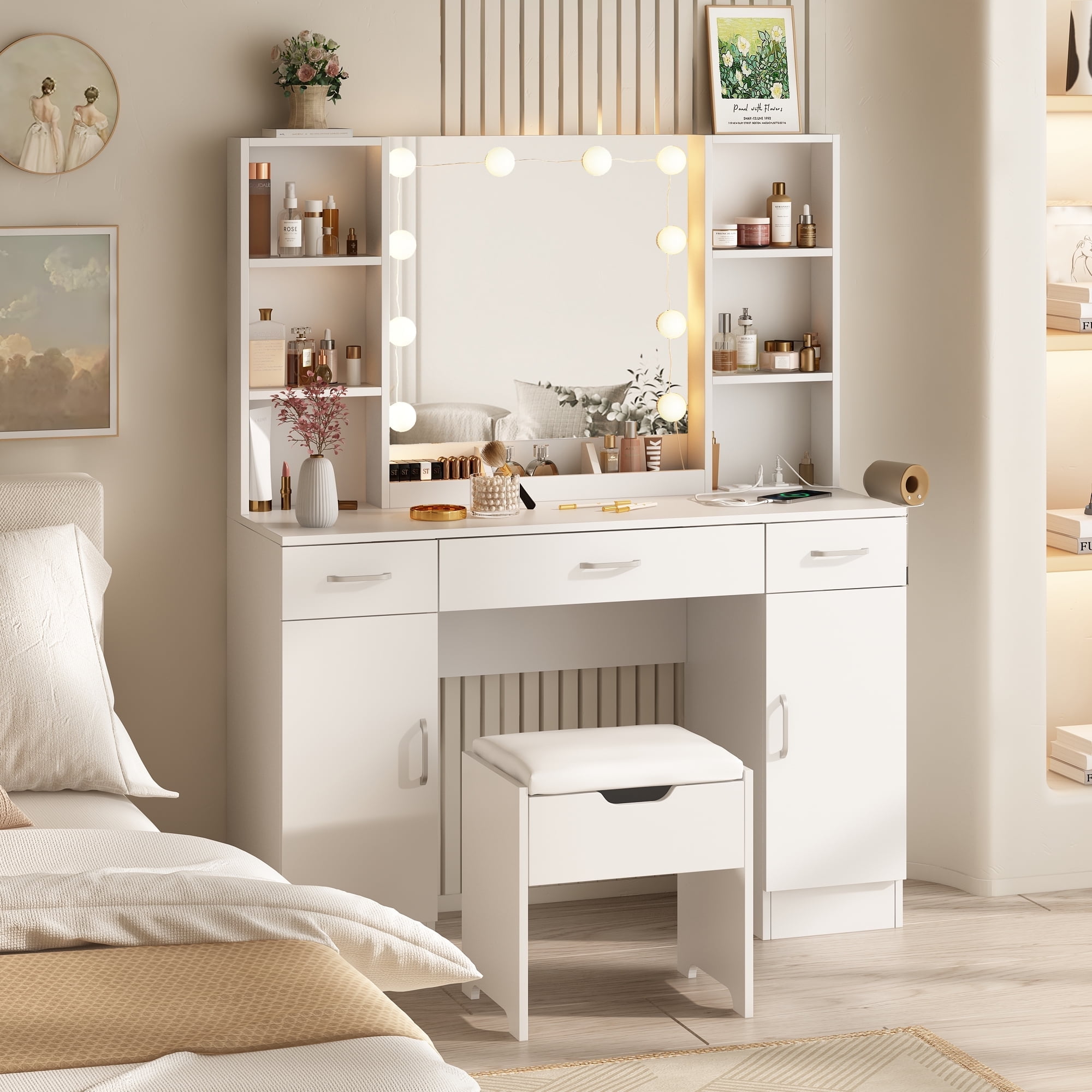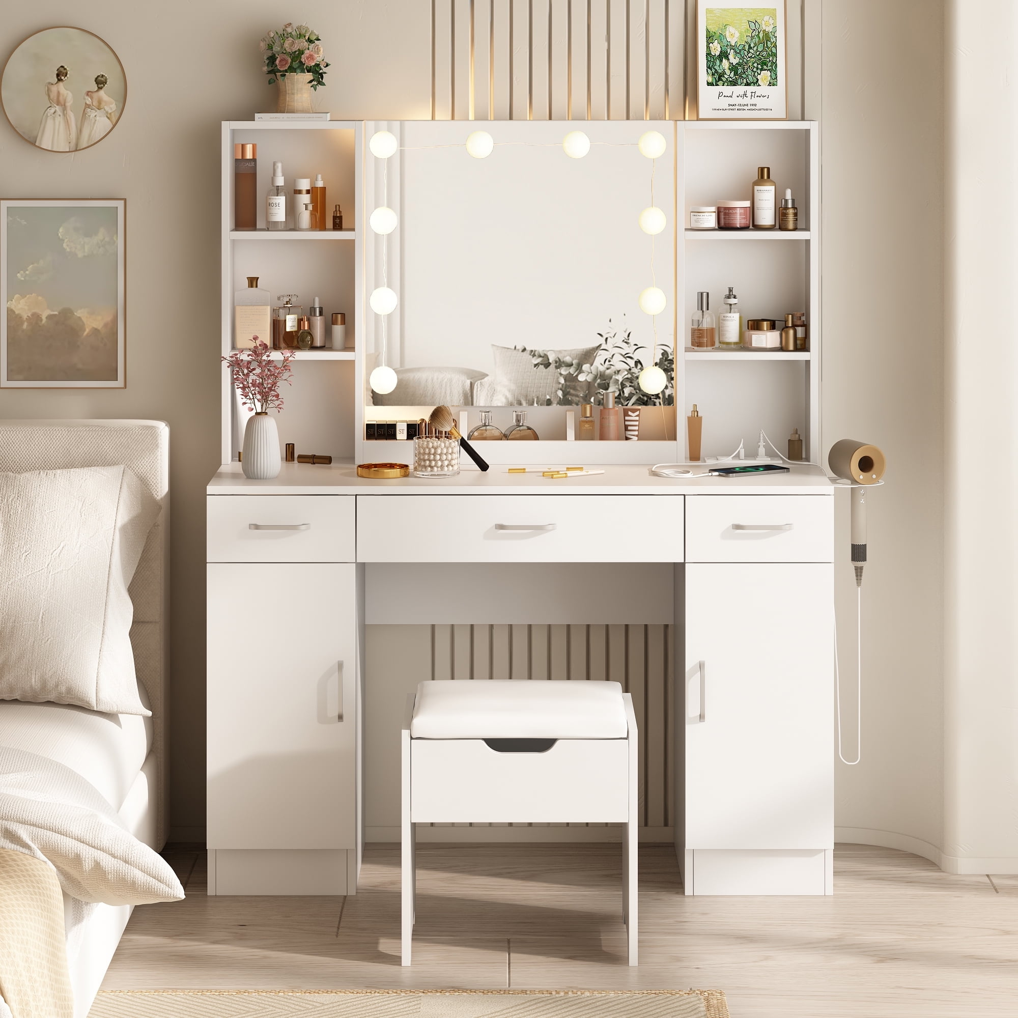 Features: 10 Hollywood light bulbs with Adjustable Brightness 3 Lighting Modes: Warm Yellow, Warm White and Cold White 2 Power Outlets(125V/12A) and 2 USB Ports(5V/2A) Built-in Hair Dryer Rack 6 Open Storage Shelves 3 Large Drawers for Storage Cushioned Stool with Storage Beautiful Modern Style Perfect for Your Bedroom, Bathroom Specifications: Color: White/Black/Brown Material: Particleboard, Metal Vanity Size: 15.4″D x 45.2″W x 55.7″H Mirror Size: 23.2″L x 22.7″H Package Includes: 1 x Vanity Table 1 x Cushioned Stool 1 x Hair Dryer Rack 10 x LED Bulbs 1 x Power Strip 1 x Accessories 1 x Instruction 10 Hollywood light bulbs with Adjustable Brightness|3 Lighting Modes: Warm Yellow, Warm White and Cold White|2 Power Outlets(125V/12A) and 2 USB Ports(5V/2A)|Built-in Hair Dryer Rack|6 Open Storage Shelves|3 Large Drawers for Storage|Cushioned Stool with Storage|Beautiful Modern Style Perfect for Your Bedroom, Bathroom