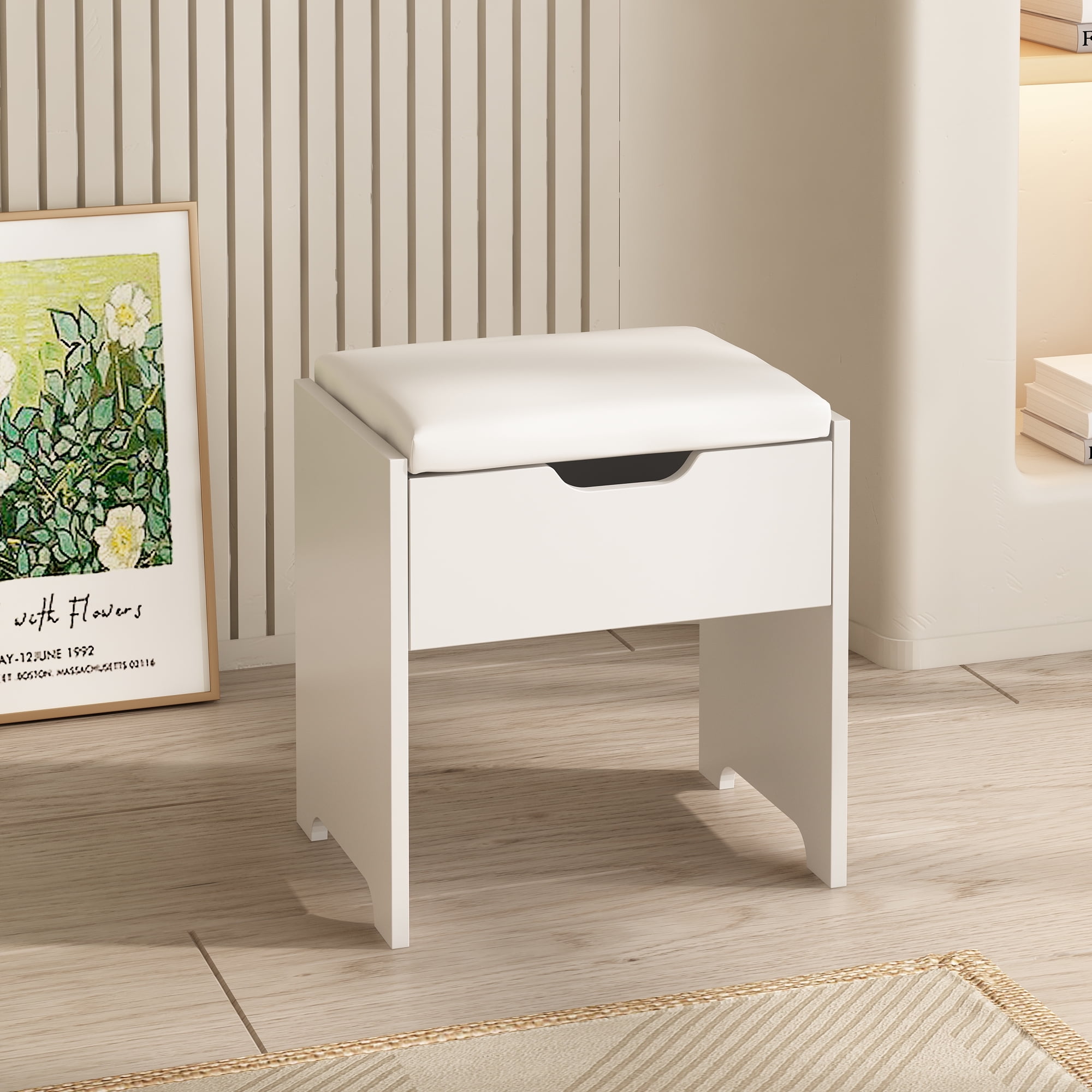 ãLarge Storage Capacityã This makeup organizers keep all your makeup essentials and favorite jewelry close at hand! 6 open storage shelves, 3 large drawers and 2 lockers provide enough space for your cosmetics, jewelry, perfume and other items. The hidden space inside the bench can store your personal items and protect your privacy. Keep your vanity dresser organized. ãVanity with Charging Stationã Don’t have charging anxiety! This makeup desk is equipped with power outlets and USB ports to let you charge your phone, computer and other electronic devices at the same time. Besides, this vanity table also comes with a hair dryer shelf. You can easily do your hair in front of the vanity set with a curling iron or hair dryer. ã10pcs Hollywood light bulbsãThis make up vanity comes with a large square mirror and 10 LED lights, provide 3 color modes: warm yellow, warm white and cold white, so you can choose the most comfortable color and Light up your beauty. ãBeautiful & Practical Make up Vanity Stationã Elegant white vanity desk, perfect combination of vanity & cabinet, can match perfectly with other furnitures in your bedroom and dressing room, also perfect for beauty salons, spas and photography studios. ãPerfect size & Happy Experienceã45.2″(L)*15.4″(W)*55.7″(H) Big vanity, and 15.8*11.7*15.7inch comfortable stool with PU cushion. High quality and unique frame design gives this girls vanity good stability and durability. Step-by-step instructions in the package, all parts and accessories are labeled for easy installation