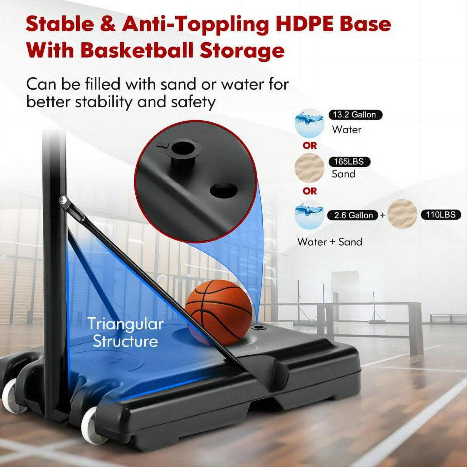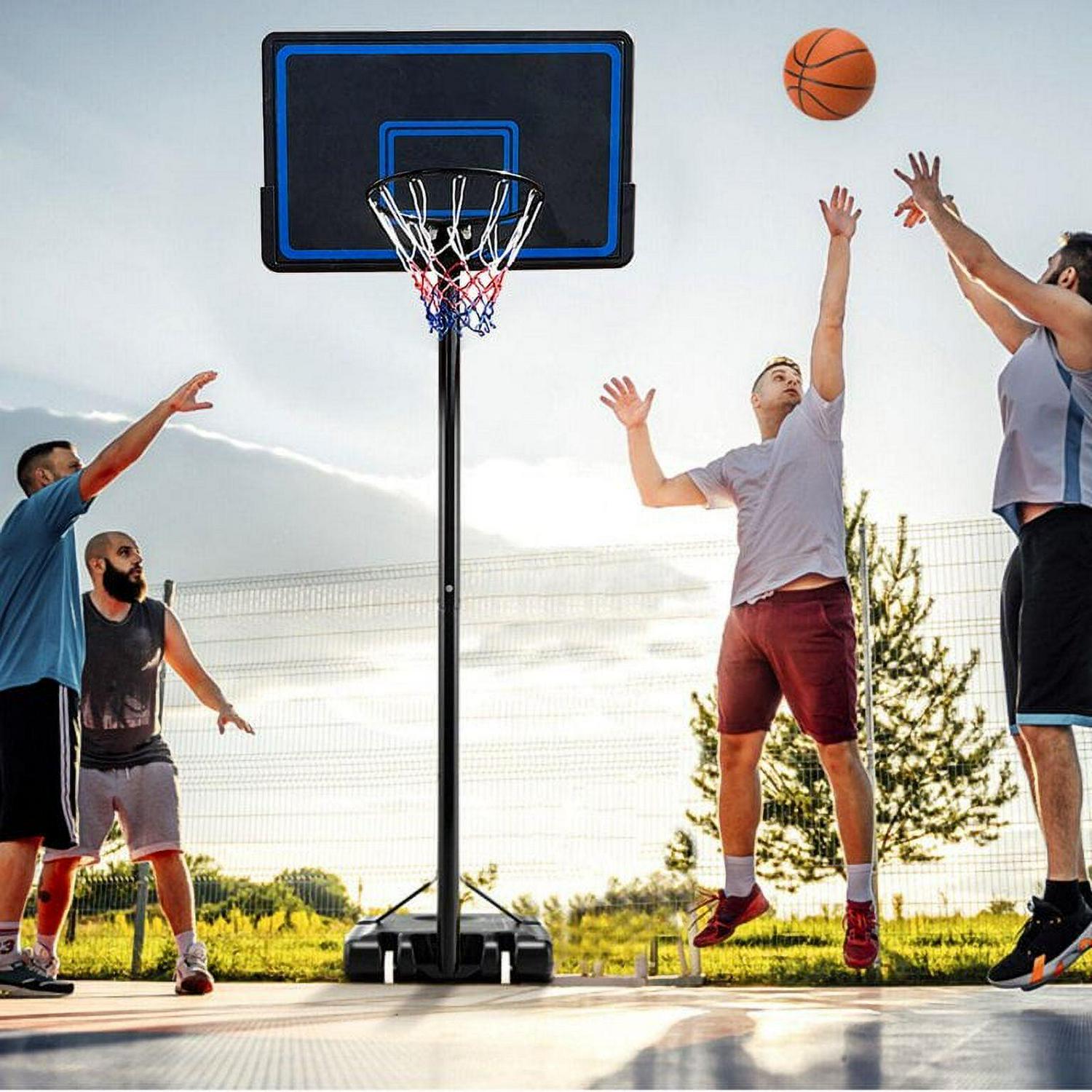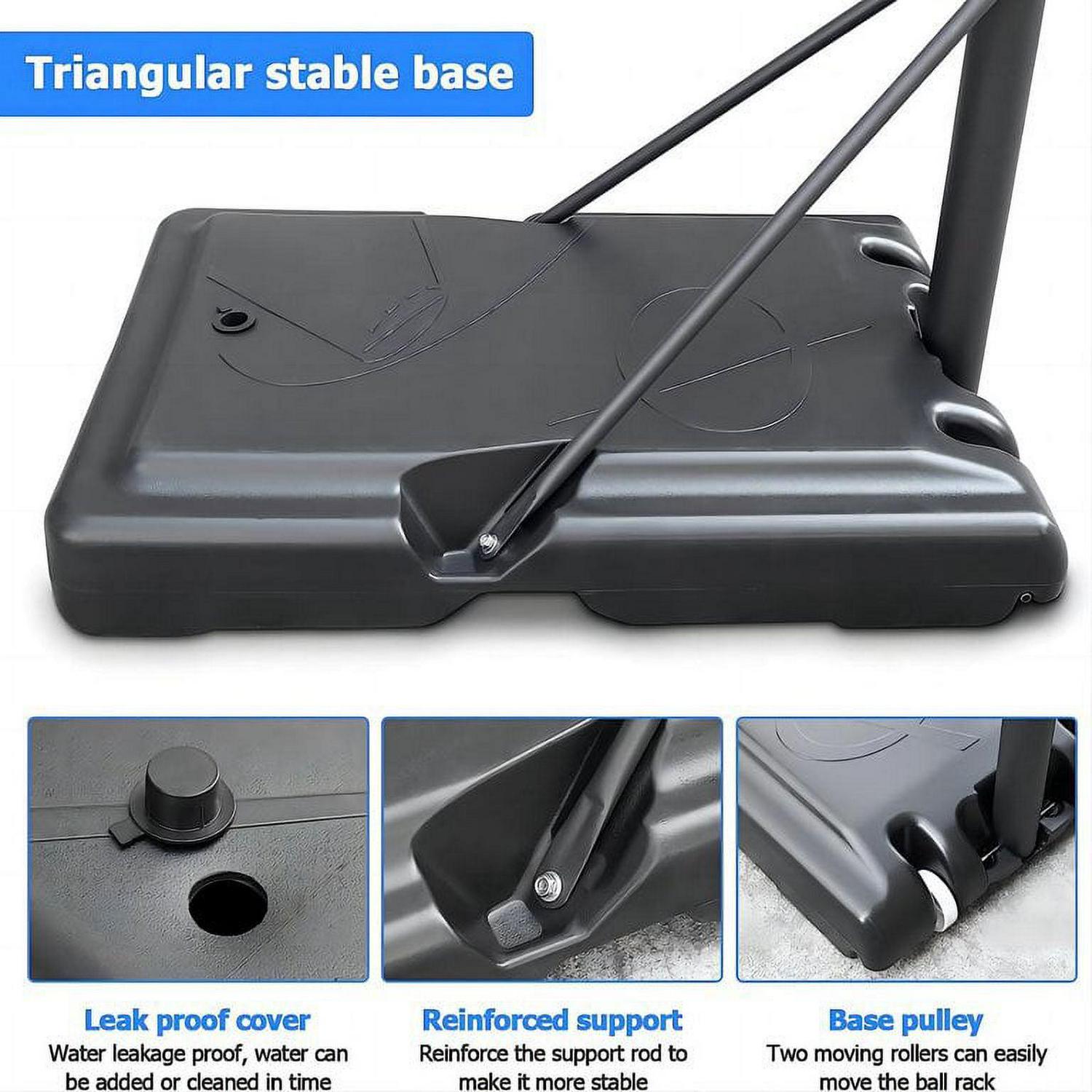 Vebreda 44in Portable Basketball Hoop. Support rod adopts 3in steel designed, enough for bad weather and intense games for long-term use. Lift system easy height adjustments from 7.5 ft. to 10 ft. for different ages or heights youth children play. This portable system gets its stability from a 20-gallon base equipped with two wheels. You can wheel this hoop wherever you want to play basketball. This basketball hoop is great for all ages and skill levels! All parts and tools needed for assembly are included, but it’s recommended to use your own tools for quicker assembly. This 44″ portable basketball hoop is a must have for kids, teens, or adults who enjoy the game of basketball, but may have limited space to play. Practice your jump shot, 3 pointer and layups right in your backyard. DO NOT hang on rim. This portable basketball hoop is built to last. Weather and water resistant for all-season use.