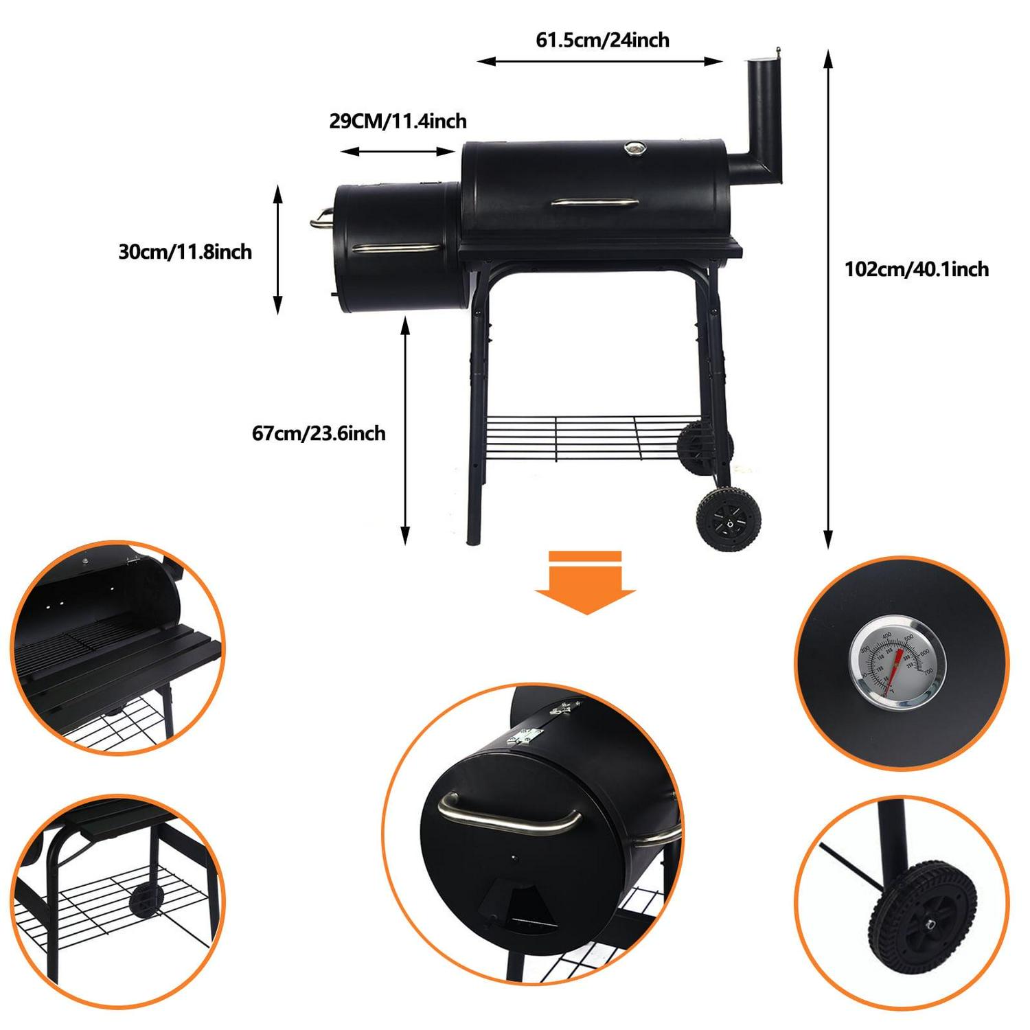 – Safe Use: The top lid is assembled with a thermometer which is easy for you to read the temperature. Wooden handles effectively prevent you from being burnt. The front wood shelf is designed for putting grilling tools or spices on it and is easy to reach.