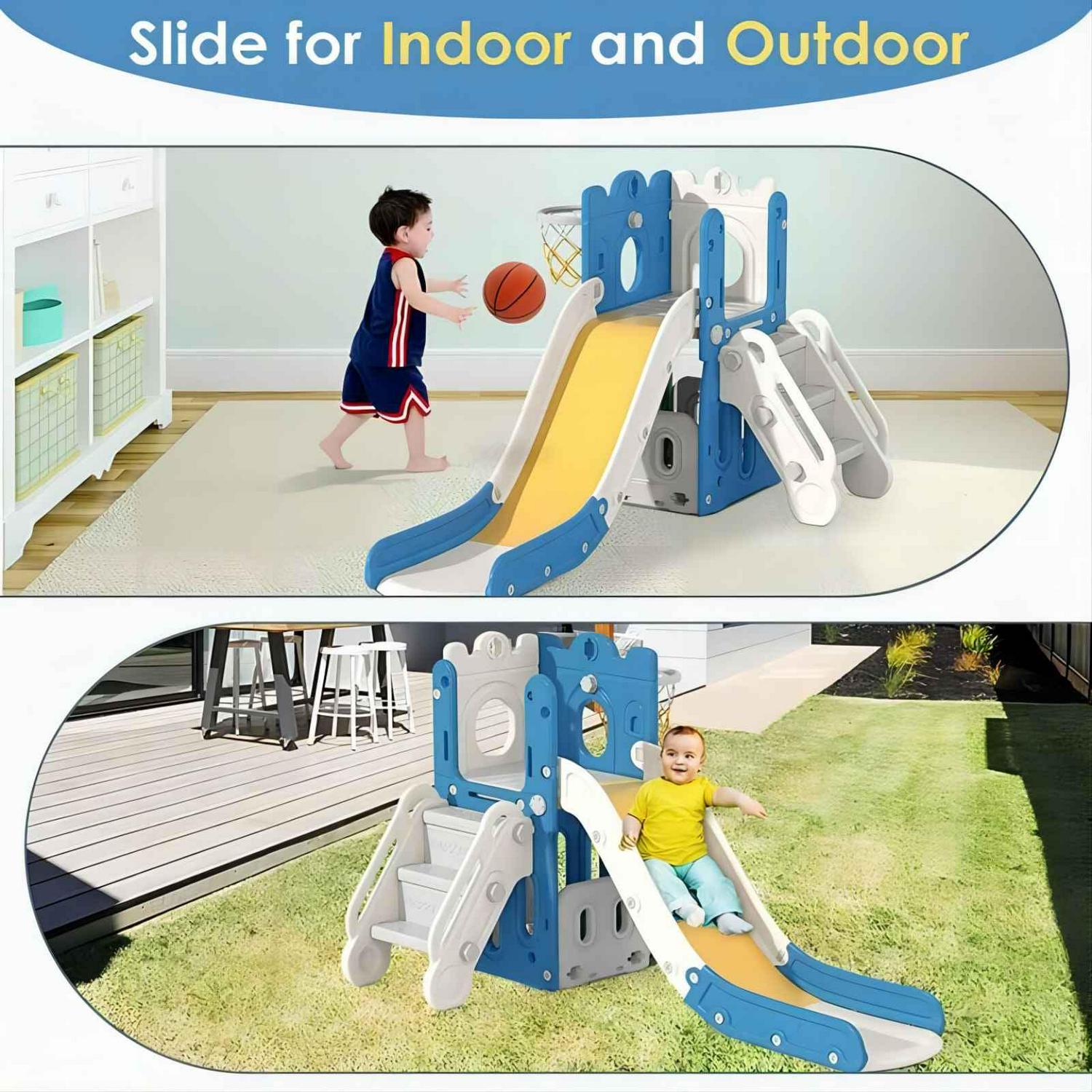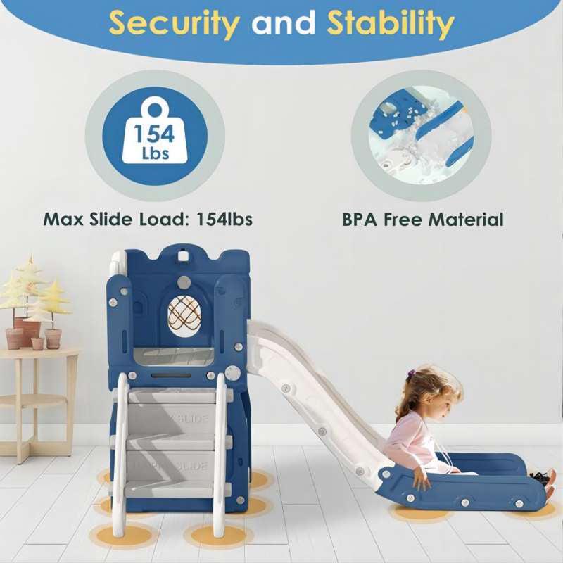 Vebreda Quality is always our top priority when making toys for kids. The sturdy structure and strong load-bearing capacity allow the kid to play without worry and accompany your child for a long time.This slide playset structure includes 5 main play parts which are kids’ favorites: a step ladder to climb, a smooth slide to rush down freely, a basketball hoop and a toss ring to play, an arch tunnel for crawling, and an organizer compartment to hide . This Kids Climbers Playground sets can exercise the kid’s coordination ability, and develop the spirit of adventure.The raised castle guardrail immediately attracts the children’s interest and also protects the child from falling. And there is a deepen texture on the ladder to prevent the kid from slipping. Smooth and round corners make the kid’s delicate hands do not be hurt.
