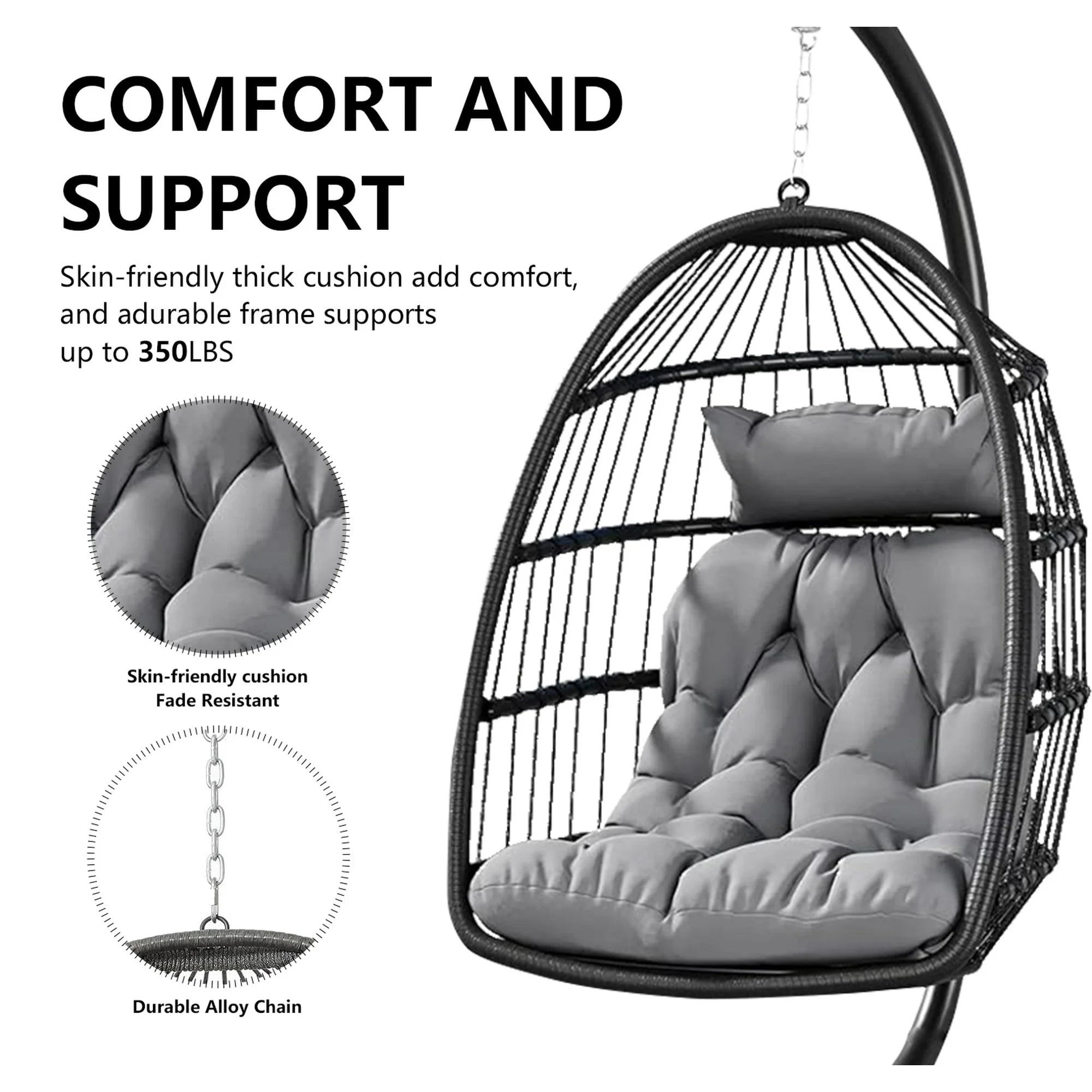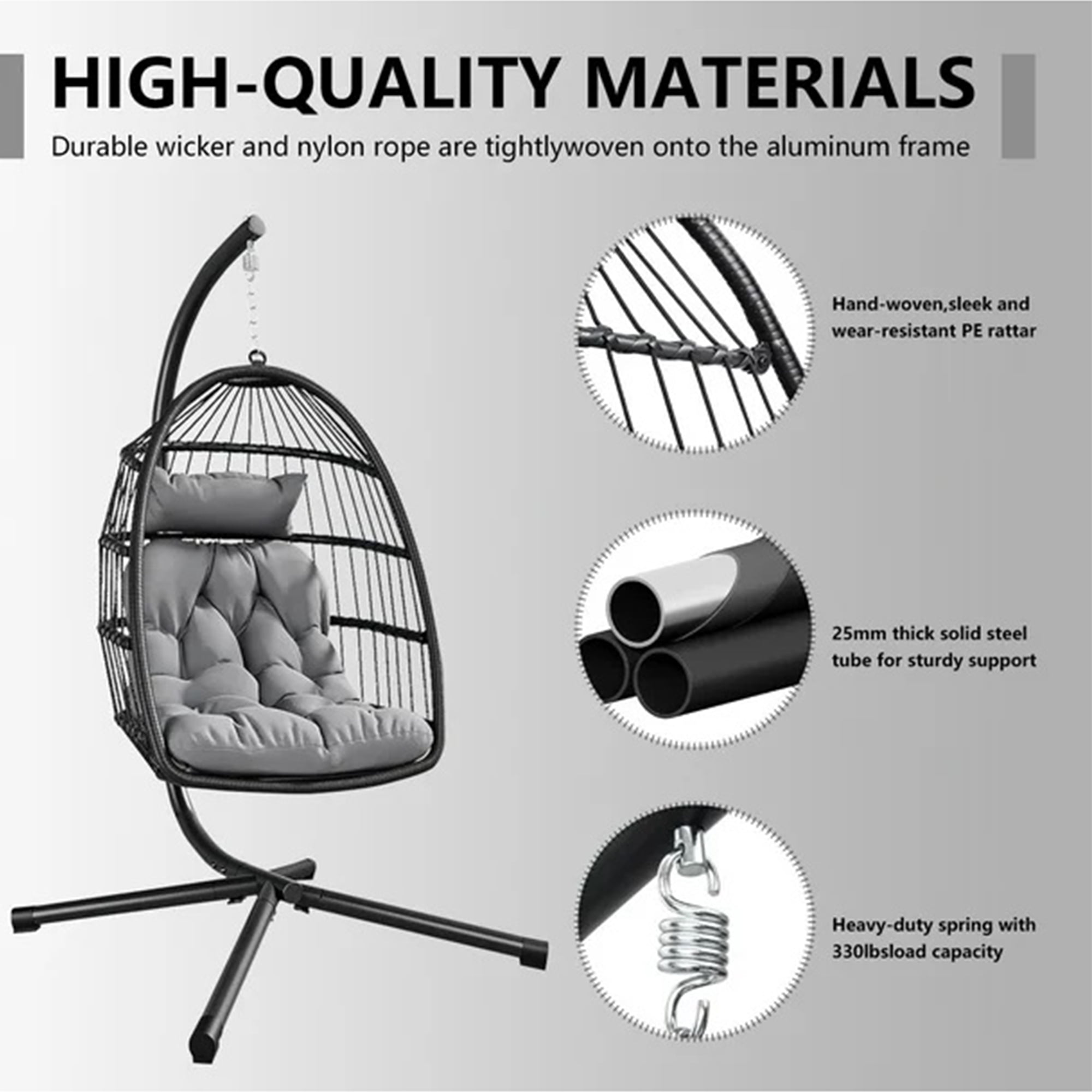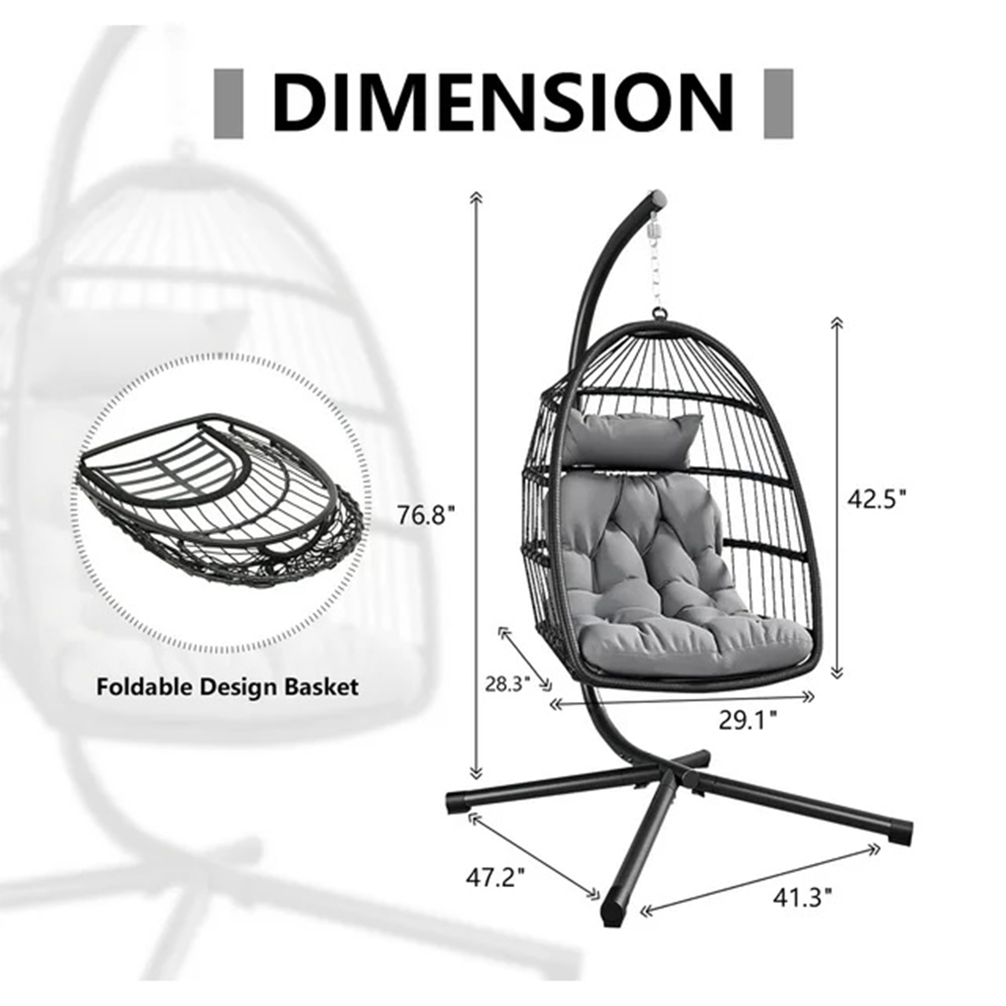 Practical & Elegant Design: This egg chair seamlessly blends practicality with elegance, featuring a robust suspension hook, a chic tufted design, and a plush headrest. With a weight capacity of 350 lbs, it ensures secure and delightful swinging experiences for individuals of various sizes. Indoor/Outdoor Use: Versatile and heavy-duty, this hanging egg chair with a stand seamlessly fits into any space, be it an outdoor patio, deck, sunroom, garden, poolside, or outdoor bar. It is tailored for both indoor and outdoor relaxation. Easy to Assemble: Assembly is a breeze with our user-friendly instructions and provided tools. In approximately 20-25 minutes, you can have your egg chair ready for use. When not in use, the hanging egg chair conveniently folds up for storage, saving space effortlessly. Color: Black+Gray Material: Metal, Polyester, PP, PE Rattan Overall Dimension: 47.2″ x 41.3″ x 76.8” (L x W x H) Weight Capacity: 350 lbs Package Includes: 1 x Swing Egg Chair 1 x Seat Cushion 1 x Headrest Pillow 1 x Instruction