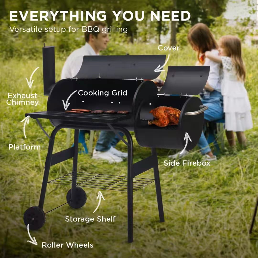 Do you want to enjoy cooking anytime, anywhere? If so , It will be your best choice. It can save space, so it can be easily carried anywhere and enjoy cooking. The seamless connection between side smoker and main chamber help to heat up quickly and keep warming.This unit is the practical and fashionable grill that will help you enjoy outdoor cooking with family and friends. This patio charcoal grill is made of durable steel that’s anti-rust and will provide years of dependable use. It features a side shelf that can hold food and tools for added convenience. The backyard charcoal grill has a sleek and stylish black design that will look impressive during use and match most outdoor decors. It also has wheels on the bottom to help transport when needed. The attached steel firebox helps reduce smoking and offset heat for a more comfortable cooking environment.