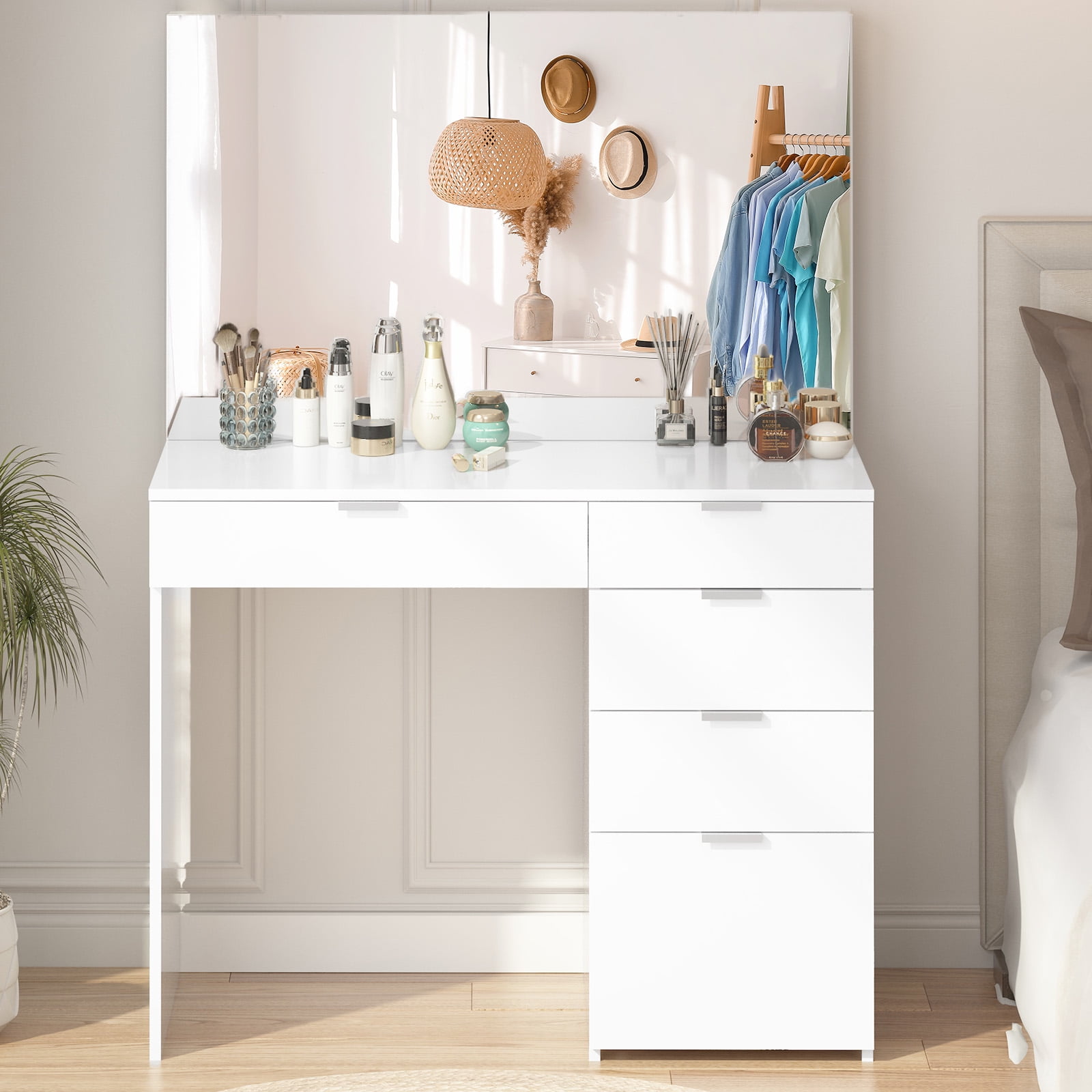 Vebreda Vanity Desk with Large Mirror and 5 Drawers for Bedroom, Dressing Room, White