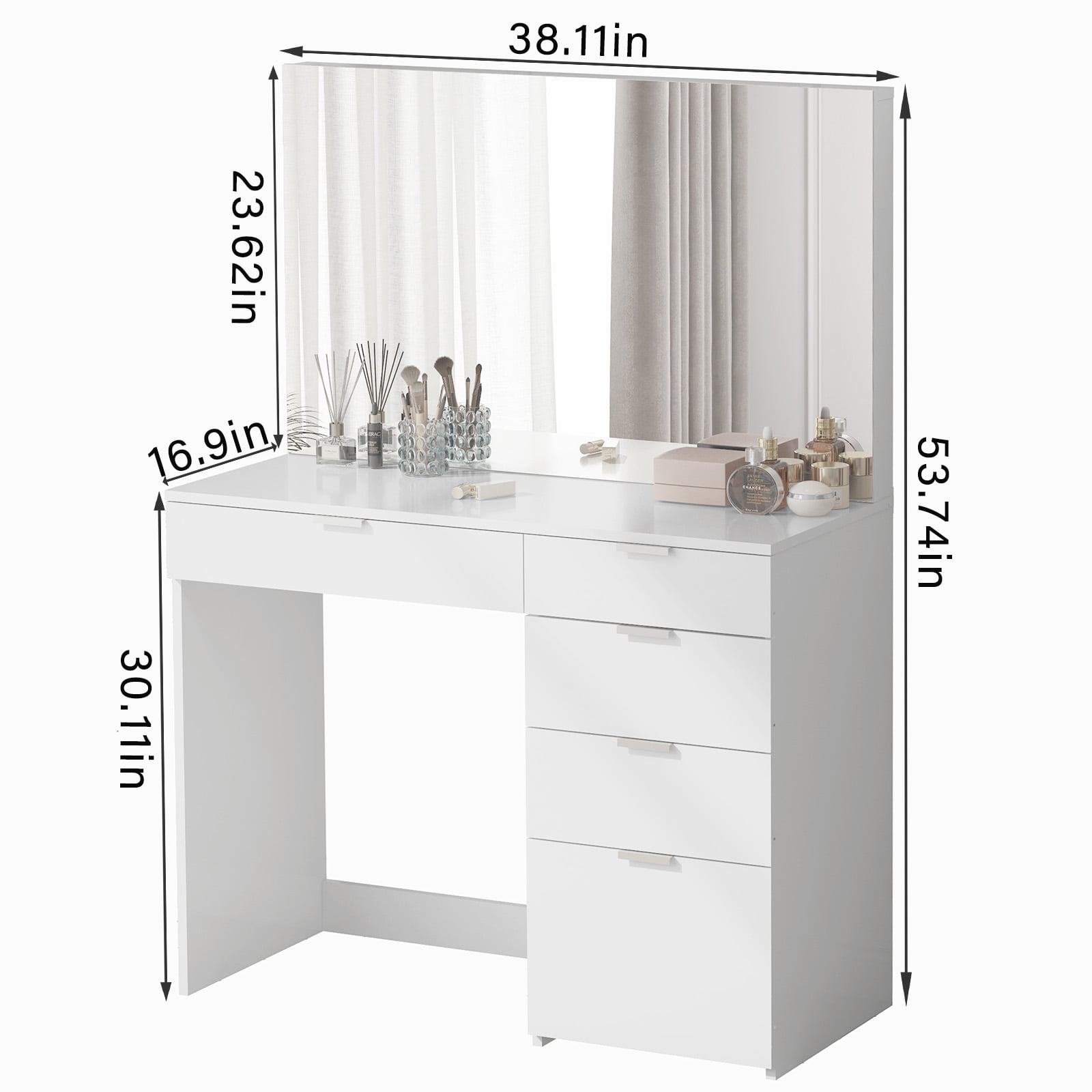 Stylish & Compact: Elevate room aesthetics, fits small spaces. Ample Storage: 5 drawers, wide tabletop—cosmetic organization. Effortless Makeup: User-friendly, large mirror for easy access. Durable Construction: Sturdy MDF board ensures stability. Easy Assembly: Quick setup with detailed instructions. Functional Elegance: Perfect for bedrooms or dressing rooms Ready for Use: Enjoy hassle-free use of your new vanity.