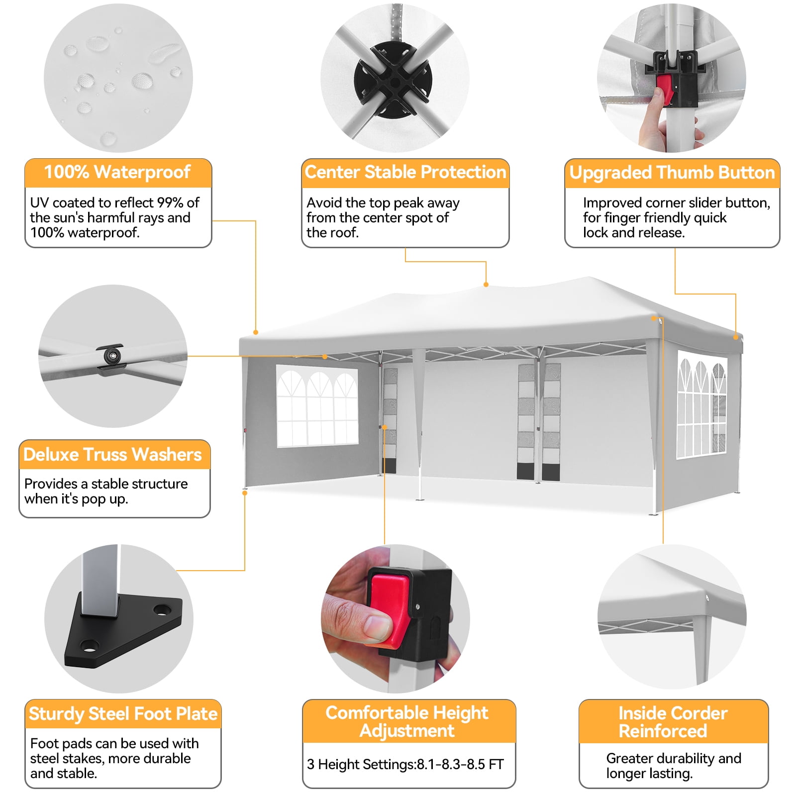 Hello, Welcome to VECUKTY Store! Vecukty 10′ x 20′ Canopy Tent EZ Pop Up Party Tent Portable Instant Commercial Heavy Duty Outdoor Market Shelter Gazebo with 6 Removable Sidewalls and Carry Bag, White This 10 x 20 Ft portable canopy tent is constructed with a one-step setup steel tent frame, waterproof canopy top, 6 removable sidewalls with windows and zippers, stakes, and tent rope for fastness, which all can be put into a carry bag, easy to carry or be stored in the trunks. This folding party tent features an easy setup, waterproof, windproof, UV protection, sturdy, and portable. What is more, this patio tent height can be adjusted by three levels from 8.1′ to 8.5′, and the party canopy is available for more than 15 people with tables and chairs. The outdoor tent can be used as a party tent, wedding tent, market tent, backyard tent, beach tent, etc. Why do you need to choose our pop up canopy tent? 【Easy Pop-up & Wind Resistance】 2 people can pop up and take down this portable tent in minutes without any tools. The rust & corrosion-resistant steel tent frame is sturdy, coming with 12 tent stakes and 6 ropes to fasten the party tent making it stable and sturdy in the wind and rain. 【Waterproof & UV Protection】the EZ pop-up instant tents are made from white silver-coated 210D Oxford cloth, featuring water resistant and anti-UV, providing 200 Sq ft of shade, protecting you from sunburn, and rain when having a party with friends in the backyard or beach. 【6 Removable Sidewall Design】2 Sidewall with Window & 2 Sidewall with Zipper & 2 Sidewall with Storage Bag. The door on the side wall can also be rolled up. They are easy to assemble or take down for greater versatility and ventilation. Perfect for all seasons. 【10×20 Ft & 3 Height Adjustable】This outdoor canopy height can be adjusted from 8.1′ to 8.5′ easily. This party tent can hold about 15 people with a table & chairs. 【Easy to Pack & Storage】the Pack size is 49.2″ x 14.2″ x 10.6″, and the folding tent can be placed into the trunk conveniently. 【Household Use & Commercial Use】applicable in Hiking, Camping, Fishing, picnics, and Family outings & available for sporting events, small businesses, arts and crafts fairs, and trade shows. Specifications: Color: White Tent Frame Material: Powder-coated Steel Frame, Plastic Canopies Material: 210D Oxford Cloth Carry Bag Material: 300Dx600D Oxford Cloth Tube: 0.6MM Adjustable Height: 8.1 – 8.5 FT Expanded Dimensions: 20 x 10 x 8.5 FT Packed Dimensions: 49.2″ x 14.2″ x 10.6″ Package Include: 1 x Tent Frame 1 x Canopy Top 2 x Tent Sidewall with Window 2 x Tent Sidewall with Organizer Pockets 2 x Tent Sidewall with Zipper 6 x Ropes 12 x Stakes 4 x Sandbags 1 x User Manual 1 x Carry Bag with Wheels