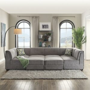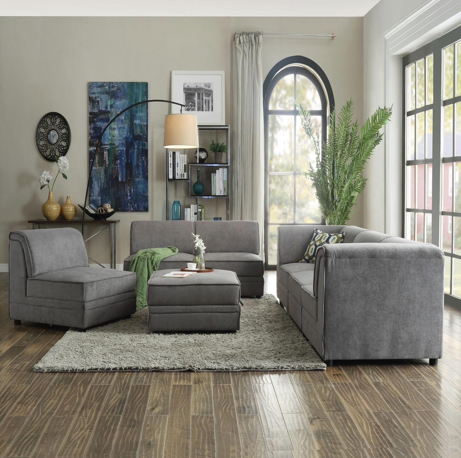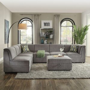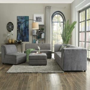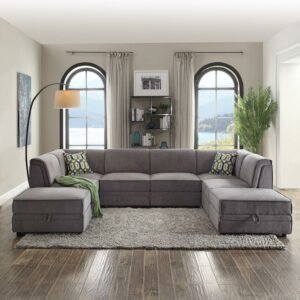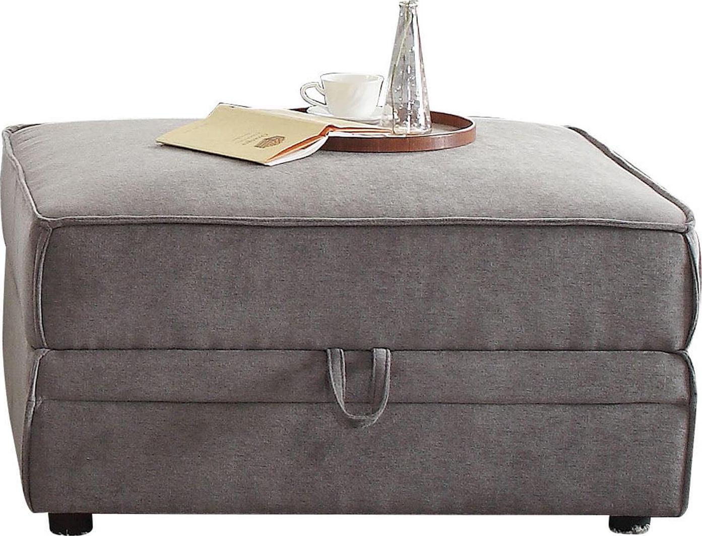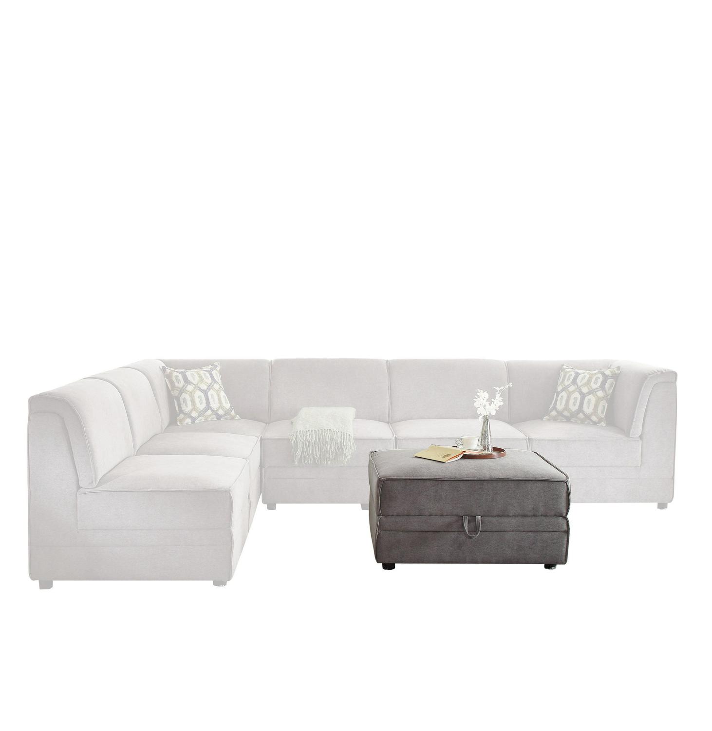 – Included:Rectangular Ottoman w/Storage (Backless)- Storage: Lift Lid-Seat (Safety Hinge)- Padded Seat/Base- Construction: Inside Frame Wood Foam Box Seat Cushion w/Welt Trim- Material: Gray Velvet (Solid Pattern)- Plastic Round Leg: Black Finish