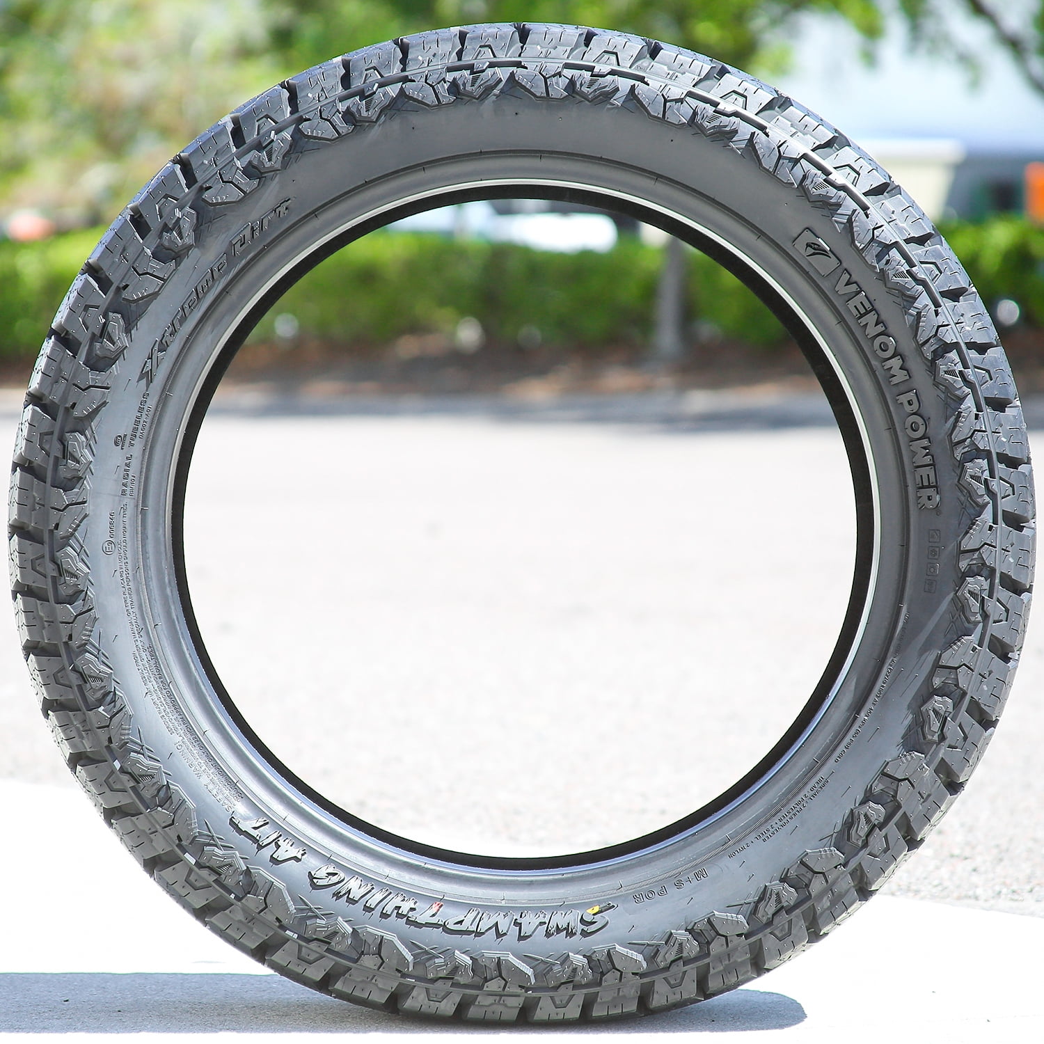 Venom Power Swampthing A/T Xtreme Dirt OVERVIEW The Venom Power Swampthing A/T Xtreme Dirt is an all terrain, all season tire made for SUVs and light trucks. Venom Power offers a 55,000 mile treadwear warranty with some of the sizes of this tire model. 22 inch and lower, and 13.5-inch wide or less sizes receive this warranty if the correct procedures are followed. The mounted tires must be rotated according to the prescribed rotation patterns, at least 3,000 – 5,000 miles, and the documented rotation schedule must be shown. Tires must be presented for adjustment during regular routine maintenance. The documentation showing the rotation schedule, date of purchase, vehicle type, model, odometer reading, and tire pressure must be presented when requesting an adjustment of a prematurely worn-out tire. This model promotes exceptional on-road and versatile terrain performance. It uses the aggressive staggered footprint, which is created with larger blocks and wide, deep grooves. These elements firmly grip the road with extra biting edges, optimizing its soft, loose, and uneven terrain grip. Additionally, the tread design also keeps the footprint clean. Mud and snow do not block the surface contact, while stone retention is also effectively prevented. This combination ensures a safer driving experience. The stable footprint and the wider contact patch maintain the tire’s surface contact at all times. In this manner, the model boosts its steering responsiveness and driving stability. The tire enhances its steering response time and accuracy to the driver’s commands, while the structure is also stabilized. The reinforced internal structure does not deform under load and driving pressure. Since the tire does not deform, it is able to securely increase its load durability. The tire is able to enhance its year-round grip. The durable compound and detailed tread design improve the dry, wet, and winter weather performance. The sipe pattern and staggered blocks enable the tire to enhance its grip on the road surface, by providing additional biting edges. Stronger compound elements allow the tire to improve its summer and winter weather performance. During the tire’s on-road drive, the groove pattern disperses water and slush from the footprint. This effectively avoids hydroplaning. The Swampthing A/T Xtreme Dirt offers high driving comfort levels during its on-road performance. The tread’s wider road contact area and the stable footprint significantly decrease road noise levels. The tread pattern prevents sound waves from reaching the vehicle’s cabin, ensuring the passengers’ driving enjoyment. Extreme Terrain tire types are not designed for regular highway driving. They are primarily designed for off-road applications. Not all tire sizes are suitable for all vehicle types. Please refer to the item specifications for accurate information about vehicle type fitment for this particular size. Manufacturers recommend changing tires every 10 years. As long as tires are properly stored before they are sold, the year of their manufacture will not shorten their service life.