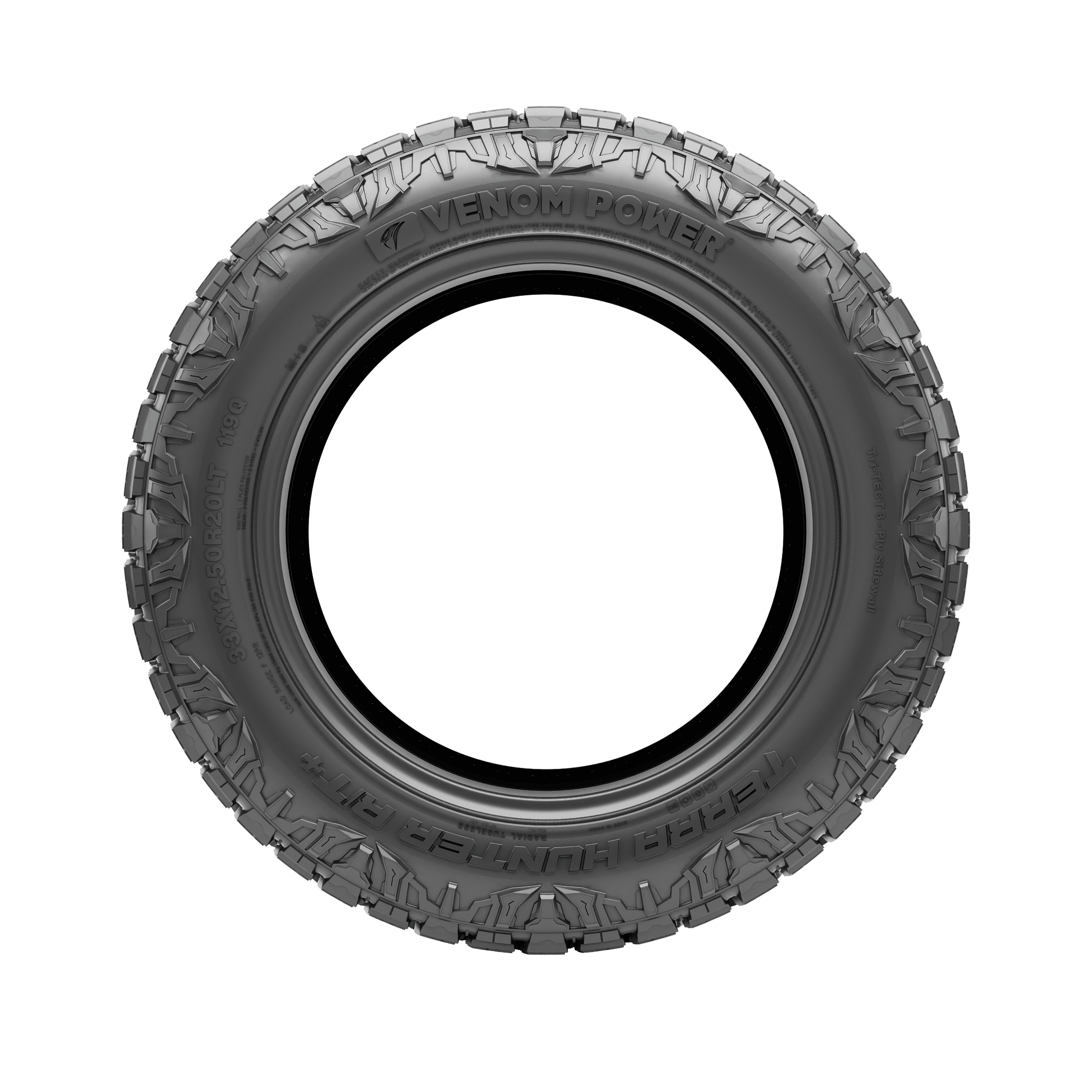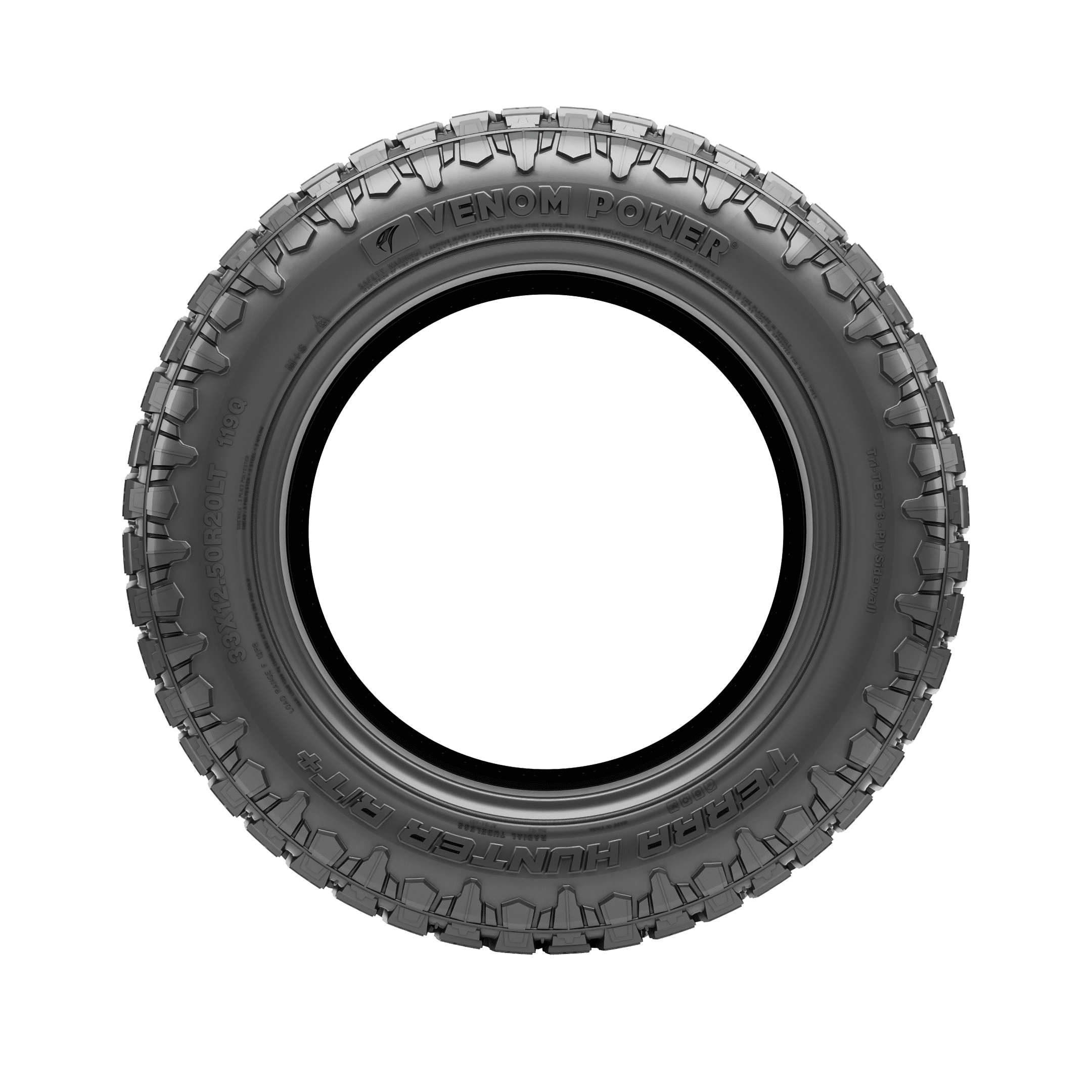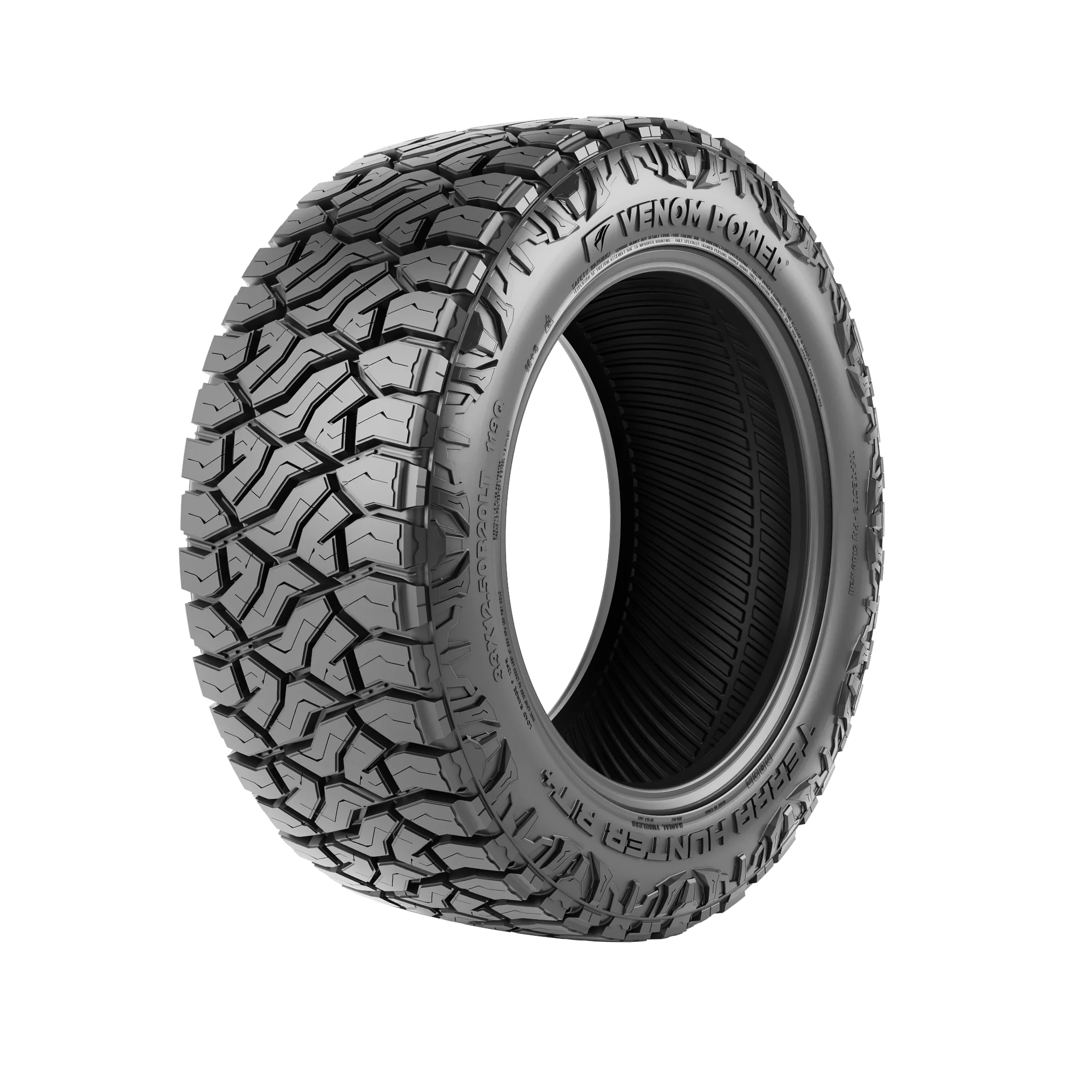 The Venom Power Terra Hunter R/T+ features aggressive stylish dual sidewalls and enhanced road bite ready to tread on challenging terrain with ease. Entitled to its versatile road performance, the Terra Hunter R/T’s advanced technology guarantees all-season traction, confident tread performance, tamed noise control, and long lasting tread life for increased transit comfort for adventure enthusiasts on- and off-road. Best suited for: SUVs, jeeps, light trucks Tire Benefits & Features: Dual sidewall design and sidewall armor All terrain traction Deep tread depths Hydroplane resistant Long lasting tread life Debris ejectors