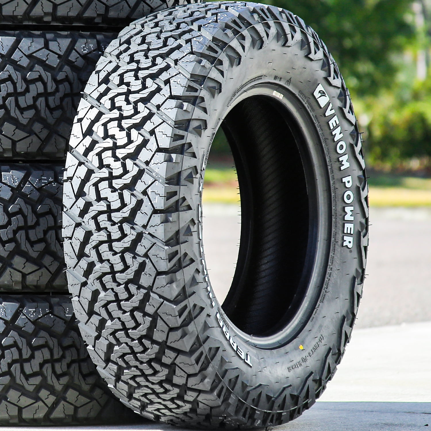 Venom Power Terra Hunter X/T 2 OVERVIEW The Venom Power Terra Hunter X/T 2 is an extreme terrain, all weather tire made for light trucks and SUVs. The model has some commercial van sizes available as well. Venom Power offers a 50,000 mile treadwear warranty with this model. Maintaining the surface contact enables controllability on different terrains. The aggressive tread pattern maintains road contact at all times. It improves steering responsiveness and driving stability. The steering response time is faster and more precise to the driver’s commands, while the structure is secured against driving pressure. On the other hand, the wide shoulder blocks upgrade the tire’s cornering and maneuvering. These elements enable the driver to have full control over the vehicle and promote a safe driving experience. The model ensures excellent extreme terrain traction. This rugged tread design updates the soft, loose, and uneven terrain grip. The tread blocks and the rubber compound improve the deep mud and lose dirt performance as well. These tread elements increase the number of biting edges gripping the terrain to ensure a secure performance. The tread’s wide grooves and staggered blocks keep the footprint clean. They eliminate mud and snow from between the tread elements to prevent them from blocking the tire’s contact with the terrain surface. They also avoid stone retention by ejecting rocks from the footprint. This, combined with the durable compound, enhances the tire’s damage resistance and driving safety. The tire improves its load and driving durability. The strengthened and flexible carcass structure enables the tire to significantly increase its larger load capacity. Since the construction does not deform under load and driving pressure, the model is able to effectively enhance its heavy-duty applications. This enables the tire’s exceptional performance under large loads. The Venom Power Terra Hunter X/T 2 provides true year-round traction. This model has received the three mountain peaks and snowflake symbol, indicating its severe winter-weather durability. The detailed tread design and the all weather compound optimize the tire’s dry, wet, and winter traction. The groove pattern helps to prevent on-road hydroplaning during the drive, further upgrading the driving security. All weather tires receive the three mountain peak and snowflake (3PMS) symbol for their exceptional winter weather performance. They are all season tires with extra winter weather grip, in order to guarantee safer year-round durability. This ensures their true and secure driving ability throughout the year. Extreme Terrain tire types are not designed for regular highway driving. They are primarily designed for off-road applications. Not all tire sizes are suitable for all vehicle types. Please refer to the item specifications for accurate information about vehicle type fitment for this particular size. Manufacturers recommend changing tires every 10 years. As long as tires are properly stored before they are sold, the year of their manufacture will not shorten their service life.