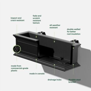 Old meets new. Inspired by lush estate gardens, the Veradek Brixton Railing Planter combines traditional design with modern technology making it best suited for windowsills or balconies. Complemented by its classic appearance, the Brixton Railing Planter is thoughtfully curated with functionality in mind adjustable, steel brackets allow for easy mounting. Once assembled, start planting a variety of herbs, succulents and flowers. This sturdy yet lightweight rectangular planter is proudly crafted in Canada from high-grade recycled plastic, making it resistant to cracks, fading and UV and allowing it to withstand extreme temperatures ranging from -20 to +120 degrees. With the perfect balance of design, structure and purpose, the Brixton Railing Planter adds the finishing touches to any indoor or outdoor space.