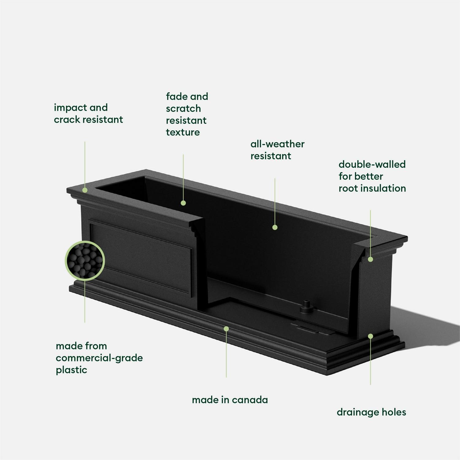 Old meets new. Taking inspiration in lush estate gardens, the Veradek Brixton Window Box Planter combines traditional design with modern technology making it best suited for windowsills or balconies. Featuring a removable insert bucket, the Brixton Window Box makes it easy to switch out plants, flowers or shrubs and pre-drilled drainage holes help prevent overwatering. This sturdy yet lightweight rectangular planter is proudly crafted in Canada from high-grade recycled plastic, making it resistant to cracks, fading and UV and allowing it to withstand extreme temperatures ranging from -20 to +120 degrees. With the perfect balance of design, structure and purpose, the Brixton Window Box adds the finishing touches to any indoor or outdoor space.