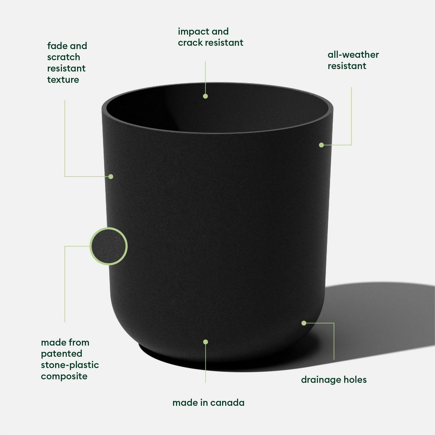 Soften up any room, patio or backyard with the Veradek Kona Planter s curved edges and subtle textured finish. Complemented by its modern appearance, the Kona features pre-drilled drainage holes allow for planting a variety of different greenery such as flowers, tall trees or shrubs without having to worry about overwatering. This sturdy yet lightweight round planter is proudly crafted in Canada from a patented plastic-stone composite, making it resistant to cracks, fading and UV and allowing it to withstand extreme temperatures ranging from -20 to +120 degrees. With the ideal balance of design, structure and purpose, the Kona is the perfect way to enhance any indoor or outdoor space, every season.