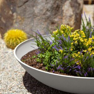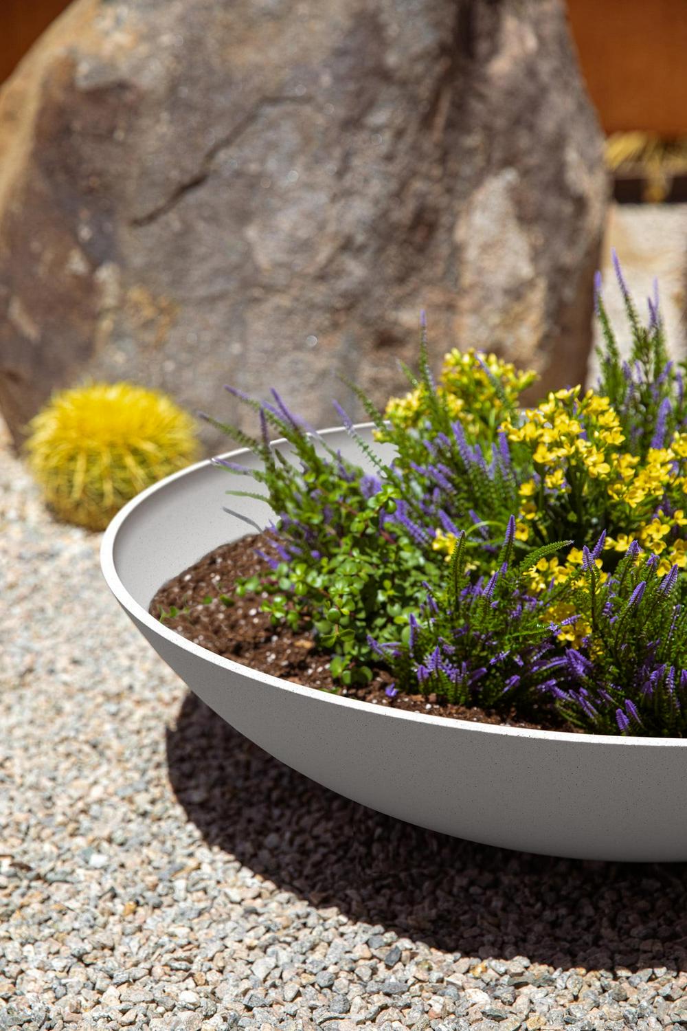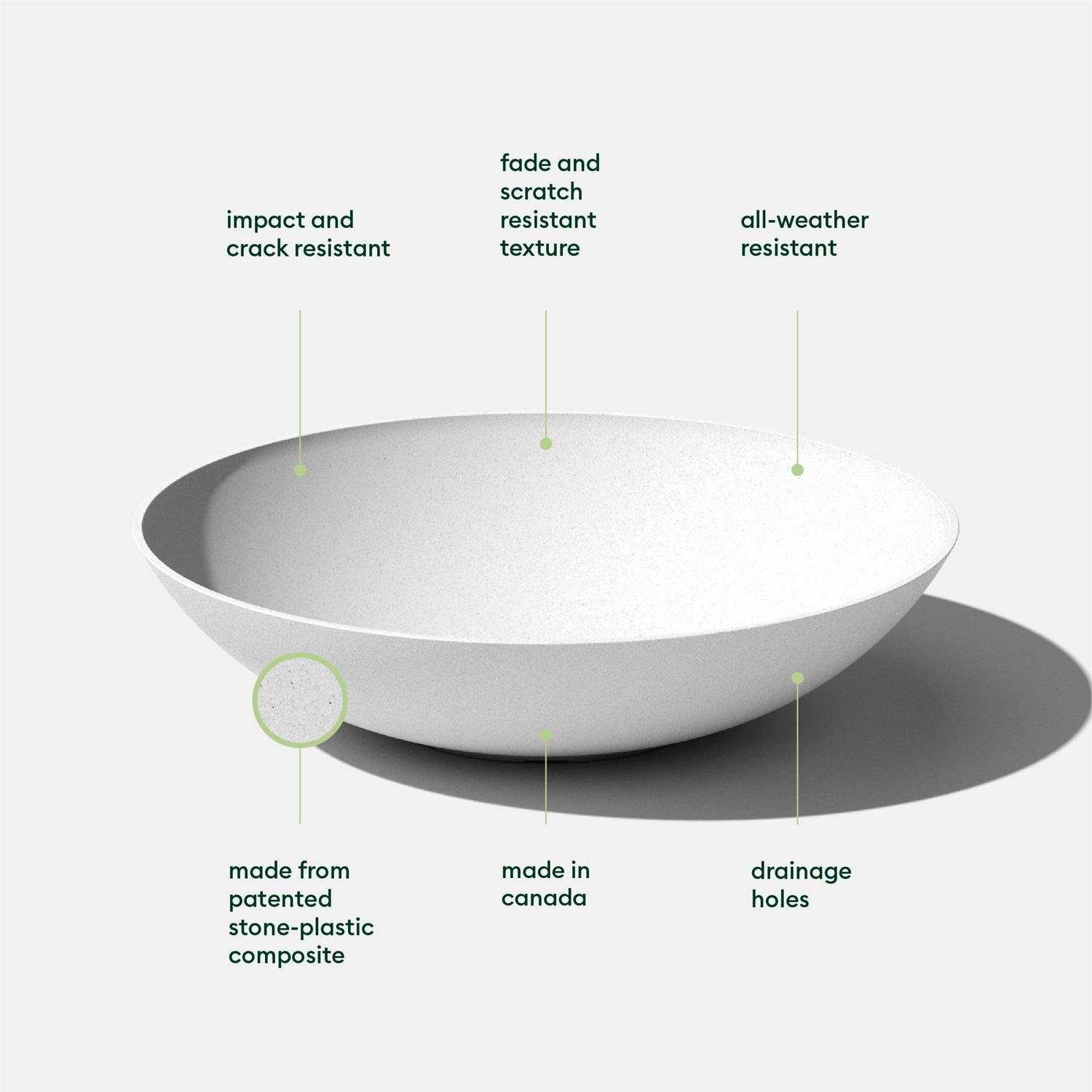 Create a defined entryway or grand statement with the Veradek Lane Bowl Planter featuring its smooth, curved edges and a subtle textured finish. Complemented by its modern appearance, the Lane Bowl features pre-drilled drainage holes allow for planting a variety of different greenery such as flowers, succulents or herbs without having to worry about overwatering. This sturdy yet lightweight round planter is proudly crafted in Canada from a patented plastic-stone composite, making it resistant to cracks, fading and UV and allowing it to withstand extreme temperatures ranging from -20 to +120 degrees. With the perfect balance of design, structure and purpose, the Lane Bowl will complete the look to any indoor or outdoor space.