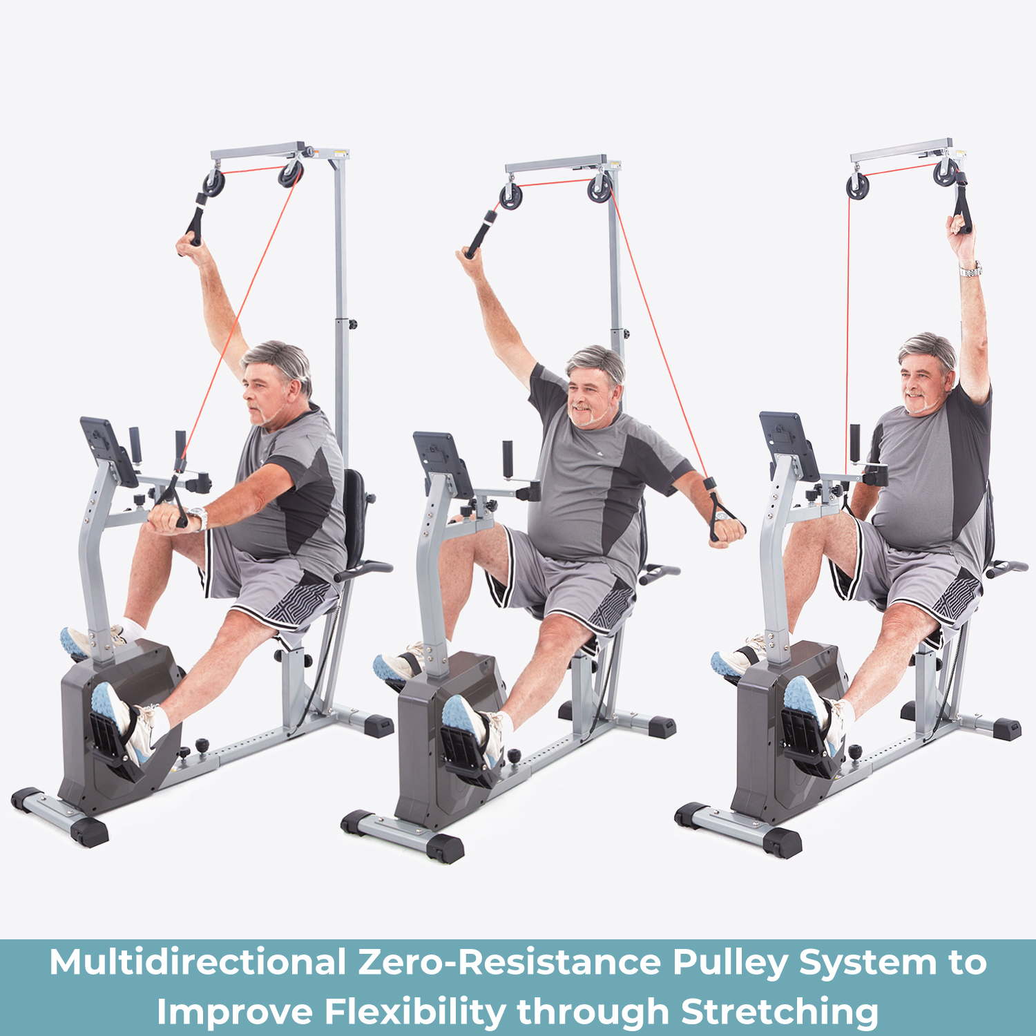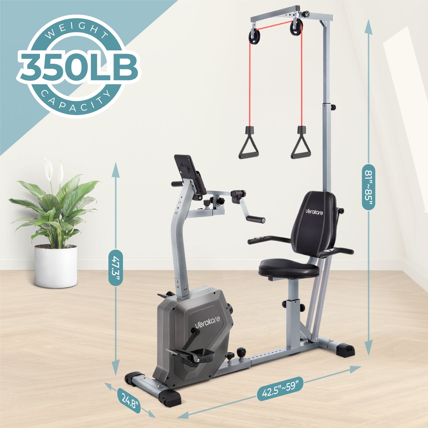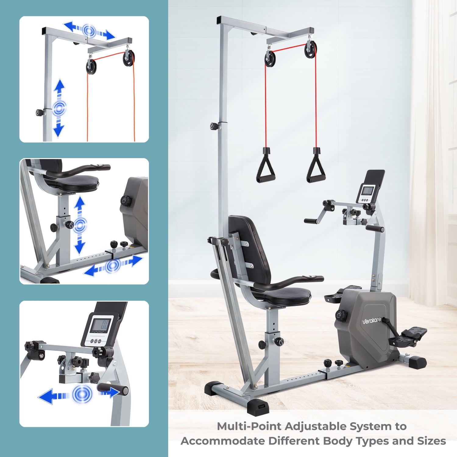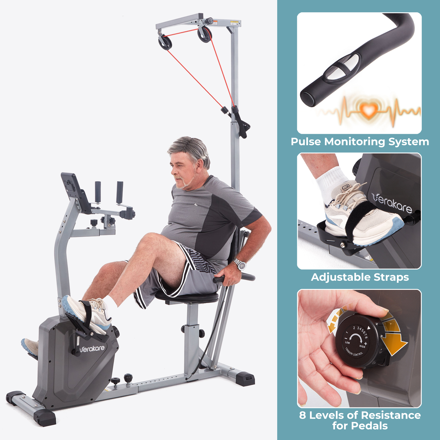 VeraKare, Model RBE3000 Introducing the Verakare RBE3000, an innovative fitness equipment that provides total body in-home rehabilitative exercises. From cardio workouts to stretching and even coordination, this equipment includes a recumbent bike, a pulley system, and multi-positional hand exercisers for a comprehensive rehabilitative experience. The RBE3000 features a recumbent bike which allows users to get a great cardiovascular workout while exercising their thighs, calves, and glute muscles. Unlike regular stationary bikes, recumbent bikes require less effort to balance and are more ergonomic. There’s less strain on your joints which is great for those with arthritis or joint pain. The rope and pulley system allows you to stretch both shoulders and arms in a variety of angles, relieving tension in stiff muscles and joints. The pulley wheels can swing forward and back in addition to spinning left and right to offer a greater range in motion and extension when stretching. The RBE3000 also features a multi-positional hand exerciser, providing a wide range of motions for the hand and arms to help increase circulation. Users can also combine the recumbent bike workout with the hand exercisers or the pulley system to increase body coordination. As a bonus, the RBE3000 also includes a device holder for phones or tablets that allows users to incorporate technology – such as fitness apps or tele-health communication with their physician – into their rehabilitation experience. With a five-point adjustable framework, this machine can accommodate bodies of different shapes and sizes and users up to 350 lb. The RBE3000 features thoughtful design to improve your strength, endurance, flexibility, and mobility in the comfort of your own home. Safety Information: Consult with a licensed physician before using this exercise equipment. Some medical conditions may not be suitable for use with this product. Disclaimer: Although we strive to ensure all product details and information is accurate, there may be slight variations by the manufacturer. Actual product packaging and materials may vary and may contain different information than shown on our product page or website. Please do not rely solely on the information presented and be sure to read all labels, warnings, and instructions before using the product. For additional information on the product, please do not hesitate to contact the manufacturer.