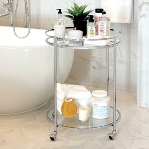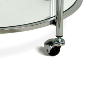 The high-fashion Veranda Round Cart by Studio Designs Home includes smooth-roll ball casters for easy mobility over any flooring surface. Just because you have a small space doesn t mean you can t entertain big. A protective spill guard on the top shelf prevents items from falling off while in use. The simple, modern design and eye-catching chrome finish make it the perfect serving or display cart that adds brilliance to any living room or bedroom. Overall Dimensions: 24 W x 24 D x 29 H