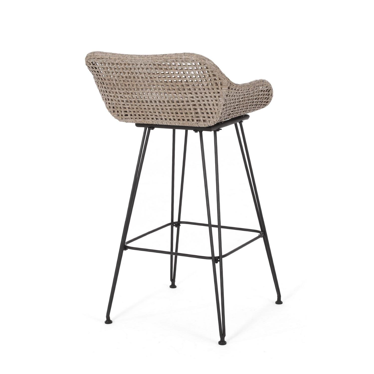 Refresh your outdoor space with a set of stools that are perfect for entertaining family and friends. Composed of beautifully woven wicker and sturdy metal hairpin legs, these transitional and understated barstools will complement any outdoor bar or dining set up, bringing a subtly upscale flair to even the most unassuming home. Each stool is topped with a cozy seat cushion that not only offers a touch of comfort but also strikes a perfect balance of classic charm and modern sophistication for all to admire.