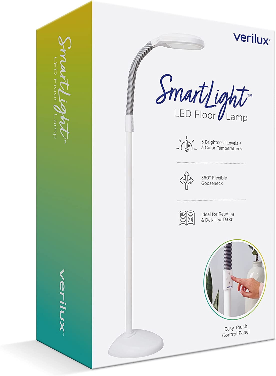 FULL SPECTRUM, LED LIGHT – Long-lasting, LED light delivers better brilliance and truer color for reading and performing detailed tasks PERSONALIZED SETTINGS – Customize your experience by choosing between 5 light intensity levels and 3 color temperature settings ranging from warm white to daylight SLEEK, MODERN DESIGN – Contemporary take on the traditional gooseneck floor lamp that fits seamlessly in any space REDUCE EYE STRAIN AND EYE FATIGUE – Mimicking natural daylight, this floor lamp is flicker-free and equipped with an Optix lens to control glare, while helping to reduce eye strain and eye fatigue LIFE IN A BETTER LIGHT – With over 60 years in healthy lighting and the creator of the original HappyLight®, our US-based team is here for you with live support and a 1-year warranty