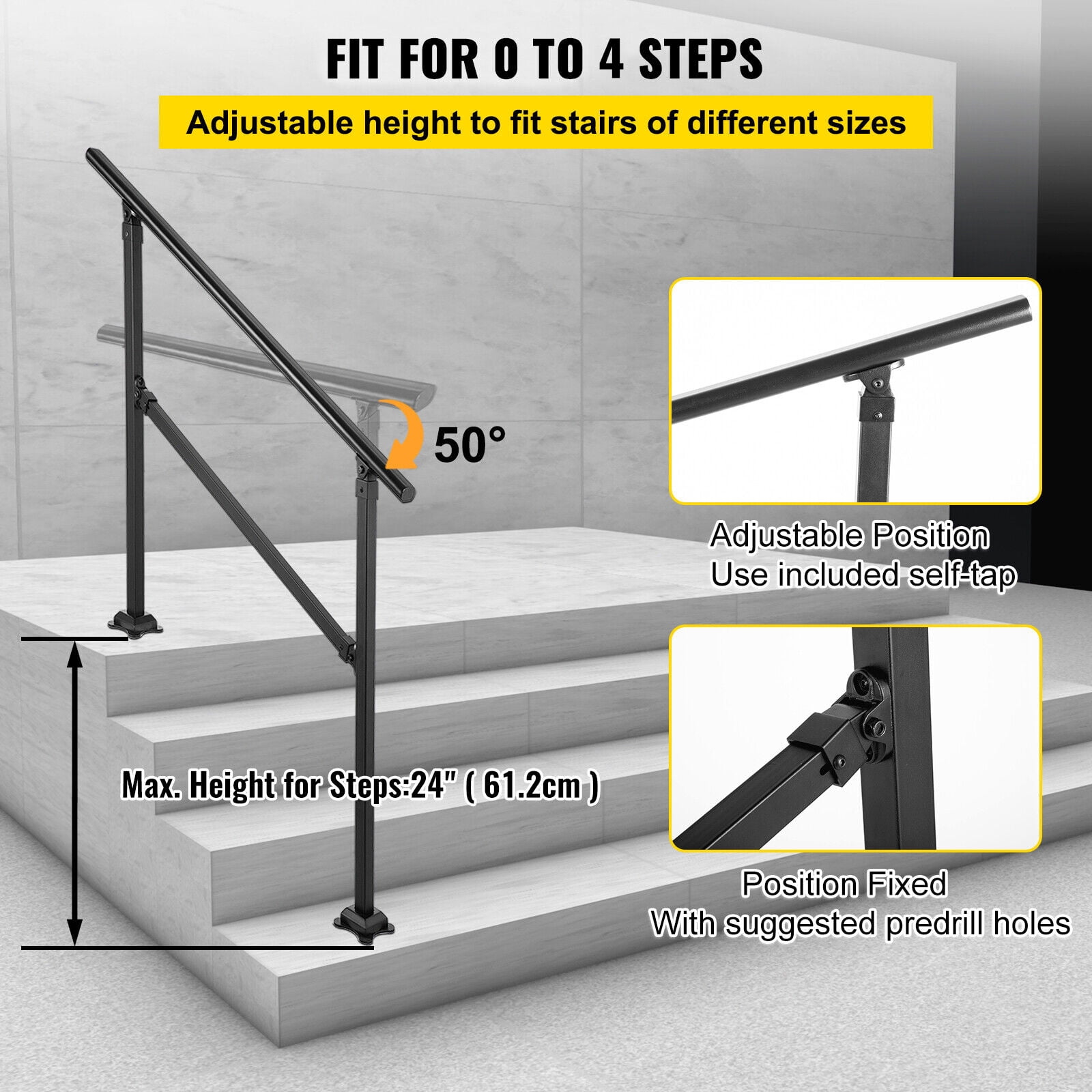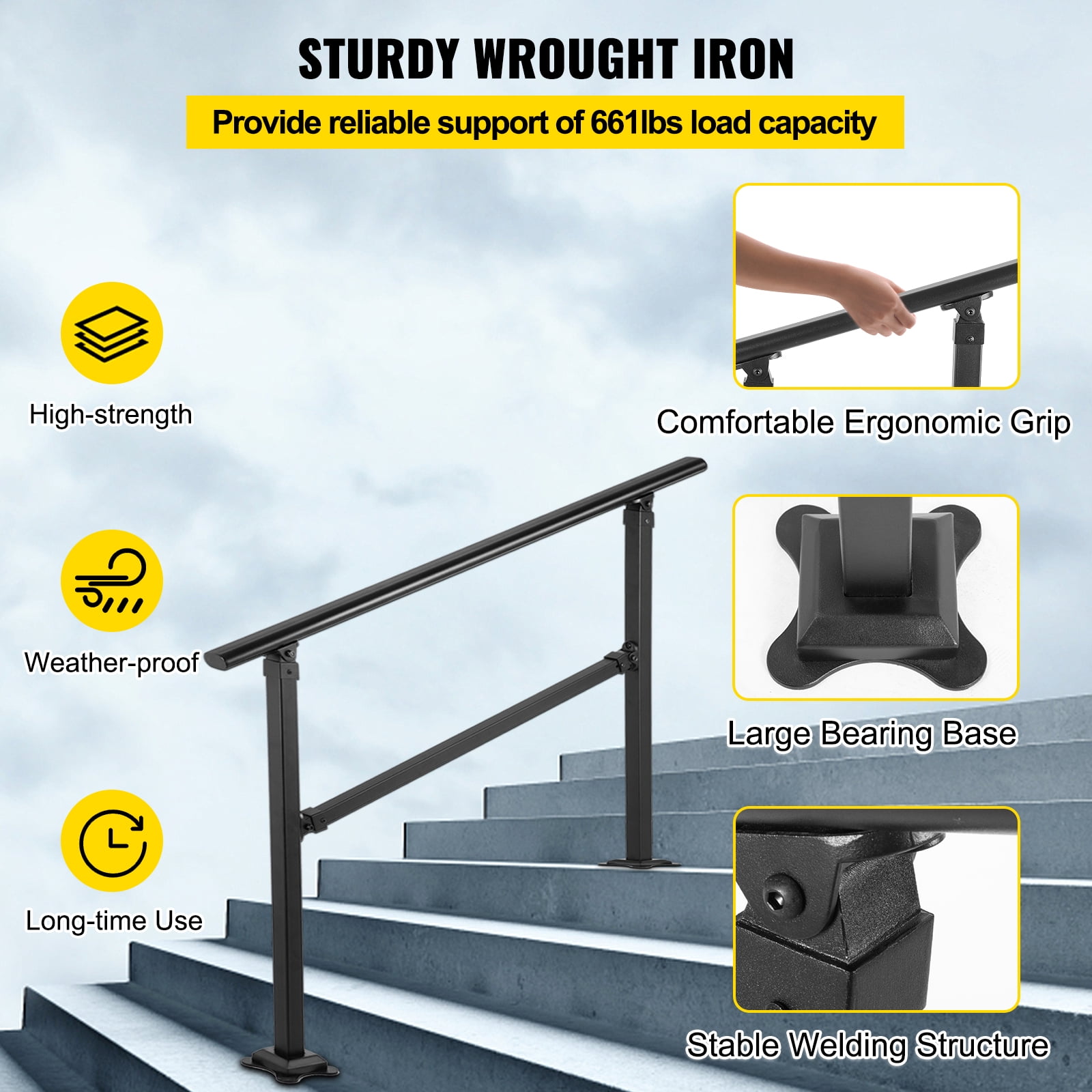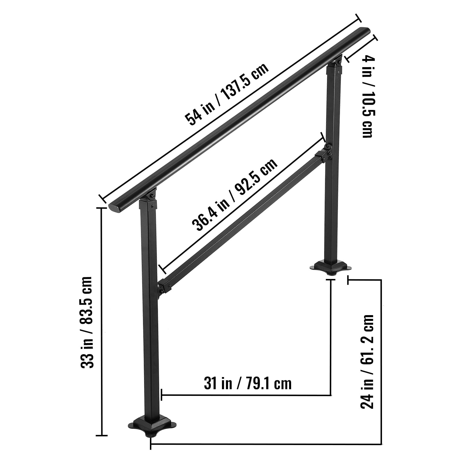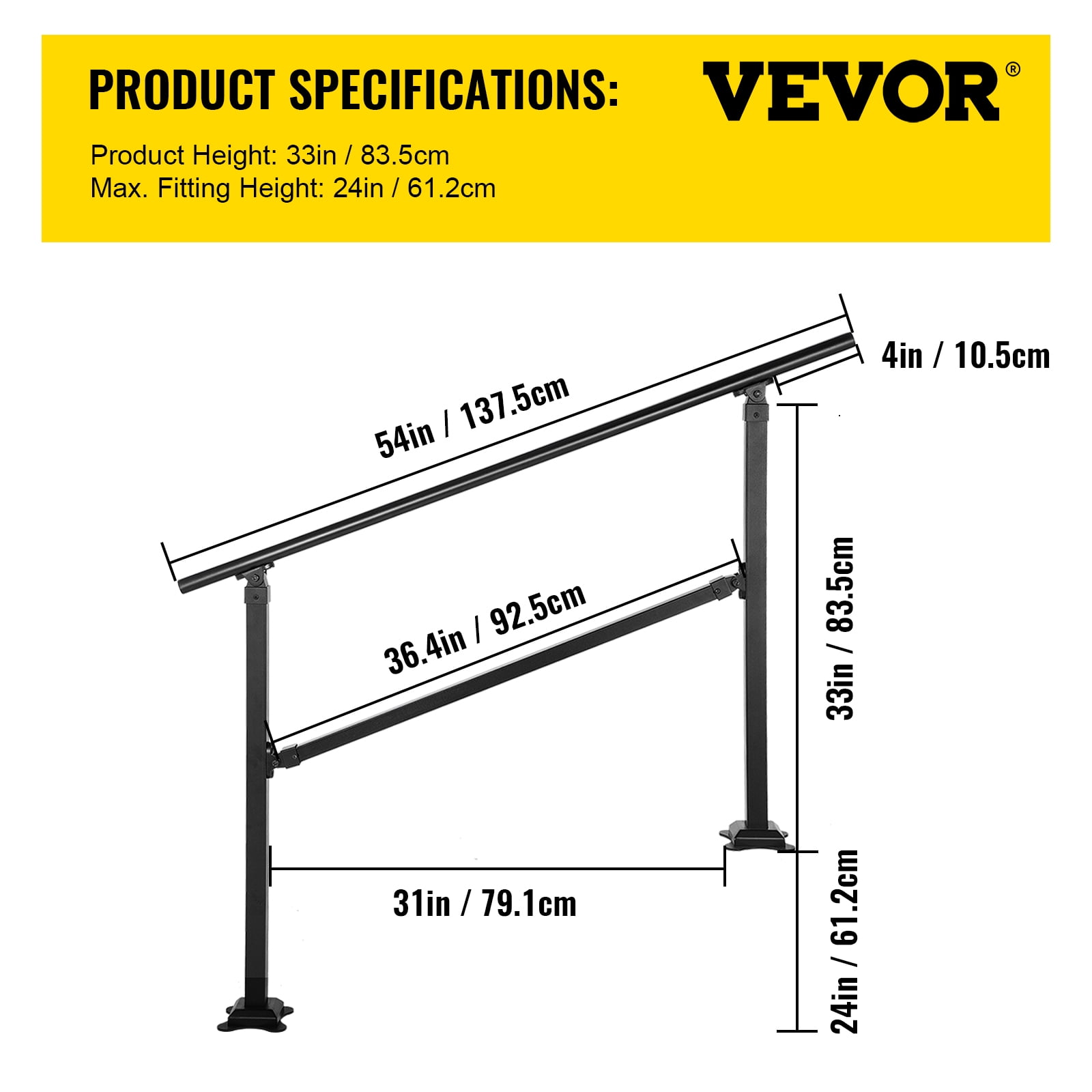 Brand Introduction VEVOR is a leading brand that specializes in equipment and tools. Along with thousands of motivated employees,VEVOR is dedicated to providing our customers with tough equipment & tools at incredibly low prices. Today, VEVOR has occupied markets of more than 200 countries with 10 million plus global members. Why Choose VEVOR? 1.Tough Quality Assurance 2.Incredibly Low Prices 3.Fast & Secure Delivery 4.30-Day Free Returns 5.24/7 Professional Customer Service Product Description Outdoor Stair Railing We provide a high-quality 1-3 steps handrail for your security and convenient daily use, especially for older people under terrible weather conditions. Using only one product can meet your current needs for different stair sizes for its adjustable heights. In addition, it is made of sturdy iron material, featuring a non-deformed performance for long-time use. Changeable for 1-3 Steps The outdoor stair railing is built to suit 1 to 3 steps. In addition, you can change the handrail to match your stairs in the range of 0 to 50 degrees. Flexible Height With a screw connection, this wrought iron handrail is height changeable to suit steps of different sizes. The max. height for stairs is 24”/ 61.2 cm. Real Wrought Iron Our exterior stair railing is constructed with actual wrought iron, ensuring it is corrosion-proof. As a result, the handrail keeps a long lifespan under various weather conditions. Easy to Assemble The handrail for the concrete step includes everything you need to finish the installation. It is simple to install and complete assembly in a few minutes. Elegant & Fashion Style The outdoor handrail is designed with a powder-coated surface, which is easy to maintain. Besides, the stylish appearance provides perfect decoration for your stairs. Versatile Uses The railings for steps are suitable for home, garden, hotel, porch, and other places with stairs or steps. In addition, it serves as a support to improve security and convenience. Specifications Model: VV-OSR-3 Material: Wrought Iron Fitting Steps: 1-3 Adjustable Angle: 0-50° Max. Height for Steps: 24”/ 61.2 cm Item Height: 33”/ 83.5 cm Item Width: 54”/ 137.5 cm Package Content 1 x Outdoor Handrail 10 x M8x60mm Screw 10 x Expansion Screw 1 x M12 Drill