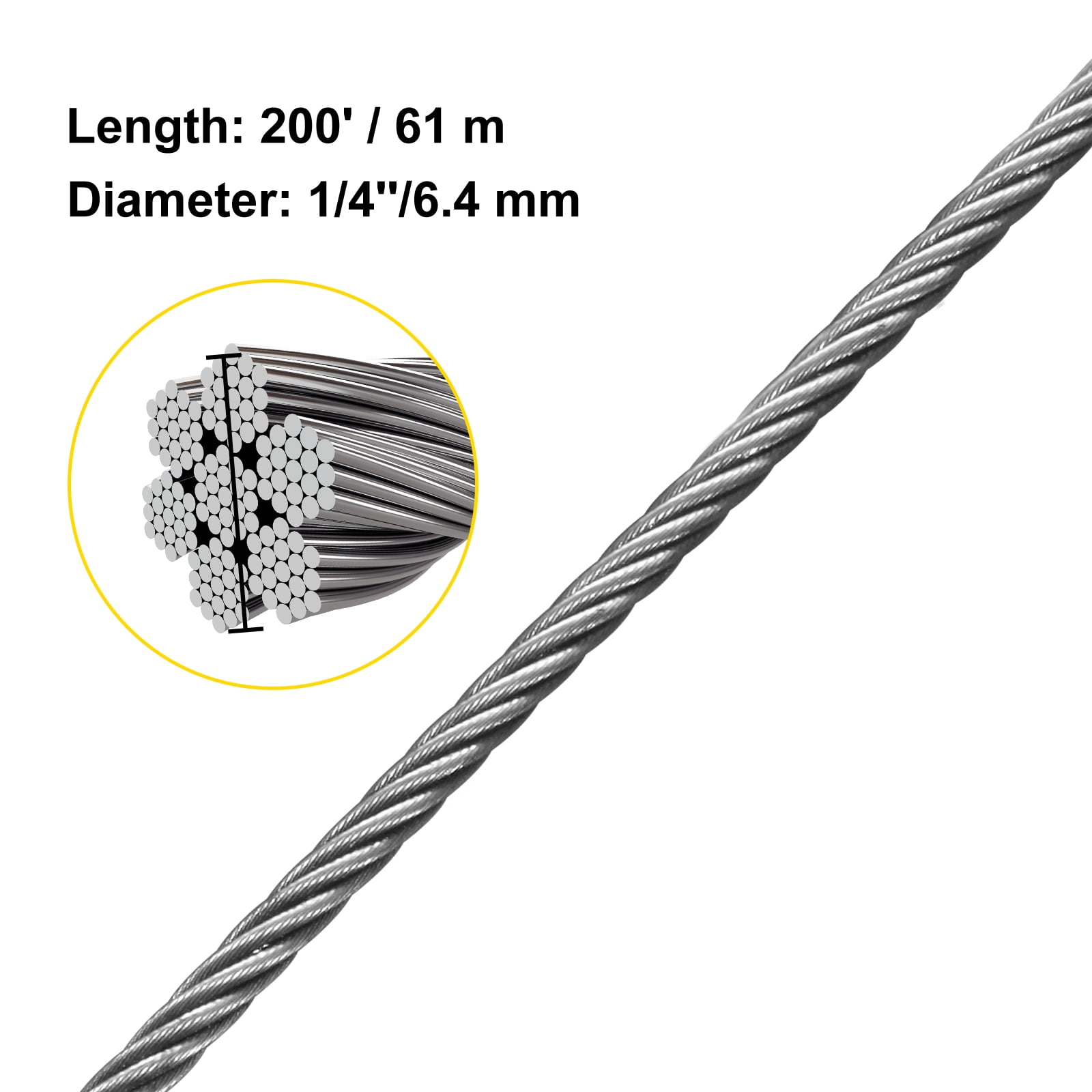 Brand Introduction VEVOR is a leading brand that specializes in equipment and tools. Along with thousands of motivated employees,VEVOR is dedicated to providing our customers with tough equipment & tools at incredibly low prices. Today, VEVOR has occupied markets of more than 200 countries with 10 million plus global members. Why Choose VEVOR? 1.Tough Quality Assurance 2.Incredibly Low Prices 3.Fast & Secure Delivery 4.30-Day Free Returns 5.24/7 Professional Customer Service Product Description T304 7×19 1/4″ Stainless Steel Cable This listing is about 304 Stainless Steel Wire Rope. In material handling machine, it is commonly used for lifting and pulling, tightening and carrying. Moreover, as a high quality product with 7 x 19 construction, it features compact struction and large bearing capacity. Easy to install, inexpensive, attractive and easy to maintain, alternative to commonly used metal and wood picket infill. 304 Stainless Steel By using high-strength, weather durable type 304 stainless steel material, it is durable, heat resistance, and features low environment requirements. Large Capacity Breaking strength of our cable wire rope is up to 5780LBS. Perfect for marine applications, such as sailboat, yacht, etc. Construction 7 x 19 Our cable wire rope has nineteen groups of seven wires which formed helical around a strand core. Solid construction makes it durable and sturdy. Smooth Surface The surface of this stainless Steel wire rope cable is smooth, highly polished and has no burr, protecting your hand and objects from hurting and damage. Reasonable Design This cable wire rope can be quickly cut into different sizes in the field according to your personal needs. Total length is up to 200Ft/61M. Enough for kinds of use. Wide Application Widely used in textile, petroleum, chemical, machinery, medicine, food, mining, military industry and other industries. Also fit for many home applications, such as zipline, clothes line, stair cabling railing, garden fencing. Specifications Diameter: 1/4″/6.4MM Construction: 7*19 Material: 304 Stainless Steel Length: 200Ft/61M Breaking Strength: 26.3kn/5780LBS Packing Weight: 10kg/22lb Magnetism: Yes Package Content 1 x Stainless Steel Cable Wire Rope