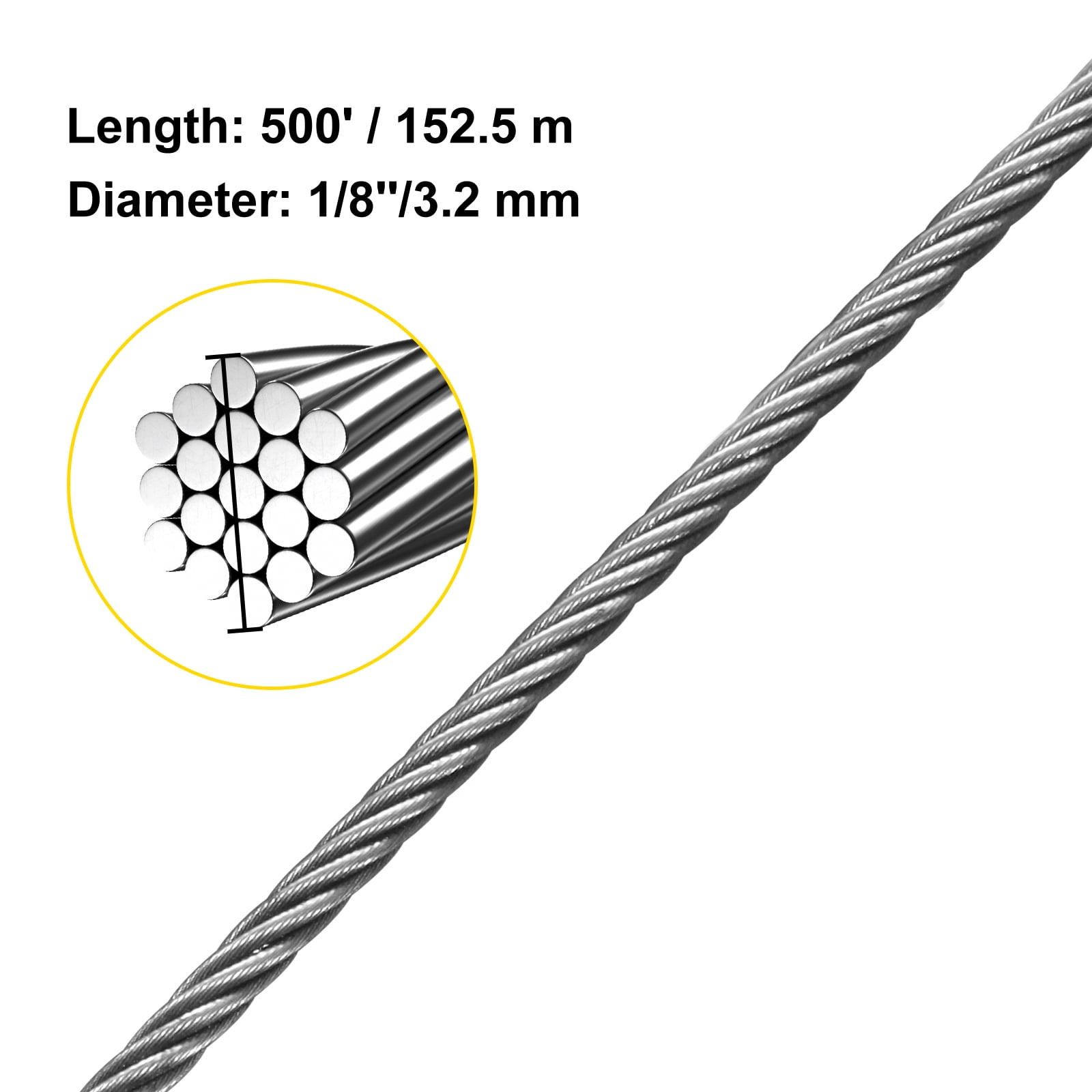 【1760 LBS BREAKING STRENGTH】- Length: 500 ft. Diameter: 1/8 inch. Our wire rope has a breaking strength of 1760 lbs and a working strength of 1320 lbs. It allows for a variety of hanging, strapping and DIY activities. 【T316 STAINLESS STEEL】- Our wire rope cable is made of high-strength 316 stainless steel material, enhancing the resistance to wear, rust, and other corrosion and ensures durability and longevity. 【1×19 CONSTRUCTION】- Constructed of 1×19 construction, 1 group of 19 strands braided together to form the cable, this braided steel wire has a strong enough core to ensure long service life and can be cut to any size without loosening the joint. 【SAFE TO USE】- The stainless steel rope features a smooth surface, high polish, and no burr, protecting your hand and avoiding hurting and damaging your belongings. A wire cutter, 20pcs of the aluminum sheath, and 10pcs of capels are included. 【MULTIPURPOSE WIRE ROPE】- Our wire cable is perfect for indoor and outdoor use. It is a multifunctional wire rope that can meet your daily needs, like garden fencing, supporting your plants, stair handrails, string lights, clothesline, etc.