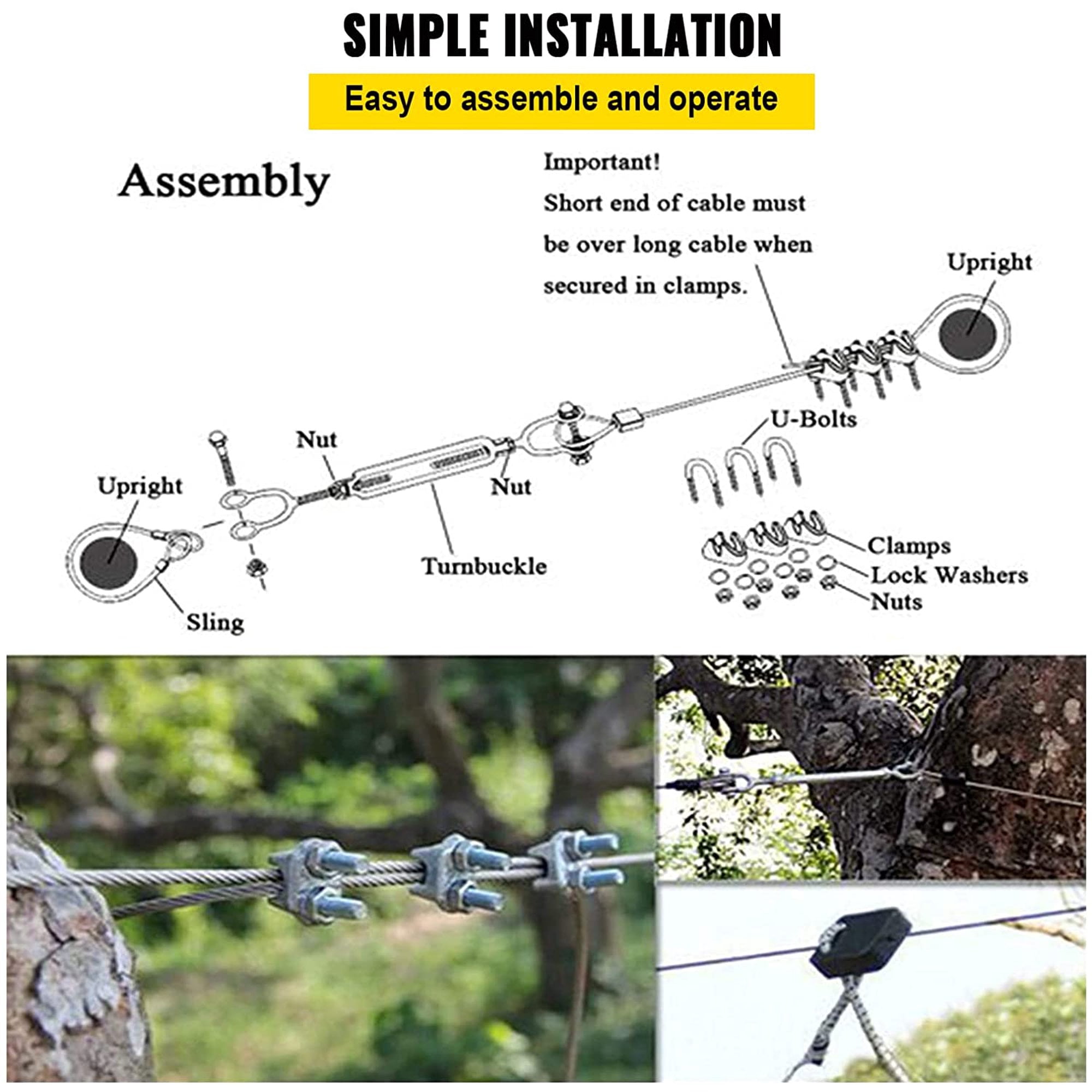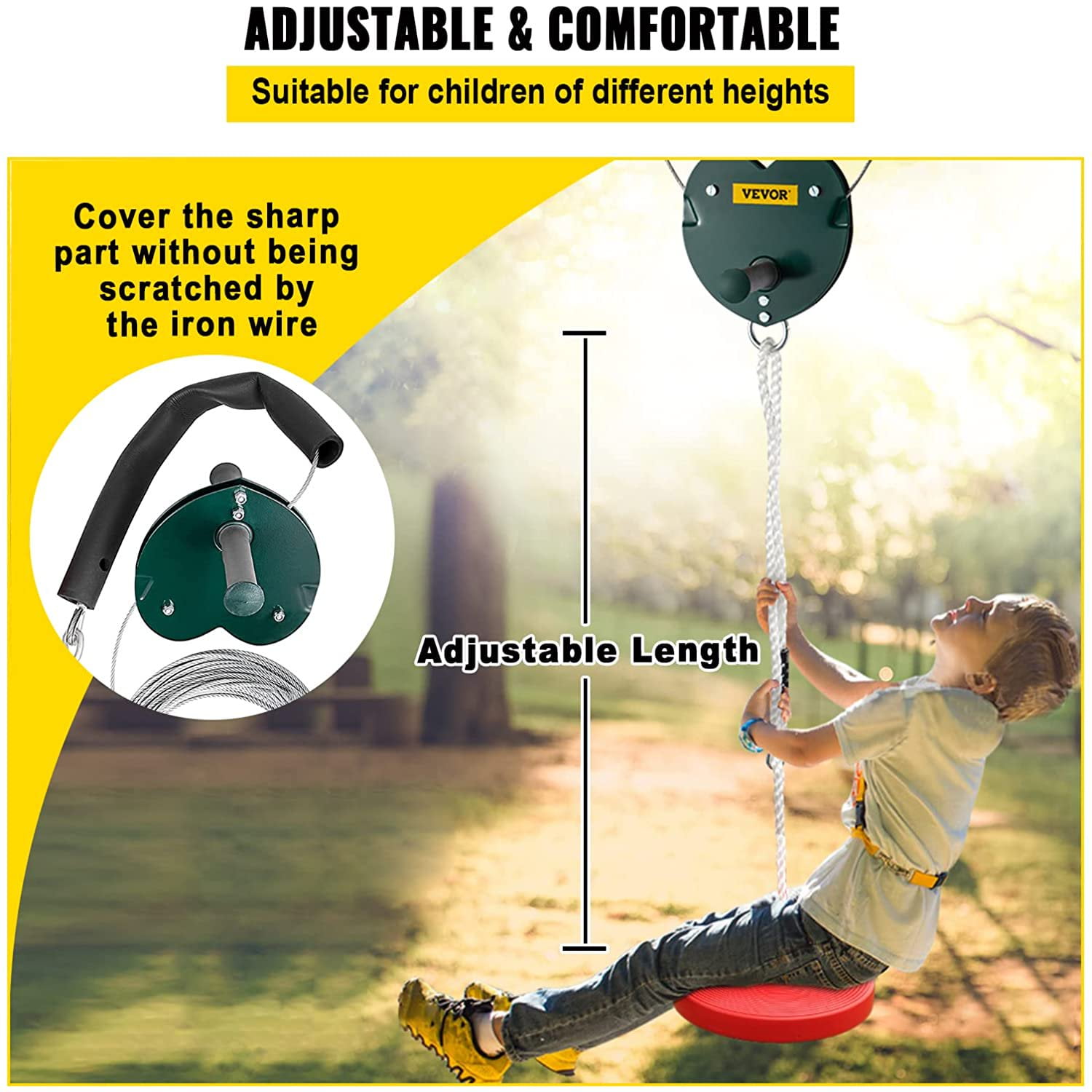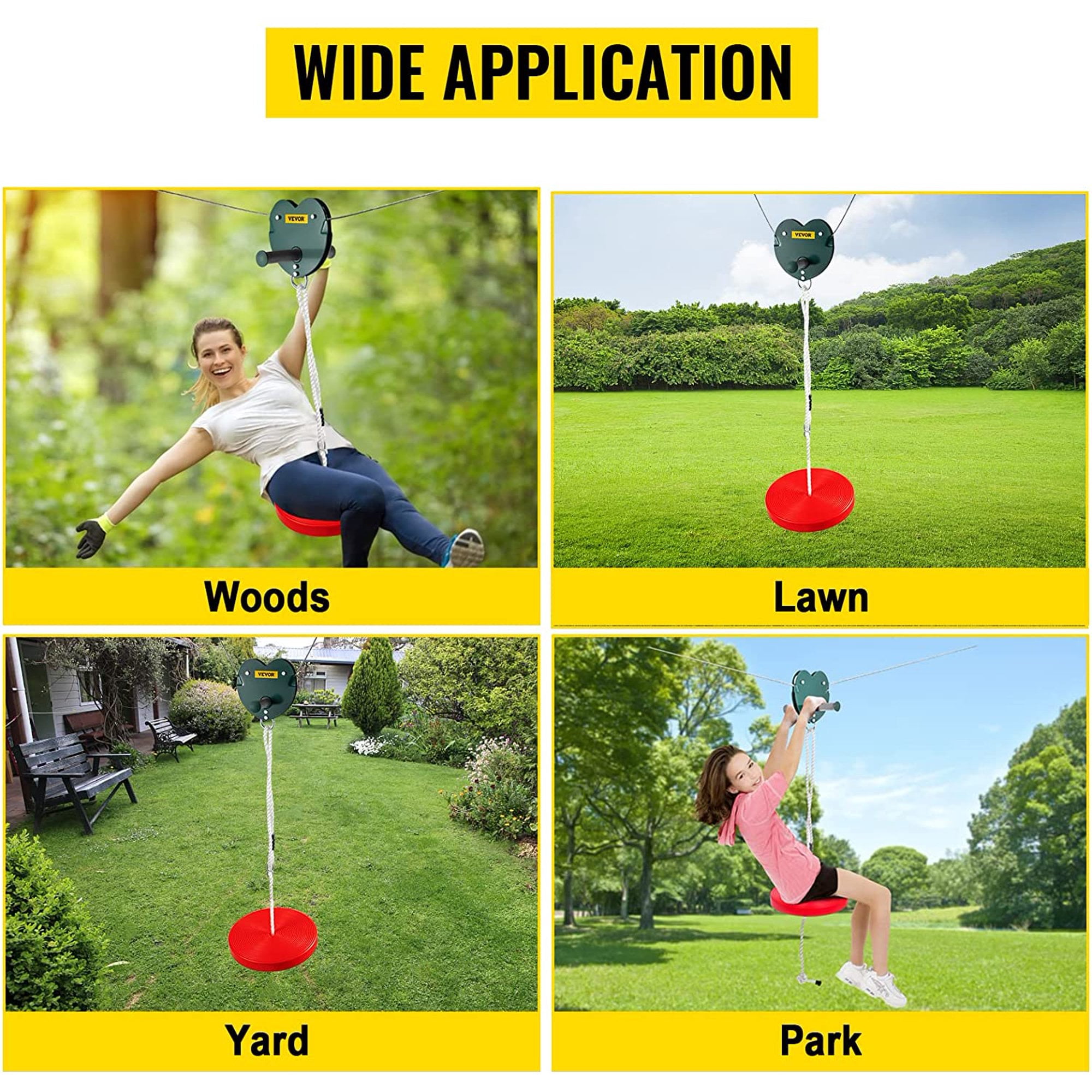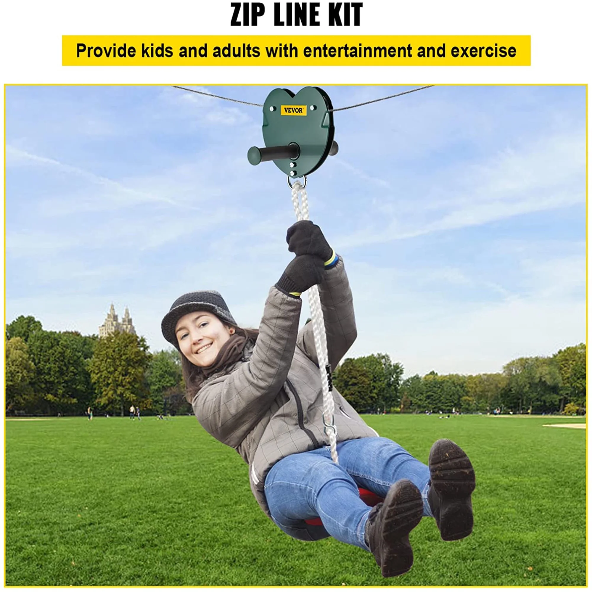 Brand Introduction VEVOR is a leading brand that specializes in equipment and tools. Along with thousands of motivated employees, VEVOR is dedicated to providing our customers with tough equipment & tools at incredibly low prices. Today, VEVOR has occupied markets of more than 200 countries with 10 million plus global members. Why Choose VEVOR? 1.Tough Quality Assurance 2.Incredibly Low Prices 3.Fast & Secure Delivery 4.30-Day Free Returns 5.24/7 Professional Customer Service Product Description100FT Seated Zip line Kit Surprise your child by turning your backyard into a playground. Our zip line kit is a wonderful outdoor toy and a great birthday gift that will help you bond with your beloved kids. You and your kids can have fun the day you receive our products. Moreover, it improves kids’ balance, coordination, and strength while riding just a few feet off the ground. Safety Comes First Zip lines for adults are constructed of ultra-strong, steel trolley and 304 stainless steel cable and designed for long service life—capacity up to 250 lbs. You and your kids will have endless sliding fun with no worry. Hassle-free Assemble Since the trolley included in the package is already fully assembled, this comfortable and ultra-fun kids zipline can be set up and easily installed in minutes. Feel free to set up this zipline for kids with your clever little ones. Adjustable Seat Zip line seat of this kit is designed to be adjustable for kids of different height. The rope knot adjusts perfectly to kids’ height. You and your kids can have fun the day you receive our products. Comfortable Grip Ziplines for backyards are specially designed with anti-slide rubber handles to help riders keep a firm hold on the zip line while sliding. Just make sure kids hold the handles tightly. Everything You Need We have everything you need for a zip line kit: an 80 ft main cable, a 4.7 ft sling cable, a trolley, a seat, and other accessories. Please do not put it too high, make sure the seat is within 4 ft from the ground. Wide Application Perfect for kids, teens, and adults. The kids zip line kit for backyard can be set up at the backyard, lake, park, or anywhere with tall and strong trees. Check it every time before use. Adult supervision is necessary. Specifications Cable Material: Steel Max Capacity: 113.4 kg/250 lb Main Cable Length: 100 ft/30 m Sling Cable Length: 4.7 ft/1.42 m Packing Weight: 4.3 kg/10 lbs Package Content 1 x 100 ft Main Cable 1 x 4.7 ft Sling Cable 1 x Round Seat 1 x Trolley U clamps