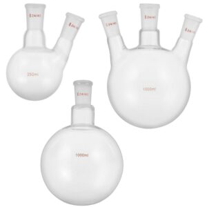 – What You Will Get: 1-neck/3-neck round bottom flask(1000 ml), 2-neck round bottom flask(500 ml), Liebig condenser (300 mm), separator funnel (250 mm), 4 pcs adapters, Celsius thermometer(200 ), tube, plastic clips. Start your experiment with these devices!