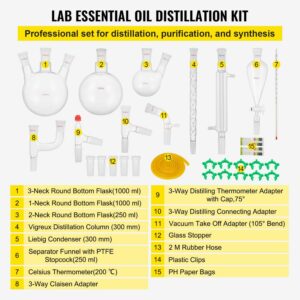 – Reliable Flasks & Condensers: 250/1000 ml round bottom flasks have a large heating surface and uniform heating. The Liebig condenser has great cooling performance, and the Vigreux distillation column can separate two parts of a mixture. All the accessories will help you a lot!
