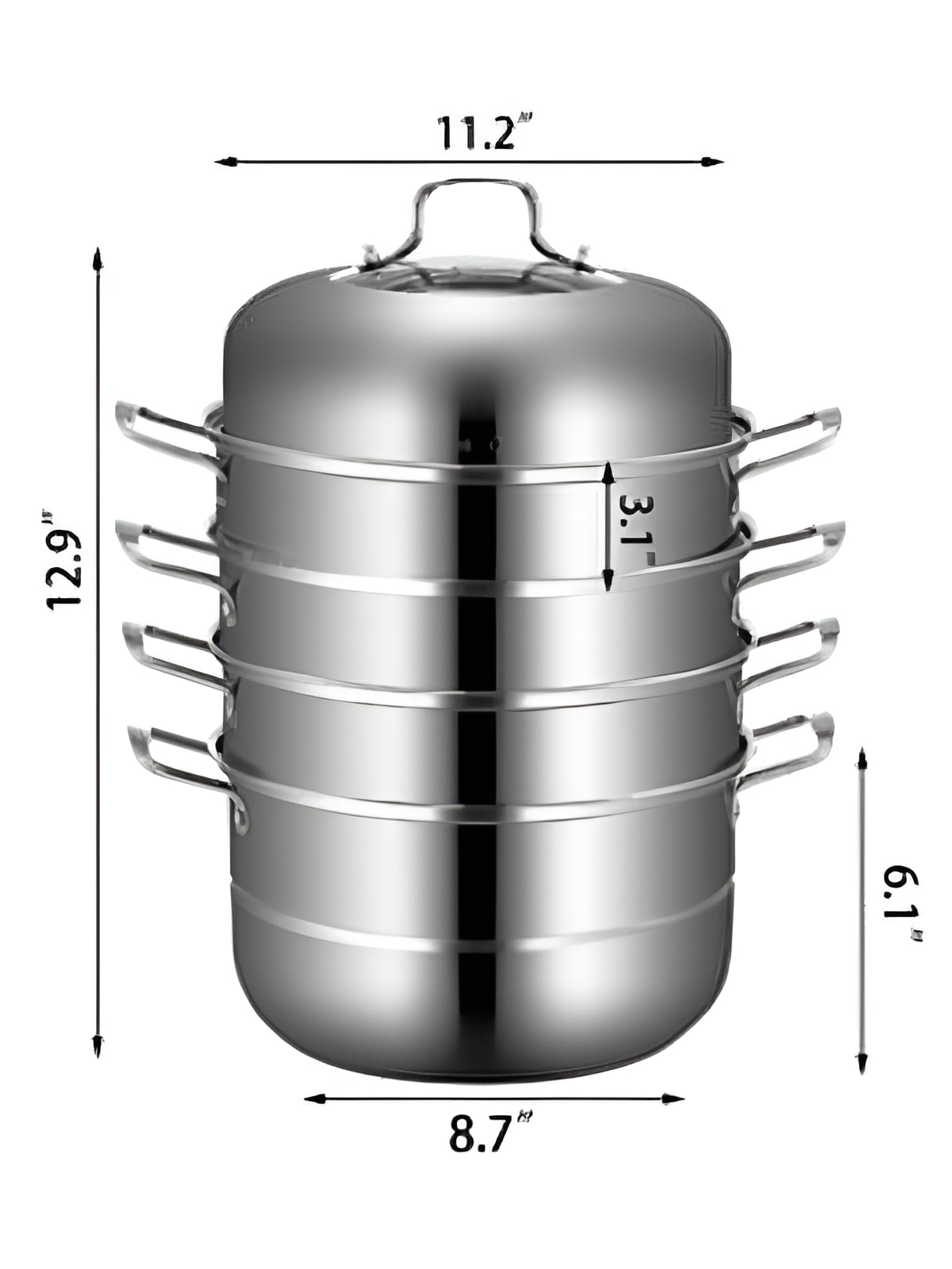 Product Description 5-Tier Stainless Steel Steamer Steaming is a healthy way of cooking vegetables, dumplings, rice, and fish without losing any of the goodness. You can enjoy nutritious and delicious food with this stainless steel steamer. It is made from 304 food-grade stainless steel, with a three-layer composite bottom, making it suitable for all hob types, including gas, ceramic, halogen, etc. This superior steamer set has five steamer tiers, providing a larger cooking space for you. 5-Tier Capacity This multifunctional stainless steel steamer comes with five tiers of steamers, with a diameter of 11.0-inch (28 cm). With a total capacity of 30.6 Qt, each layer can provide a large capacity of 5.2 Qt, and the bottom pot can hold up to 7.5 Qt capacity. Steaming and stewing can be achieved simultaneously. Food-Grade Stainless Steel The steamer pot for cooking is made of 304 food-grade stainless steel, featuring an integrated molding process, which is easy to clean up and keeps its good looks even after years of use. The fully polished stainless steel gives a classy appearance. Multiple Stoves Compatible The bottom of the pot adopts a three-layer composite structure, with excellent heat-collecting ability. The enhanced thermal-magnetic function makes it suitable for most stoves, including gas stove, induction cooker, ceramic stove, etc. Considerate Steaming Grid The uniformly distributed hollow holes can increase the throughput of steam, and shorten the cooking time. The grooved design can make the steam water flow away along the diversion track, preventing water from accumulating on the food. Heightening-Designed Lid The heightened lid design (3.5″/90 mm) provides more space for foods. The transparent tempered glass in the middle makes it easy to observe the food status in time. The ventilation holes on the side of the cover facilitate the air-pressure adjustment. Space-Saving Design This multifunctional steamer set contains one bottom pot, three steamer pots, two septa, and a lid. They can be combined at will to suit your needs. Stacking them properly will save a lot of storage space in your kitchen. Specifications Material: Stainless Steel + Tempered Glass Diameter of Pot Bottom: 8.7″ (22 cm) Diameter of Each Tier: 11.0″ (28 cm) Height of Stockpot: 6.1″ (15.5 cm) Height of Each Tier: 3.1″ (8 cm) Height of Pot Lid: 3.5″ (9 cm) Diameter of Septa: 11.2″ (28.5 cm) Package Content 1 x Stock Pot 3 x Steamer Pots 1 x Pot Lid 2 x Septa