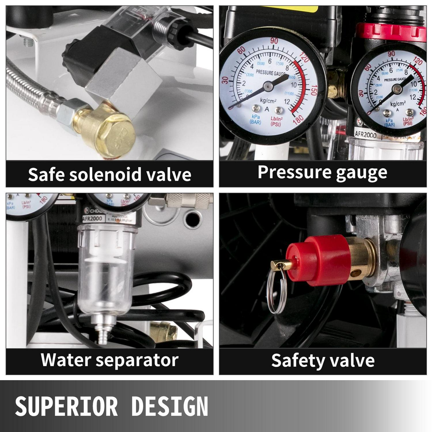 – SUPERIOR DETAILS – The ultra-quiet compressor features a safe solenoid valve, pressure gauge, safety valve, water separator, and drain valve. They are designed for thermal protection, convenient operation, and stronger power.