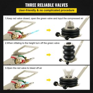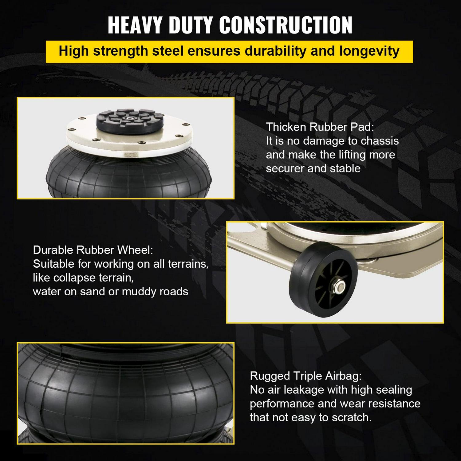 – Heavy Duty Construction: Our pneumatic jack is a high-strength steel that makes the whole body sturdy and durable. Highly sealed airbags will not leak or be scratched. In addition, our wheels are better suitable for all-terrain, helping you maintain your car anytime, anywhere.