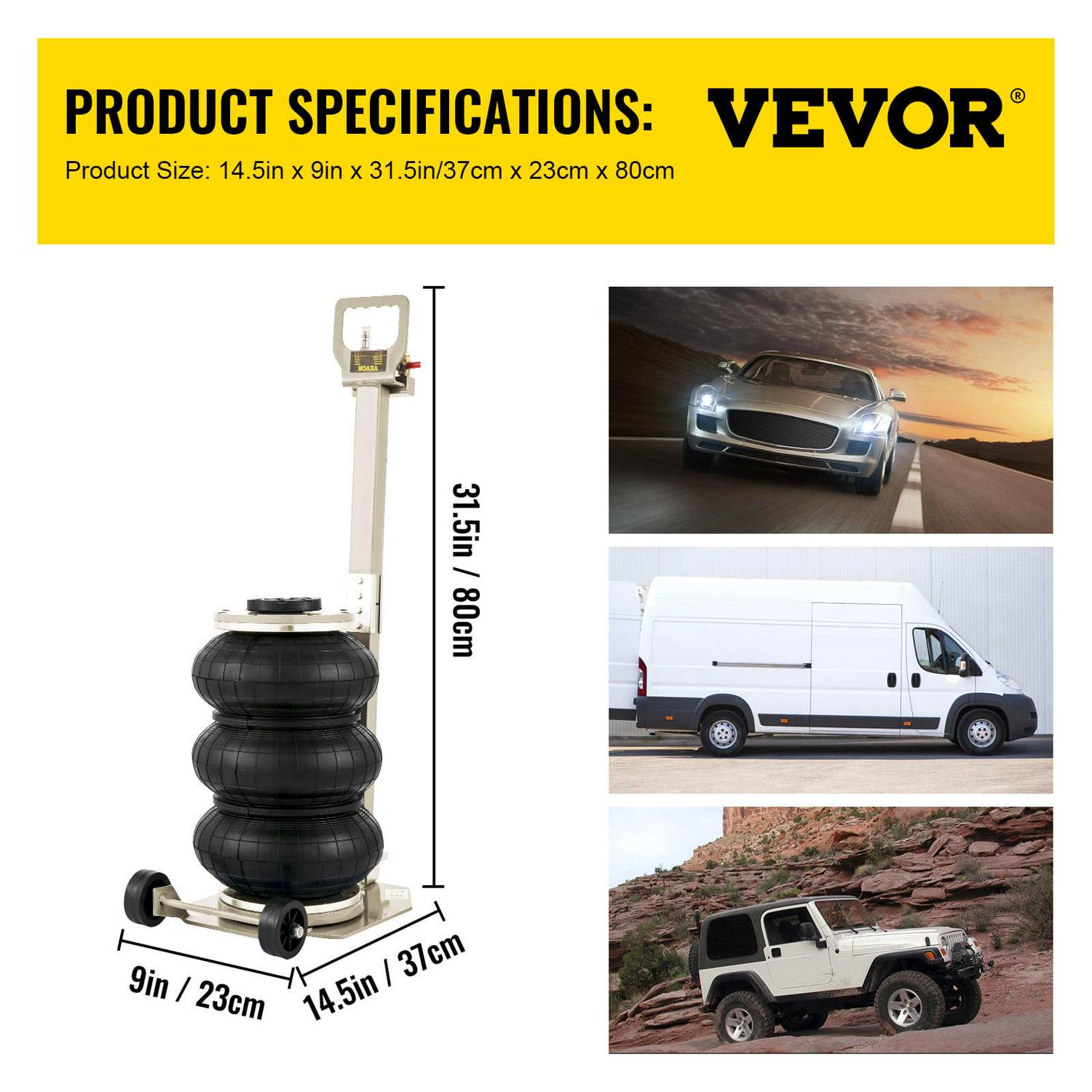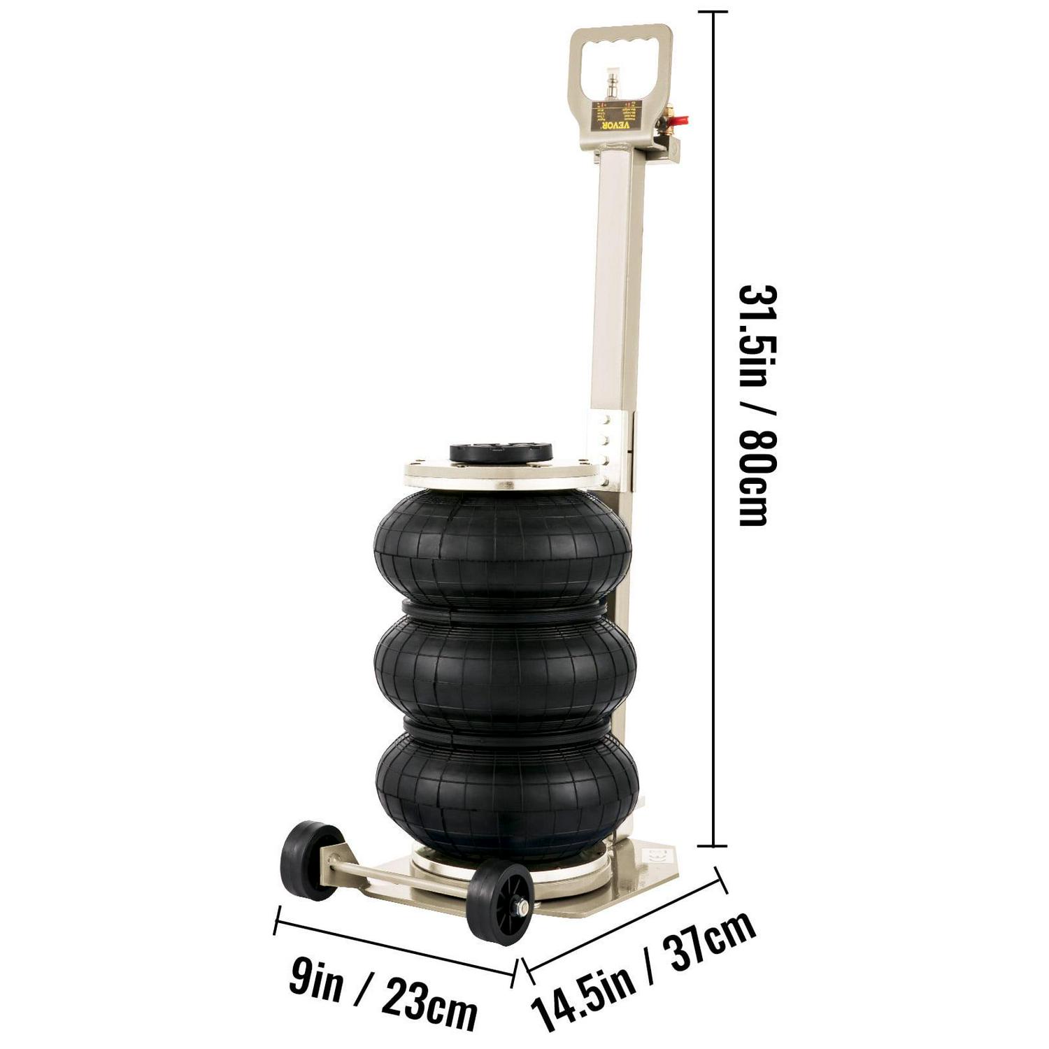 – Labor-Saving Jack: The pneumatic jack capacity: 6600 lbs/3T. Minimum height: 5.9″/ 150 mm. Maximum height: 15.75″/400 mm. It only takes 5 seconds to lift. Working Temp: -60 ~ 50 . Air inlet: G1/4. Our triple bag jack is the easiest and fastest way to make the car lifted.