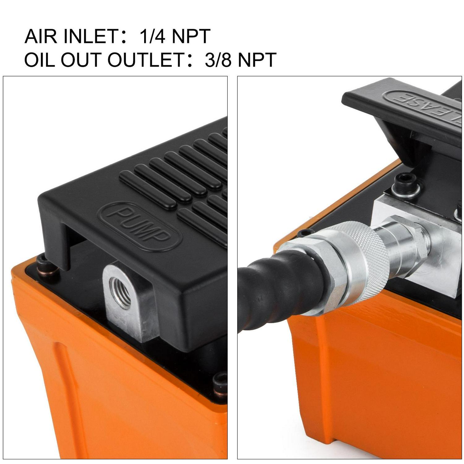 The air hydraulic pump features a 1/4 NPT air inlet and a 3/8 NPT oil outlet with 90-145 PSI (minimum 90+), which will not leak oil easily and is abrasion-resistant.