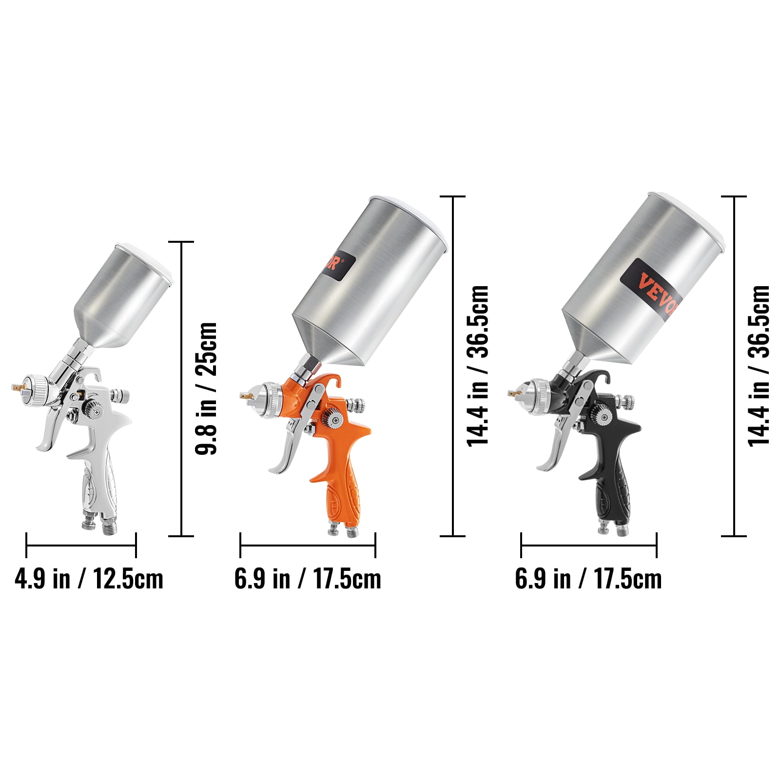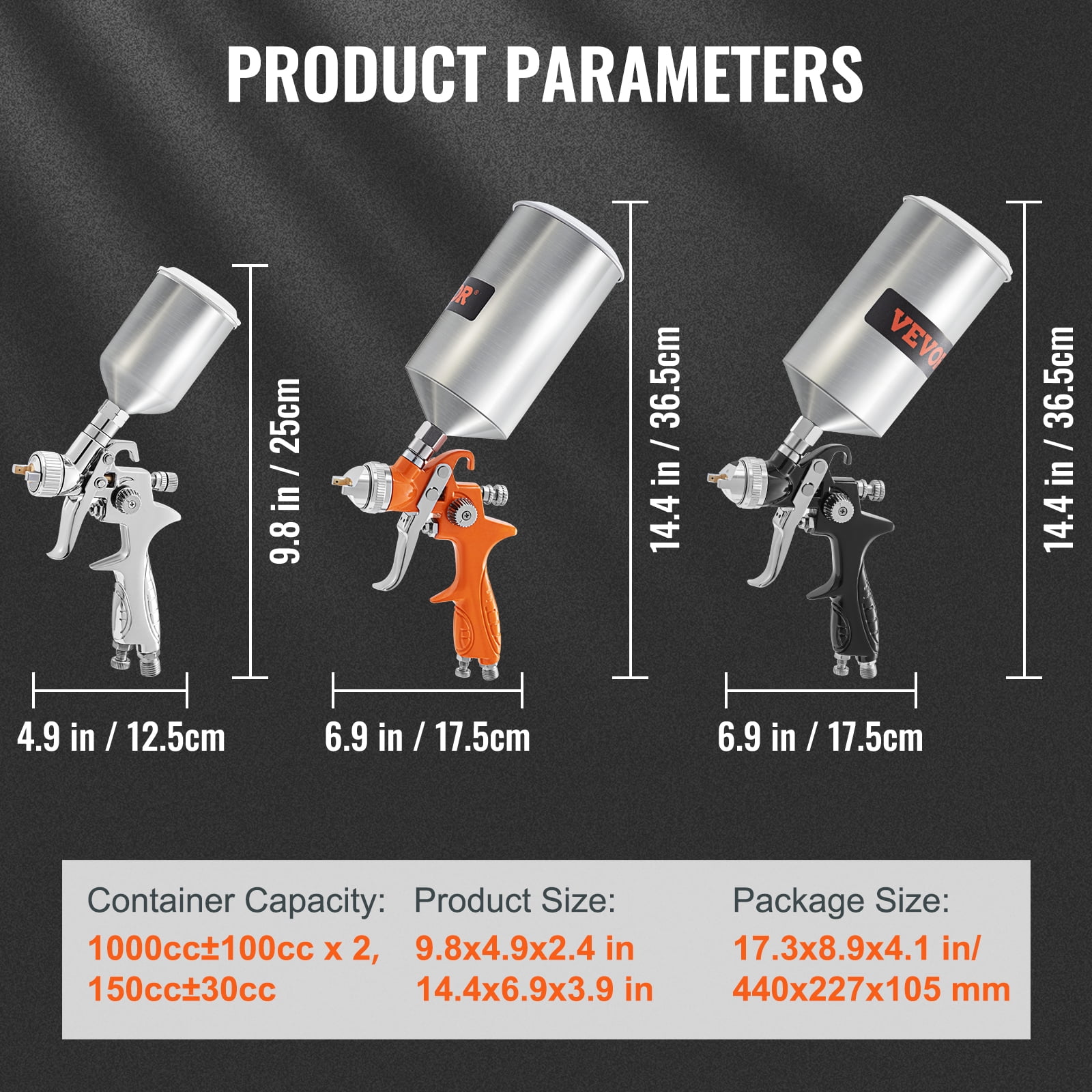 Brand Introduction VEVOR is a leading brand that specializes in equipment and tools. Along with thousands of motivated employees,VEVOR is dedicated to providing our customers with tough equipment & tools at incredibly low prices. Today, VEVOR has occupied markets of more than 200 countries with 10 million plus global members. Why Choose VEVOR? 1.Tough Quality Assurance 2.Incredibly Low Prices 3.Fast & Secure Delivery 4.30-Day Free Returns 5.24/7 Professional Customer Service Product Description Air Spray Gun 1.0mm/1.4mm/1.8mm & 150ml*1+1000ml*2 3 Different-Size Nozzles 1.0mm – detail touch-up; 1.4mm fluid tip – base coats, clear coats, and other light to medium viscosity materials; 1.8mm – primers, sealers, topcoats, and other med- to hi-viscosity paint coatings. Professional Tool Kit The water oil separator filter releases unwanted liquid for long-lasting use. Extra filters, an air regulator, and a cleaning set fully meet your needs. Adjustable Amplitude & Velocity You can achieve precise paint work by adjusting the anti-slip knob to control the coating speed and fluid. Car Painting Suitable for automotive body coating, smooth and uniform. Furniture Painting Refinish all your woodwork furniture wonderfully. Fence Painting Update your railing with paint, from rusty to brand new. Specifications Nozzle Size: 1.0/1.4/1.8 mm Cup Capacity: 1000/150 ml Operation Pressure: 50 psi Air Consumption: 7 CFM Product Weight: 5.3 lb/2.4 kg Product Size: 14.4×6.9×3.9 in/365x175x100 mm Package Content 3 x Spray Guns 3 x Wrenches 6 x Mesh Filters 1 x Brush 1 x Separator Filter 1 x Pressure Gauge 1 x Tape 3 x Connections 1 x User Manual