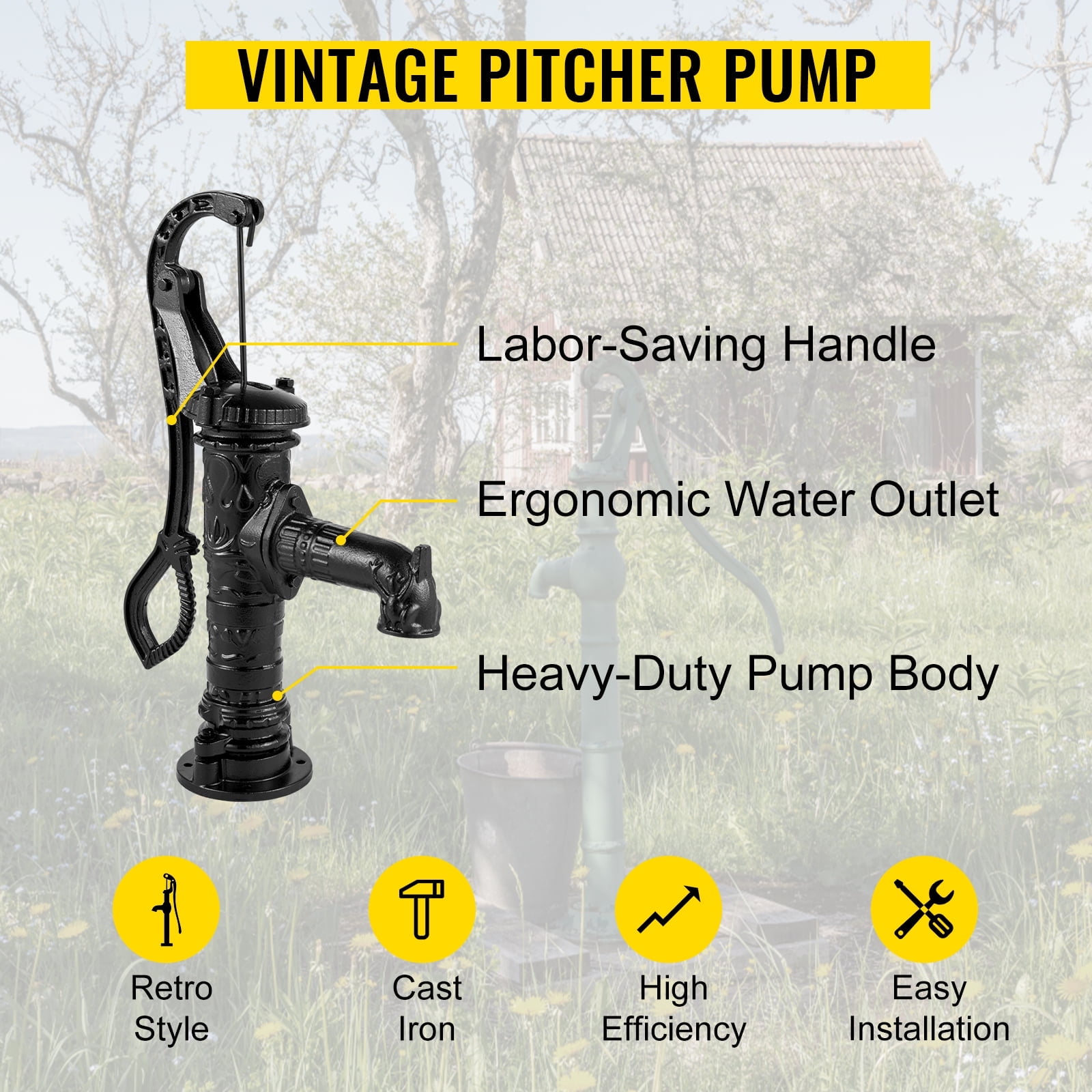 The pump is made of cast iron and adopts a retro design with a large water flow and labor-saving operation. There are smooth spray paint on surface against rust and pre-drilled holes at the bottom for easy installation. It will add a unique accent to your garden, pond, and yard.
