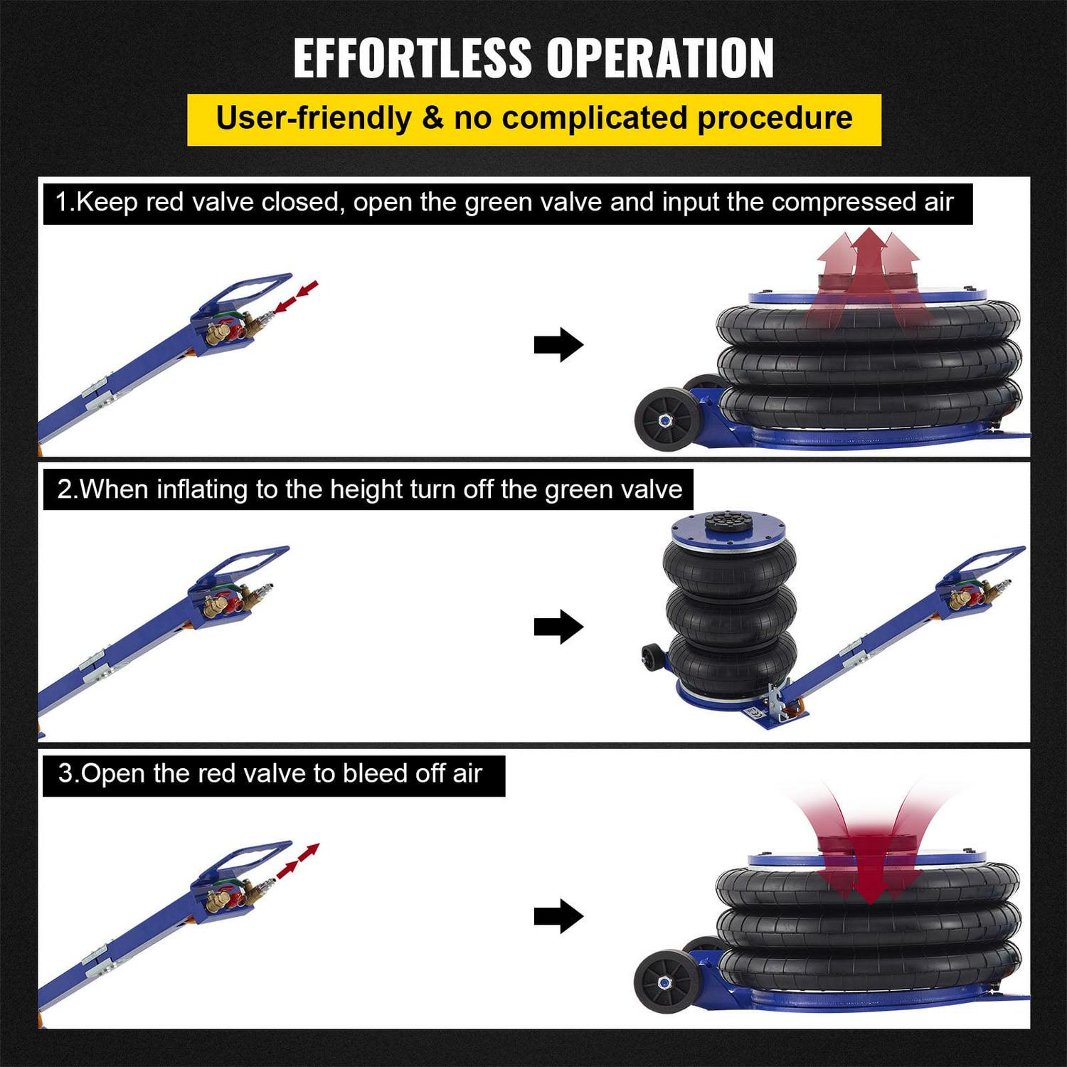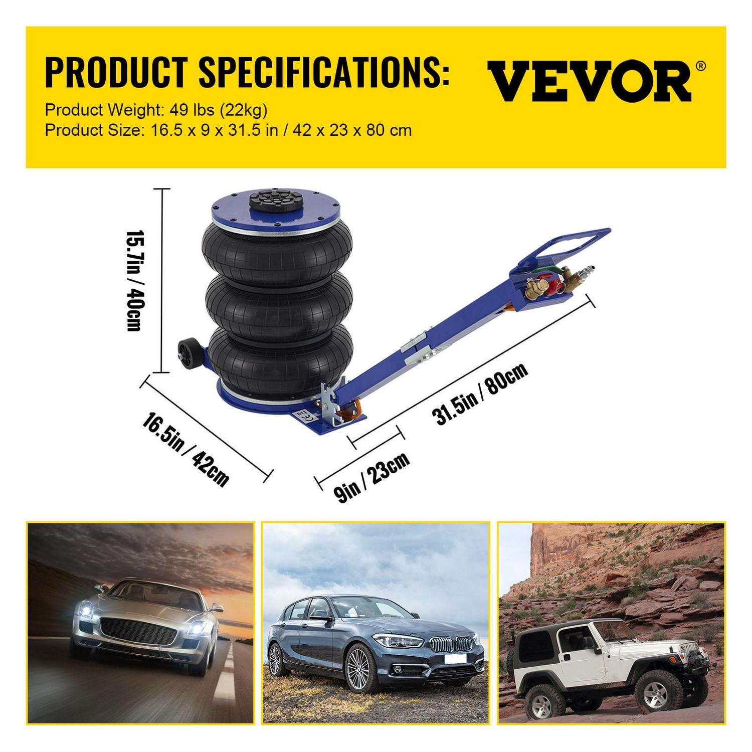 – Easy to Use: The airbag jack is powerful and very fast to use. The triple bag jack is the easiest and fastest way to make the car lifted. It inflates with compressed air.