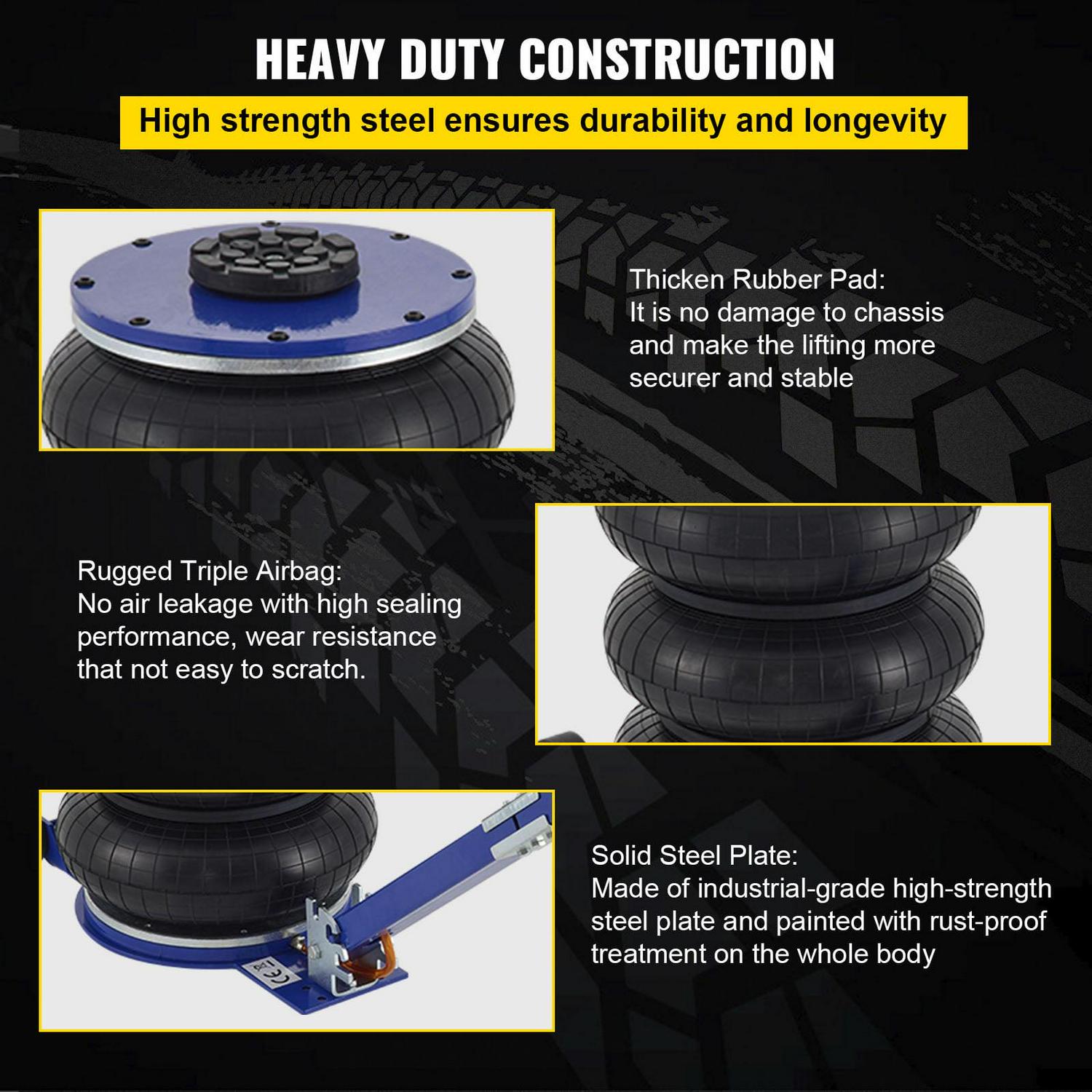 – Heavy Duty Construction: The pneumatic jack is made of high strength steel, the whole body is sturdy and durable. The solid construction also provides lateral and vertical stability.