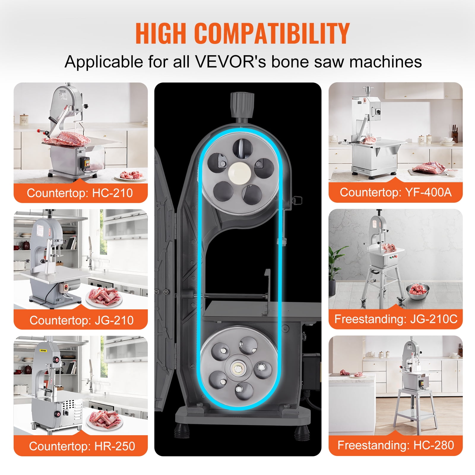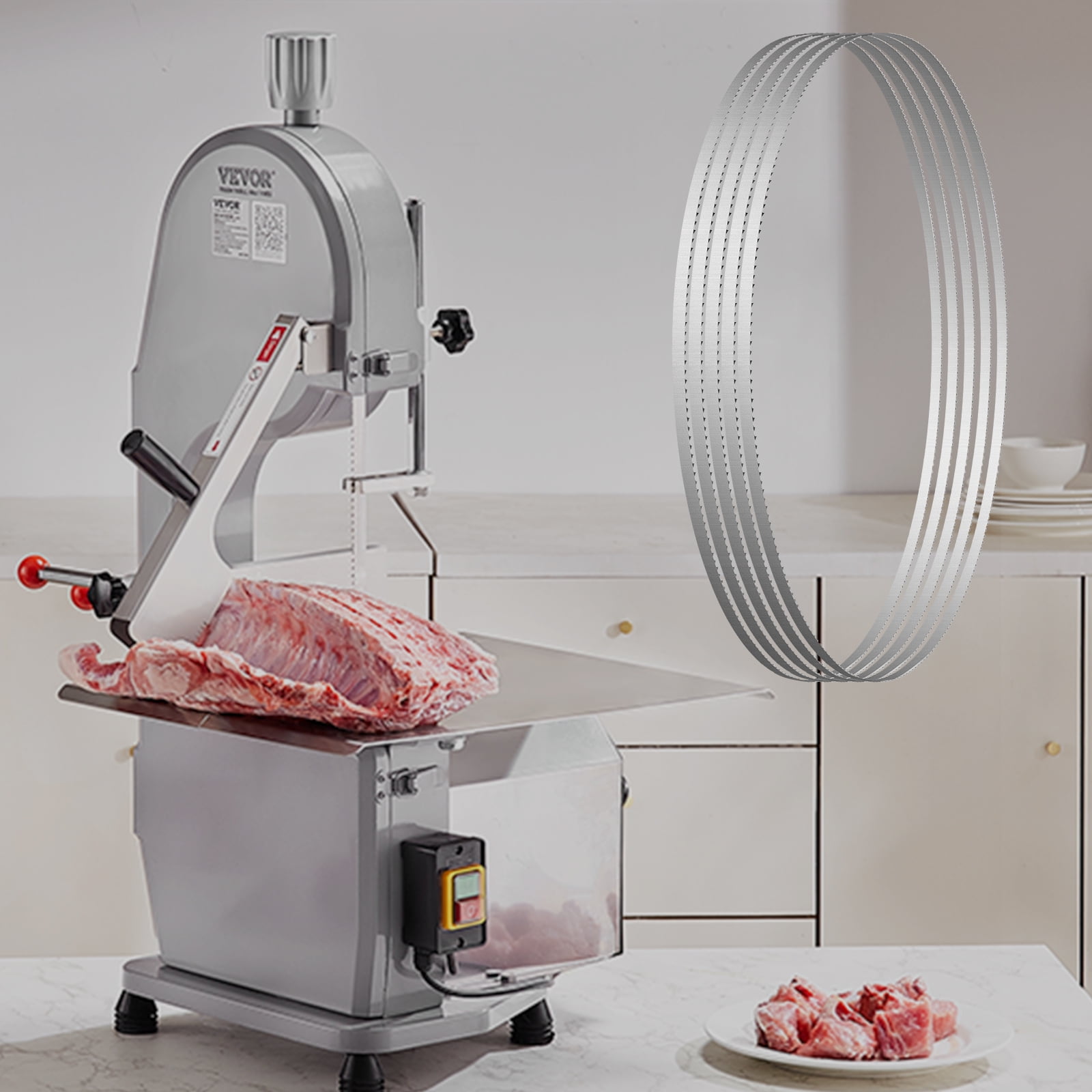 Product Description Band Saw Blades Make precise portions and smooth cuts of meat & bones with VEVOR band saw blades. If your blade is no longer making clean cuts and has become dull, this saw blade is an ideal replacement. The high-strength carbon steel makes cutting through frozen meats and bones effortless. And it is also labor-free to clean the bone dust and to install onto your machines. Saw Blade A saw blade that cuts through meat and bone with precision and smoothness. If your saw blade no longer cuts cleanly and has become dull, this blade is the ideal replacement. Sharp Serrations The saw teeth are high-frequency hardened and sharp enough to cut through almost any kind of food. Large lamb shank bones and beef shank bones can be put down for cutting. Thin to ham slices, thick to large bones, all can be done brilliantly. Durable Carbon Steel Compared to those that break easily, our meat band saw blades are made of high strength carbon steel with seamless welding technology for upgraded hardness and greater durability. 5 PCS for Replacement A pack of 5 bandsaw blades makes it easy to replace worn out bandsaw blades on your meat bandsaw machine. In addition, they are individually wrapped in rust-proof paper to ensure their integrity. Wide Compatibility Generally compatible with our tabletop bone sawing machine models: HC-210, HC-250, YF-400A, and vertical bone sawing machine model: HC-280. It is easy and quick to replace. Extensive Applications These band saw blades can be widely applied to cut hard bones, frozen meat & fish, ribs, chicken, etc. Suitable for commercial places like the central kitchen, butcher’s shop, food processing factory, and slaughterhouse. Specifications Item Model Number: S-1650 Main Material: Carbon Steel Product Weight: 1.3 lbs / 0.6 Kg Compatible Models Tabletop Bone Sawing Machine: HC-210, HC-250, YF-400A Vertical Bone Sawing Machine: HC-280 Product Dimensions: 65 x 0.63 x 0.02 inch / 1650 x 16 x 0.56 mm Package Content 5 x Band Saw Blades