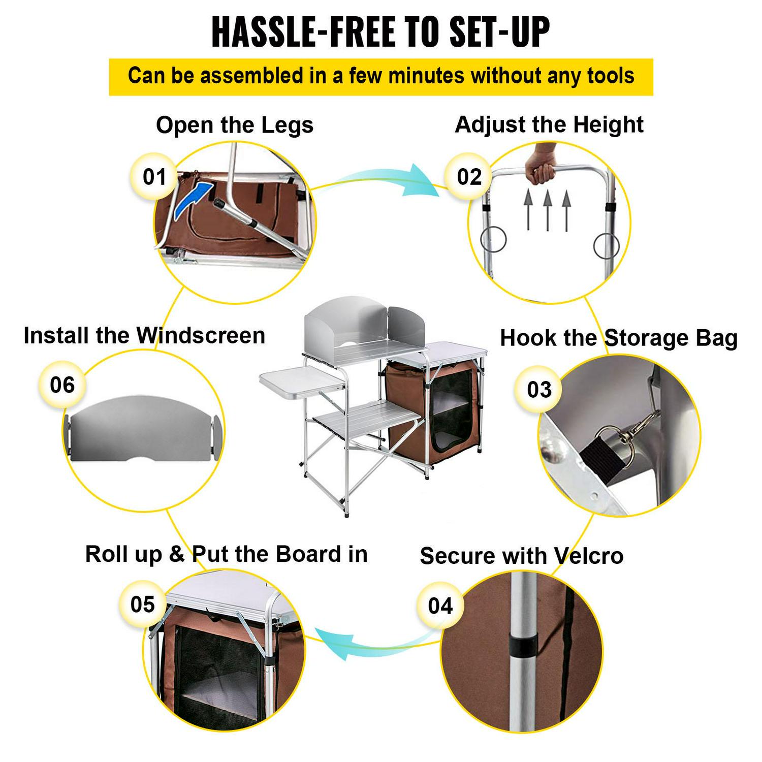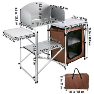 VEVOR Camping Kitchen Station, Aluminum Portable Folding Camp Cook Table with Windshield, Storage Organizer and 4 Adjustable Feet, Quick Installation for Outdoor Picnic Beach Party Cooking, Brown