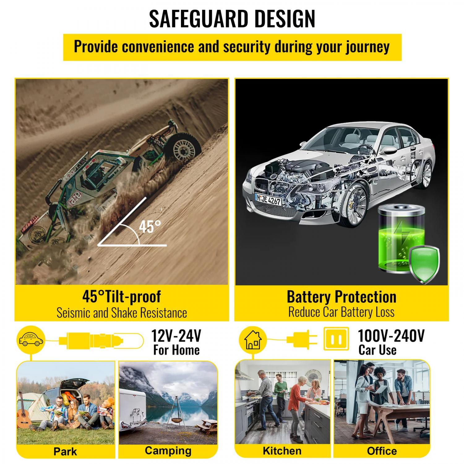 The three-layer battery protection can prevent the refrigerator from depleting the vehicle’s battery. It is designed to be low noise and ensure you a good sleep after driving for a long time. The fridge can also be kept stable by tilting 45°.