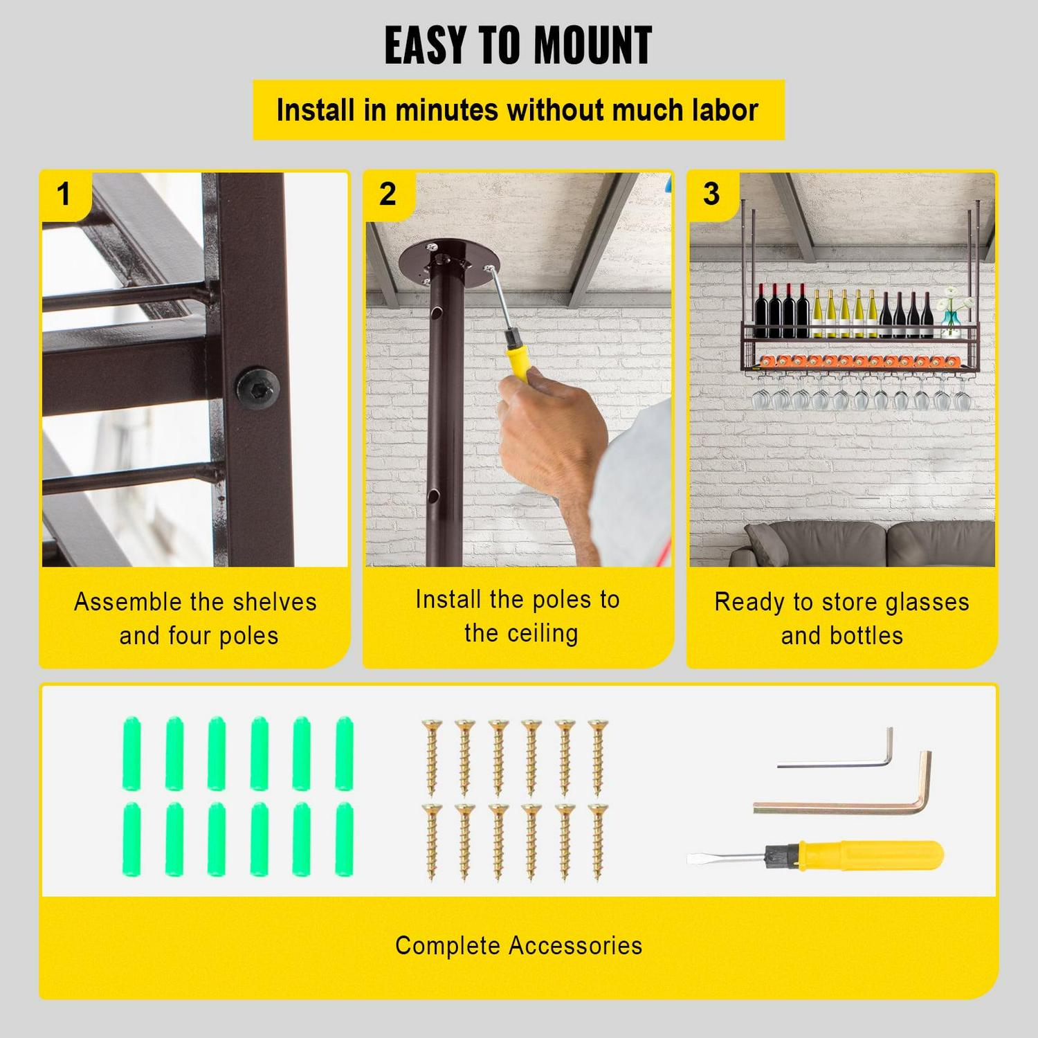 – Convenient Installation: The simplified structure allows you to assemble this wine glass rack effortlessly, saving you a lot of time and energy. It only requires you to install the four poles and the shelf by tightening the screws, and then you need to fix the whole rack to the ceiling through the pre-drilled holes on the top of the poles. After that, our hanging rack is ready to put your wine bottles and glasses.